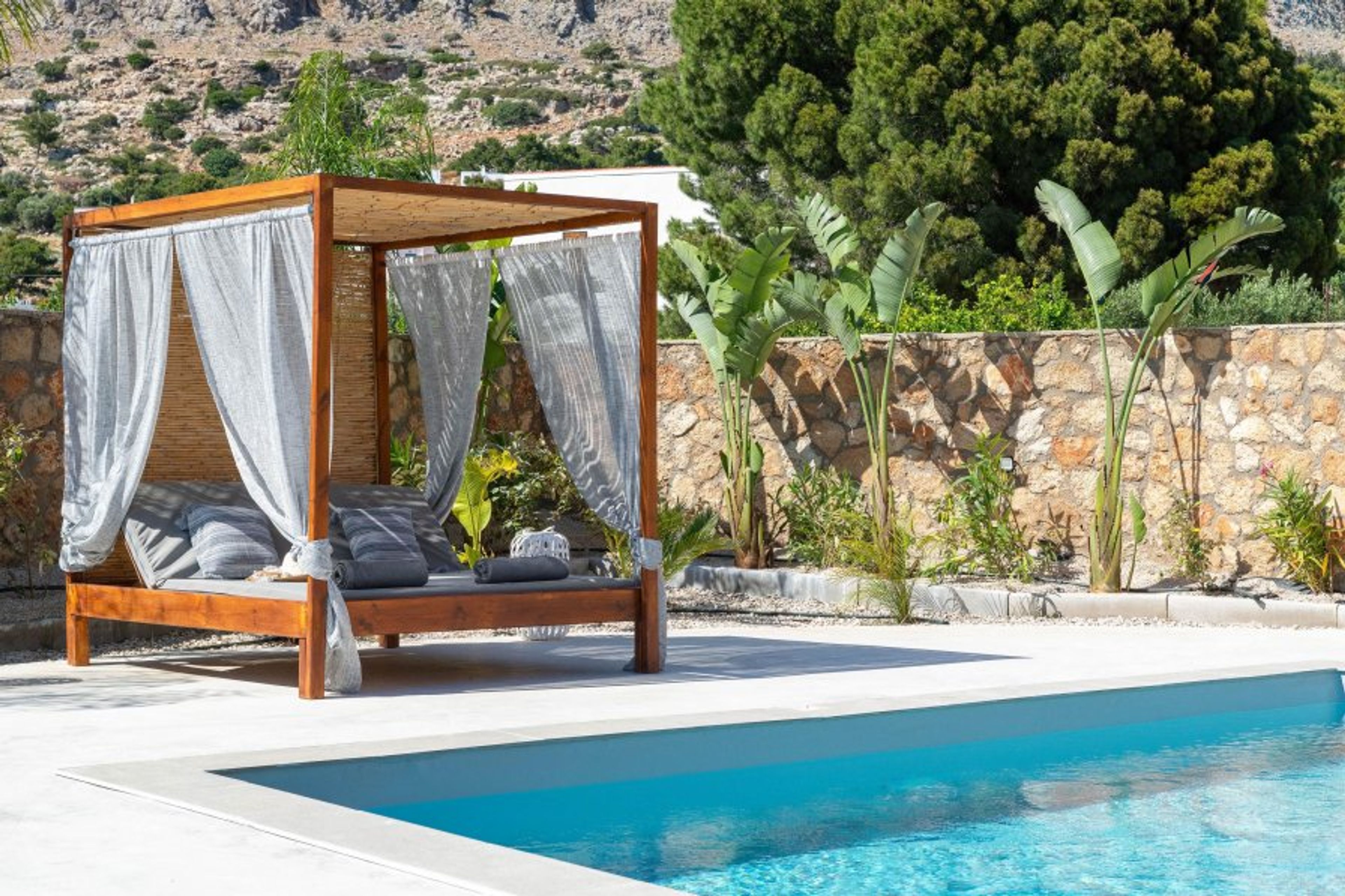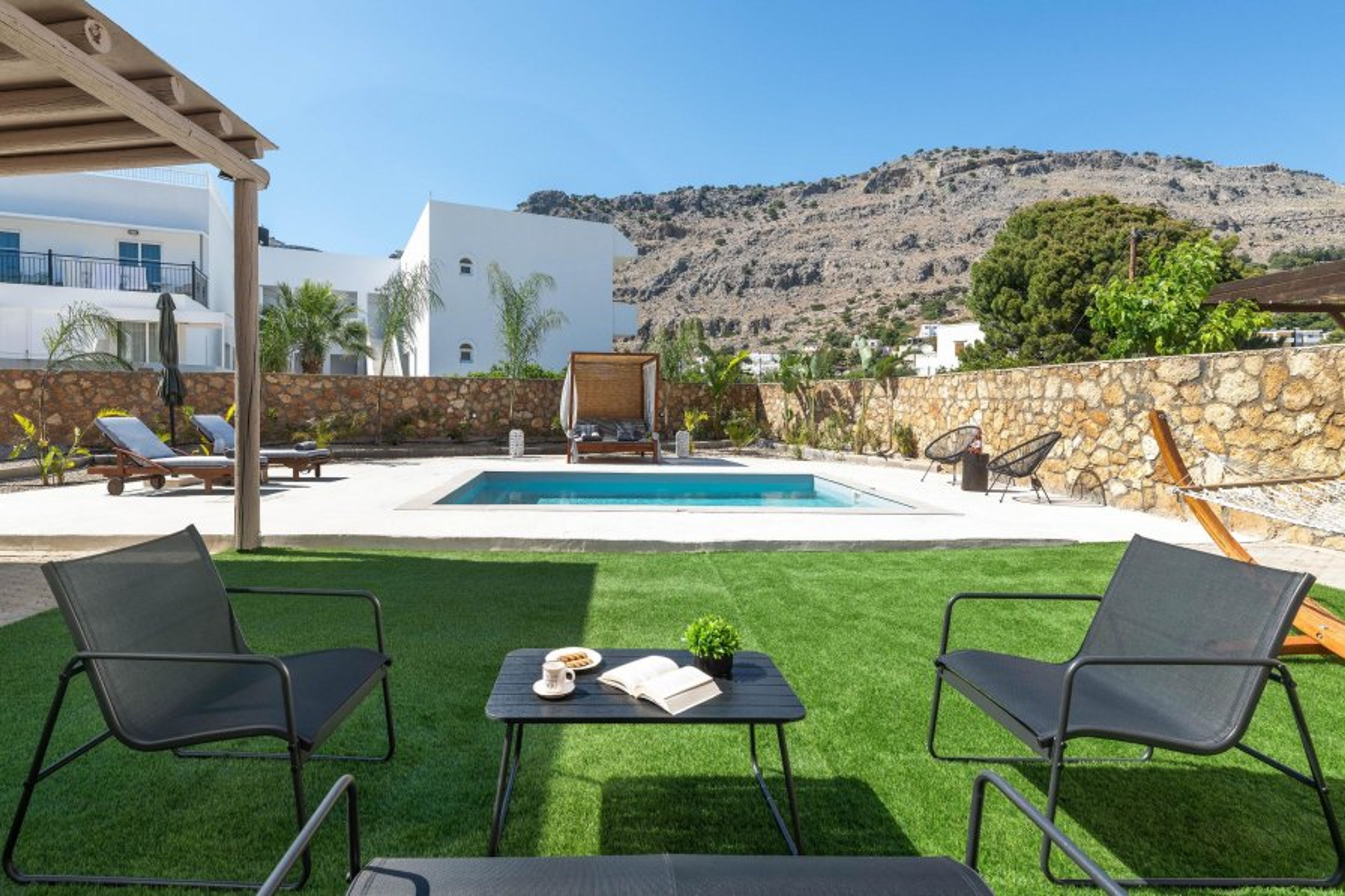 Avia Villa is located in the beautiful area of Pefkous, on the island of Rhodes, Greece. The villa is set in a quiet and peaceful spot, just a short distance from the beach, restaurants, and local shops. It’s the perfect place for guests who want to relax and enjoy the sun, sea, and nature. The popular village of Lindos is only a 10-minute drive away, where you can explore traditional streets, enjoy amazing views, and visit the famous Acropolis of Lindos. Rhodes Town and the airport are about an hour’s drive from the villa.