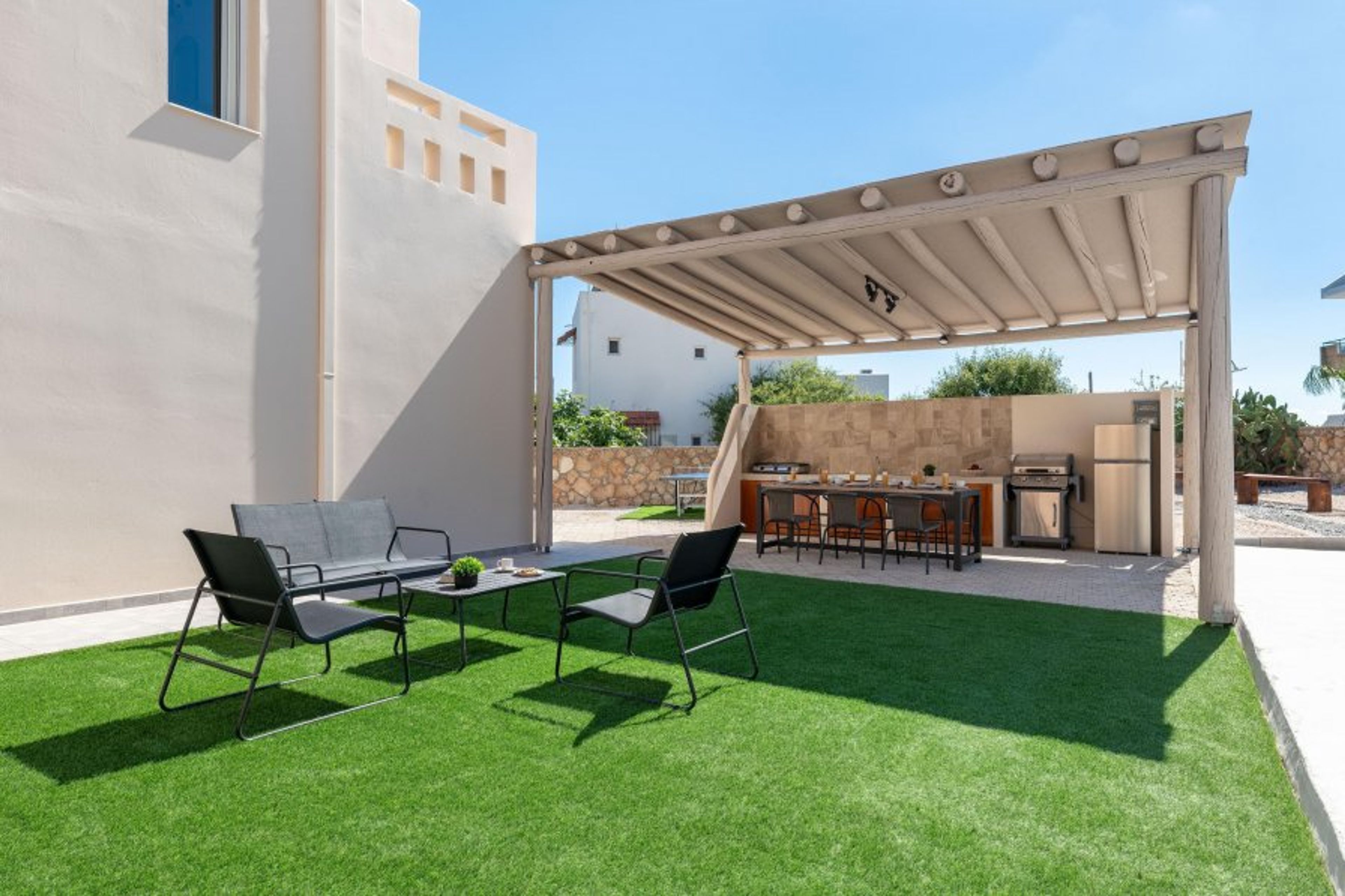 Inside, you’ll find a full kitchen with everything you need to cook. There is also a Smart TV in the bedrooms and in the living room. Outside, there is an outdoor kitchen, a dining area, and a gas BBQ, perfect for meals in the fresh air.
