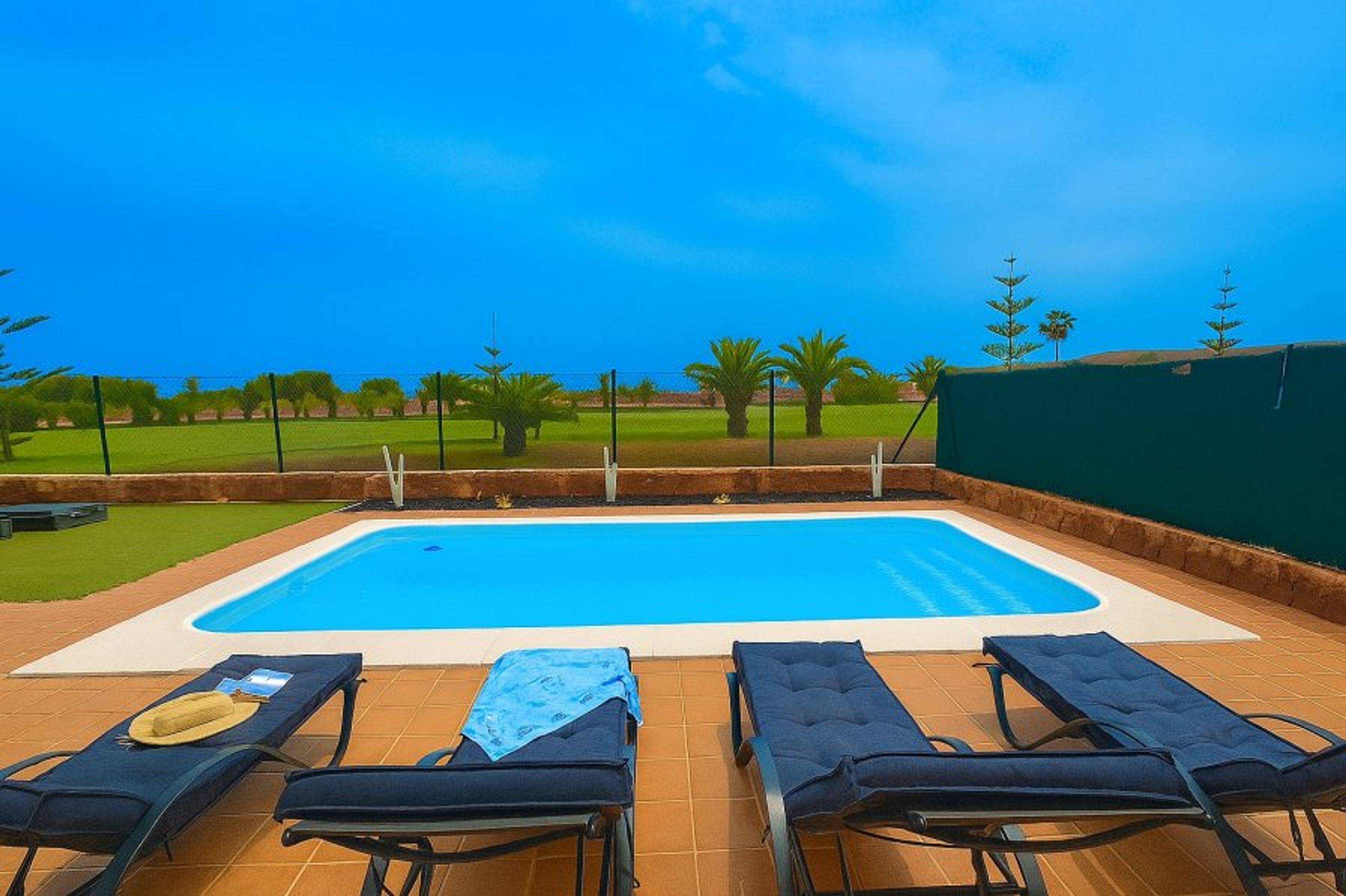 This amazing large 4 bedroom villa, right on the frontline of the famous golf course in Caleta de Fuste features ocean views and mountain views. Air conditioning is available throughout, which is chargeable at 100€ per week, payable on arrival. There are upright fans throughout the property also.
