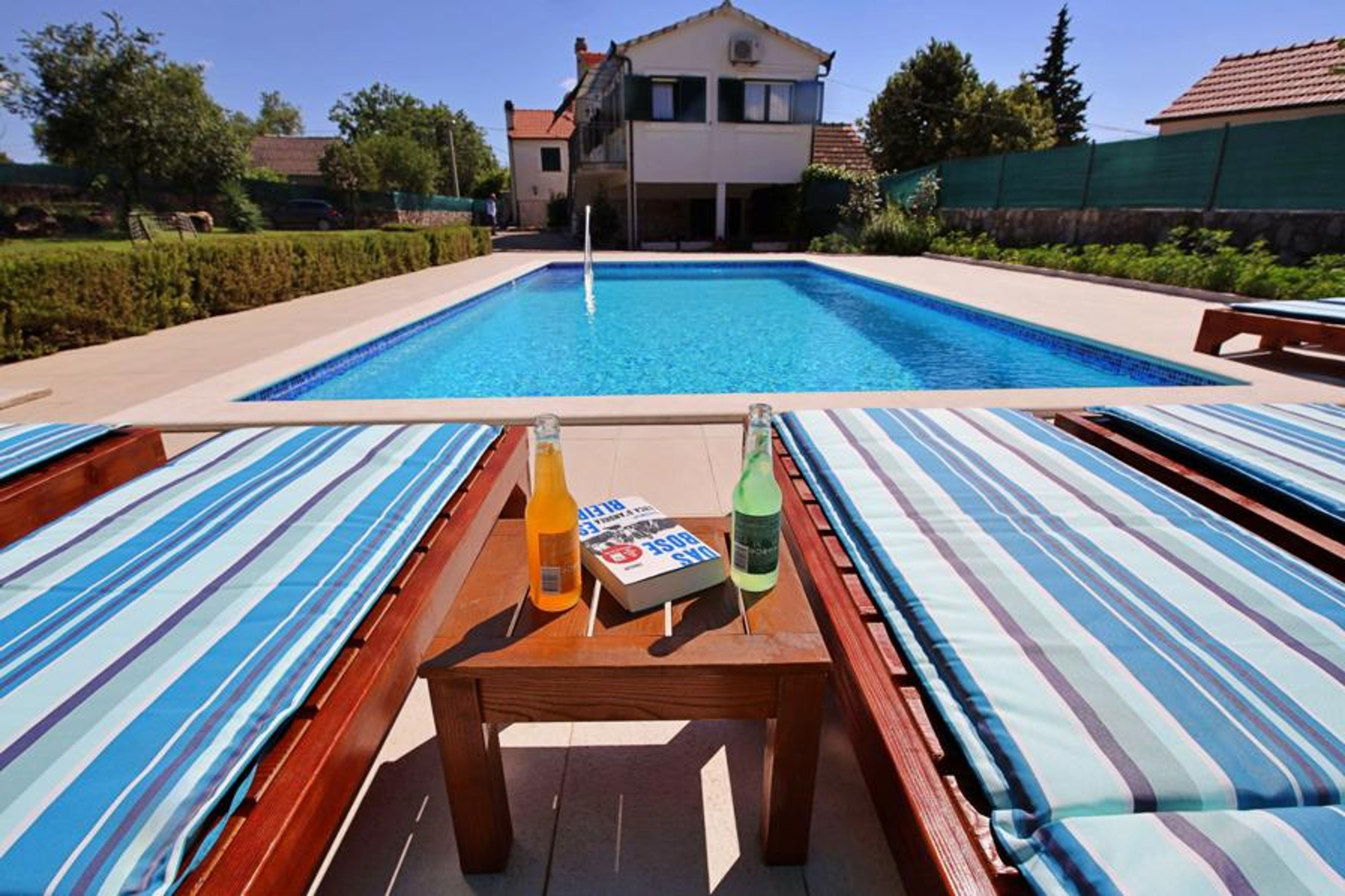 Single-family house "Bili dvori", 2 storeys. In the hamlet Čaporice 3 km from the centre of Trilj, in a quiet, sunny position, 35 km from the sea. Private: property 2'000 m2 (fenced), lawn 600 m2, swimming pool angular (9 x 4 m, 41 m2, depth 150 cm, seasonal availability: 27.Apr. - 28.Sep.) with internal staircase. Outdoor shower, terrace (120 m2), garden furniture, barbecue house, children's playground (swing). In the house: internet access, table football, washing machine. Available: bicycles (6). Parking (for 3 cars) at the house on the premises. Shop 3 km, restaurant 3 km, bus stop 400 m, pebble beach 35 km. Tennis 35 km, riding stable 3 km, walking paths from the house 100 m, cycle lane 150 m. Nearby attractions: Rafting Cetina 3 km.
