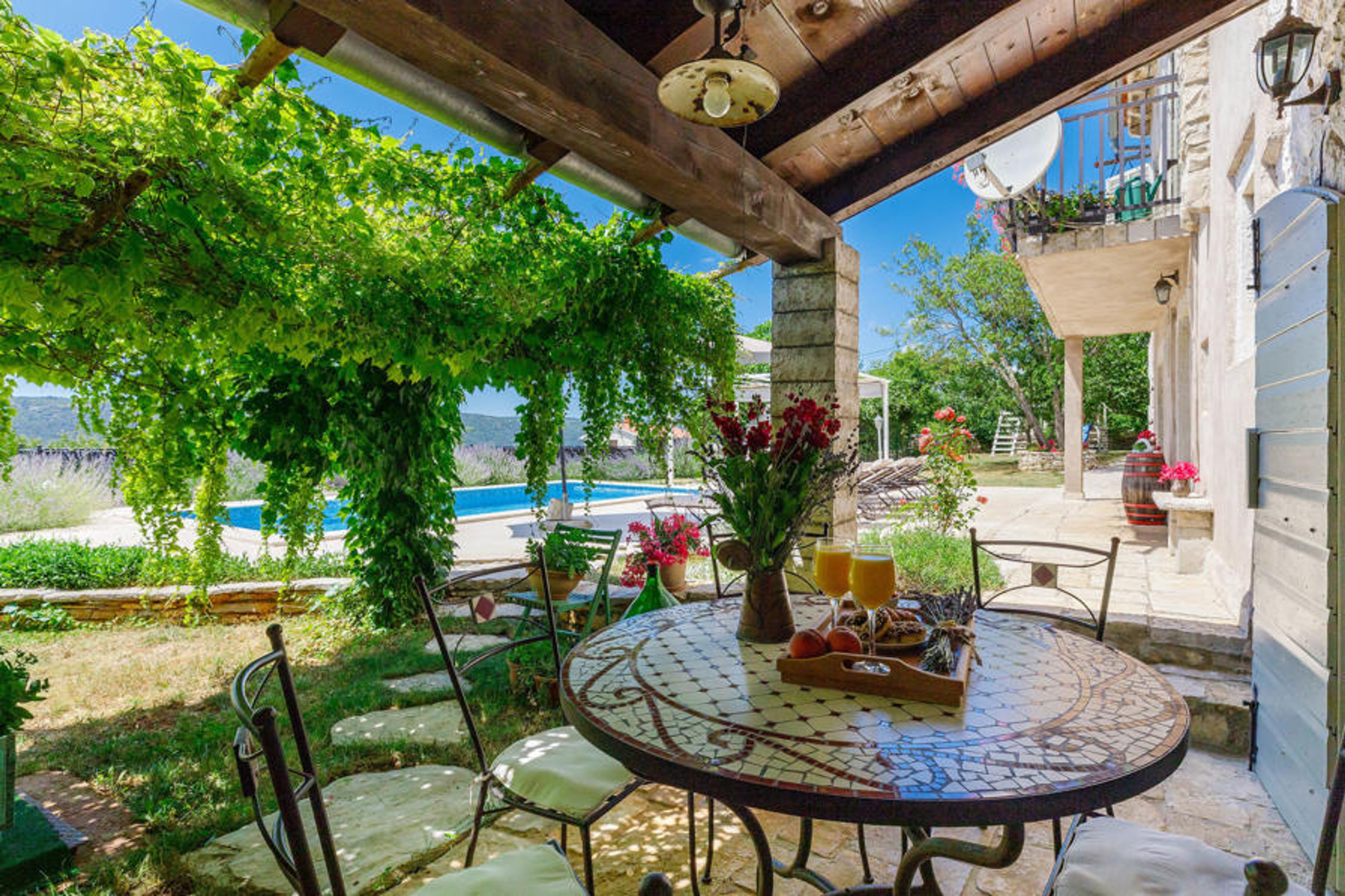Semi-detached house "Villa Domenica", 2 storeys, from the 18th century, renovated. 1.1 km from the centre of Trget, outside the resort, in a quiet, sunny, elevated position, 900 m from the sea, 900 m from the beach, in a cul-de-sac. Private: property 700 m2, garden with wildlife garden, swimming pool angular (8 x 3 m, depth 140 cm, seasonal availability: 11.Apr. - 24.Oct.) with internal staircase. Outdoor shower, terrace (10 m2), garden furniture, barbecue, children's playground (swing). In the house: internet access, washing machine. Parking (for 3 cars) at the house on the premises. Shop 1.1 km, restaurant 600 m, bus stop 6.6 km, pebble beach 900 m. Available: box for dogs (included in the price).