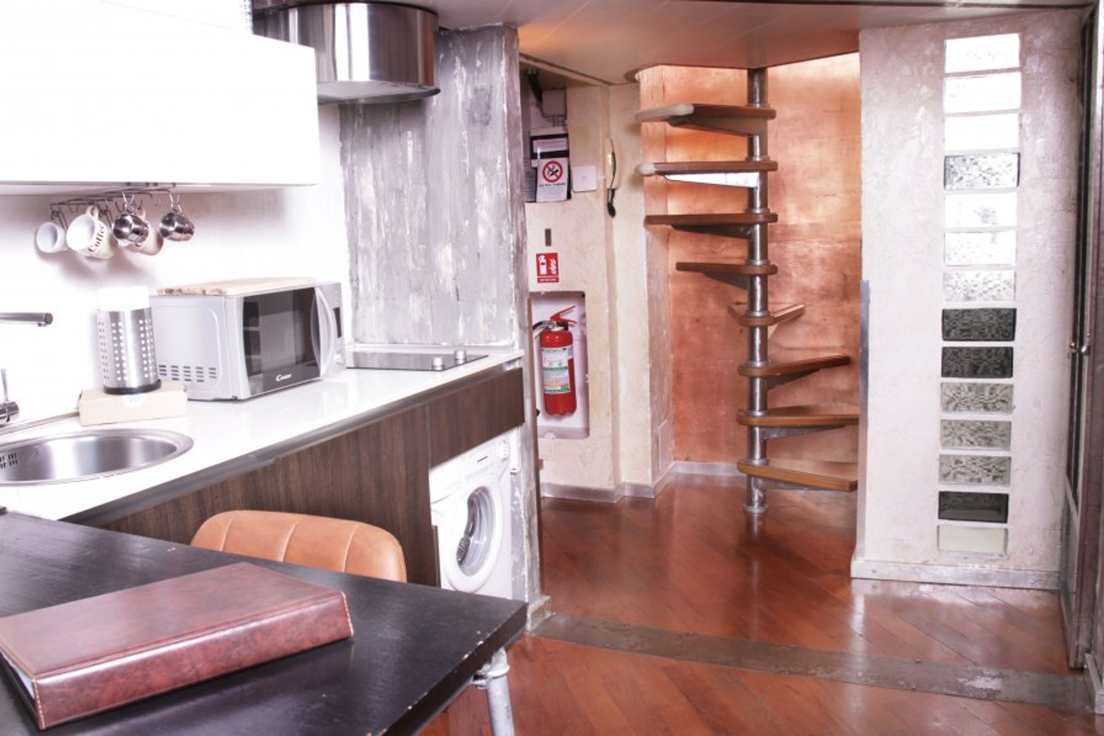 The bright and spacious 35 sqm open-plan space is spread over two levels, featuring striking iron details, polished concrete and warm wooden accents, and a stunning feature wall adorned with gold leaf to create a relaxing and unique atmosphere. The mezzanine houses a cozy double bed beneath exposed iron beams, complemented by a comfortable sofa in the living area.