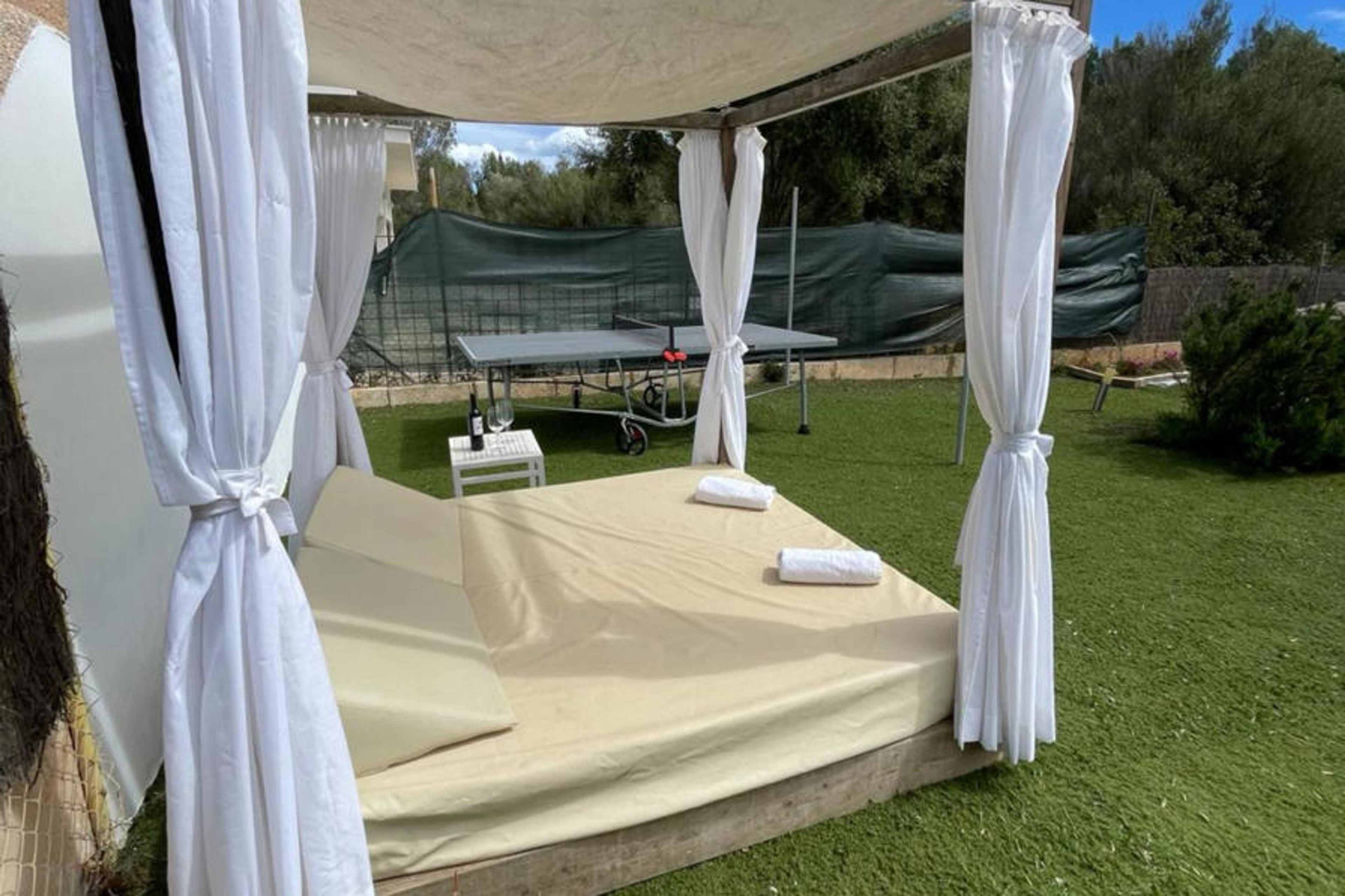 Enchanting little house near the sea, with a maximum capacity of 2 persons in s’Estanyol d’Artà. Outside you will find yourself in the middle of the countryside, in a beautiful garden where you can enjoy the Majorcan sun and relax in the jacuzzi with water at room temperature. Next to the house there is a corner with armchairs and a sofa where you can have a vermouth in the middle of the day or contemplate the stars at night. It also includes a Balinese bed for outdoor enjoyment. At the entrance is the outdoor dining area and next to it the barbecue area to prepare great grilled meats and vegetables. The plot is fenced and there are neighbours in the surrounding area.