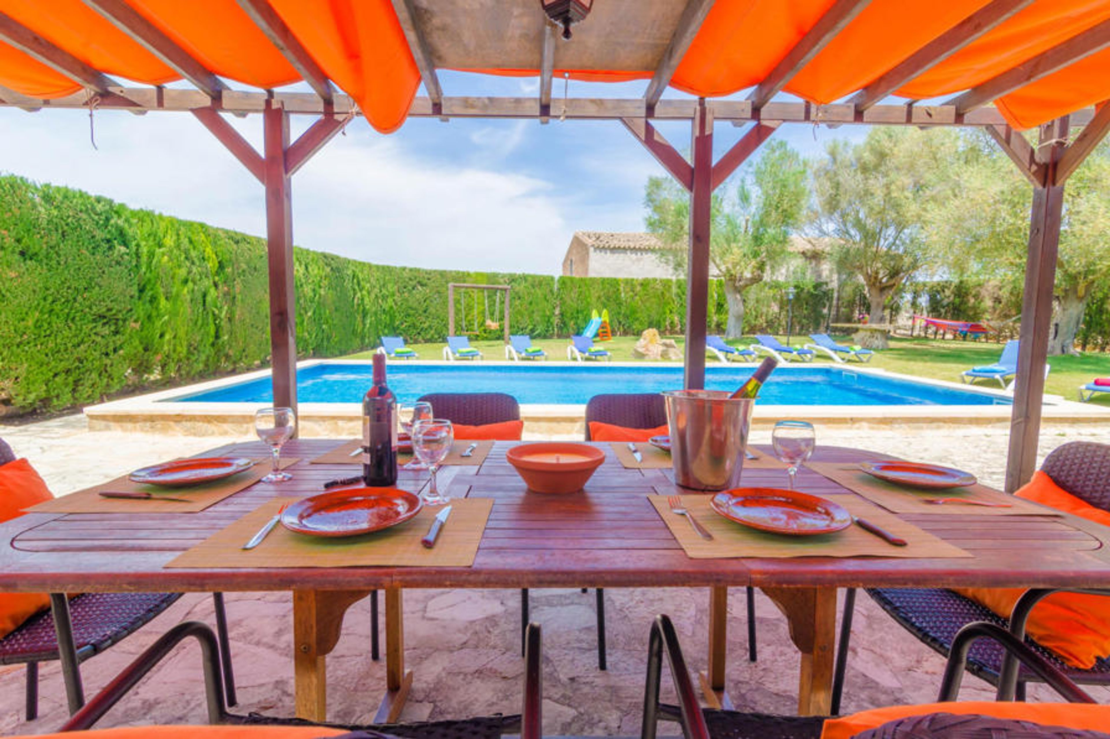 Beautiful estate with private pool in Vilafranca de Bonany, ideal for 8 guests. Enjoy an unforgettable Majorcan summer in this estate dated back to the 19th Century! The well-kept exteriors feature a private, 5mx 10m chlorine pool with a depth ranging from 1.35m to 2.1m. Besides, there's an exterior shower if you fancy taking a shower before and after swimming in the pool. The pool is surrounded by a garden with eight sun loungers and a nice terrace with sunshade. There's a barbecue area if you fancy cooking - surprise your loved ones with tasty meat and grilled vegetables! Challenge friends and family at the ping-pong table while children enjoy the playground in the garden. The plot is fenced and there are no direct neighbors so you'll enjoy privacy.