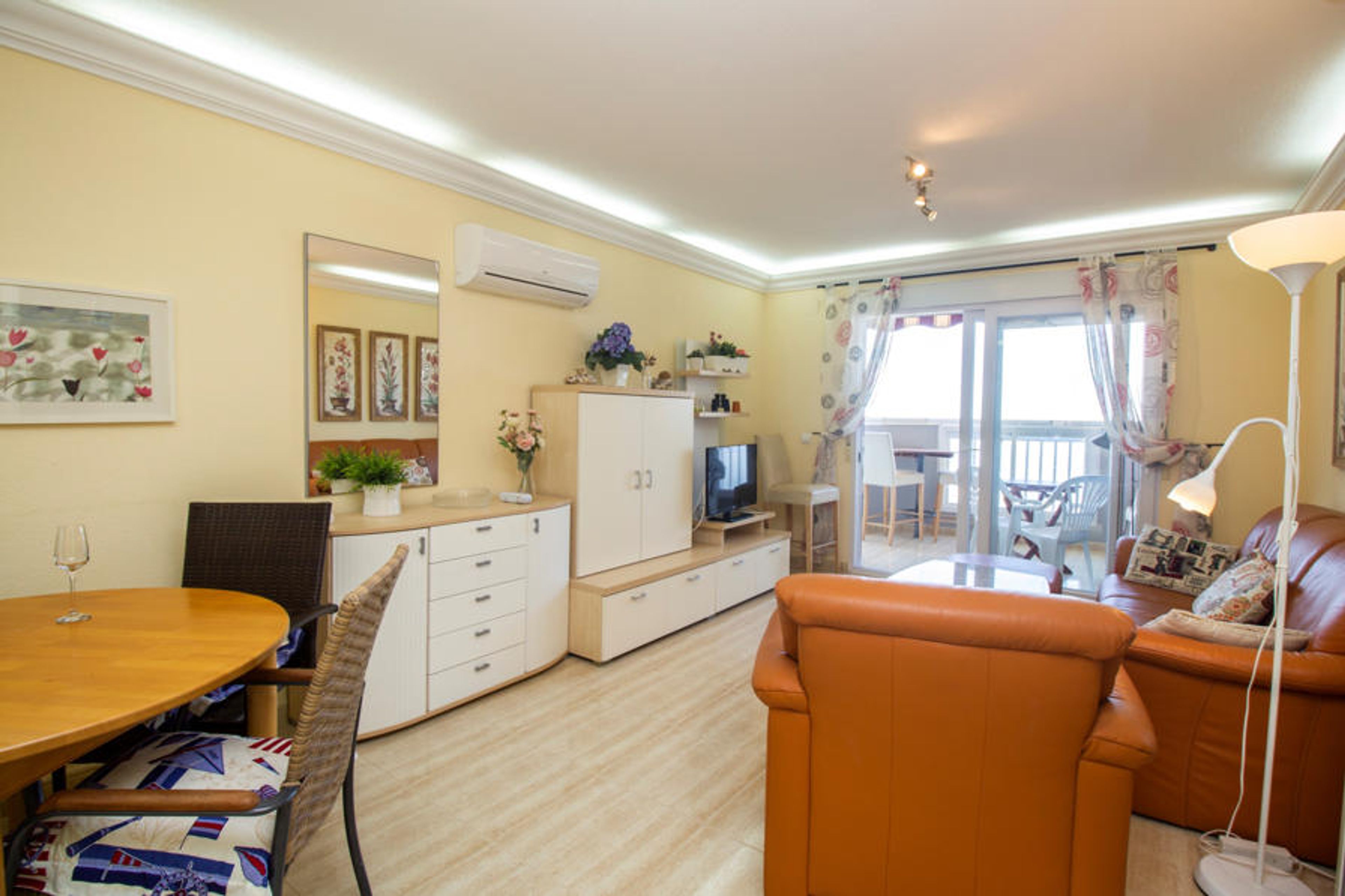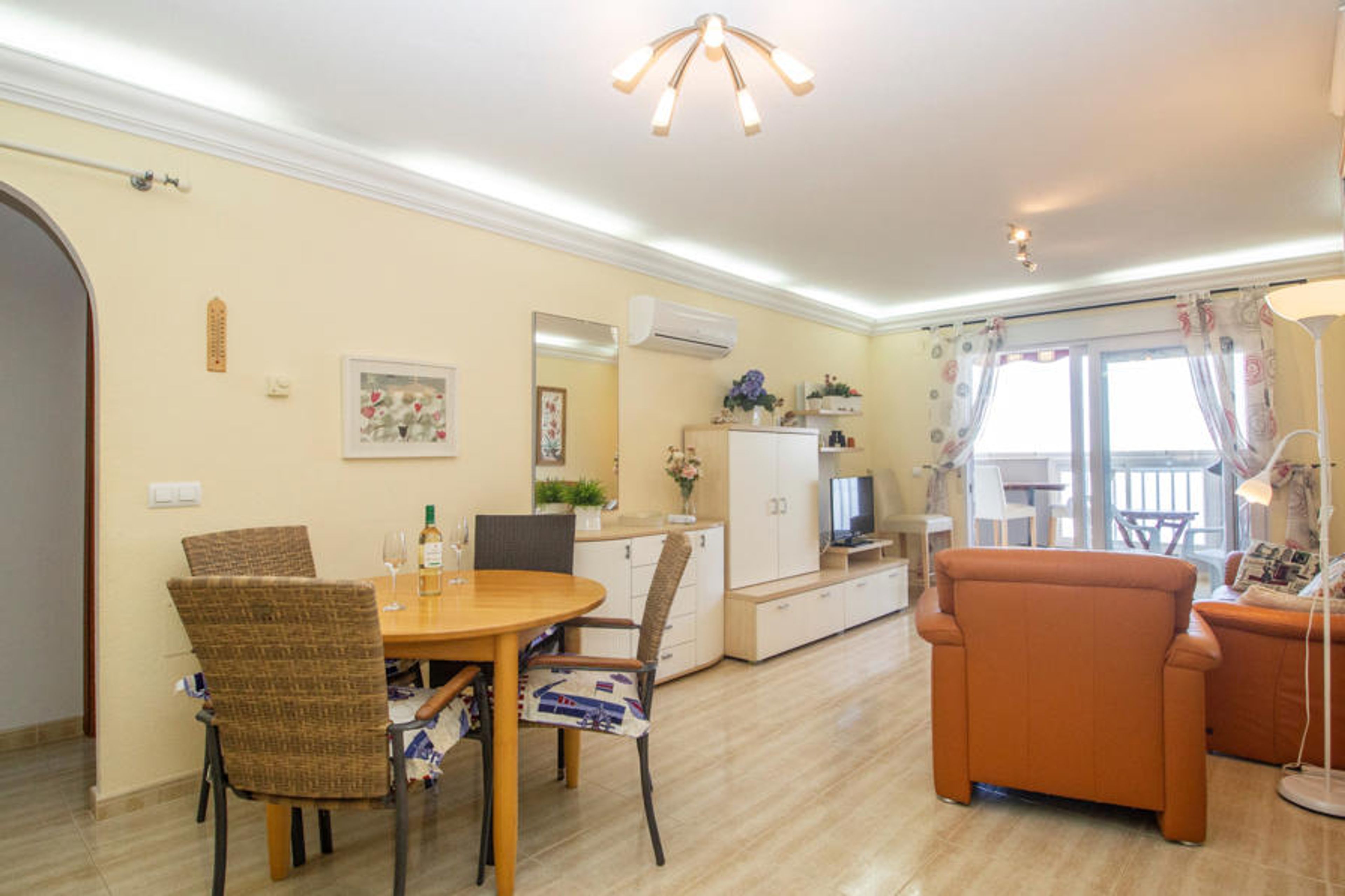 The living room, spacious and bright, has air conditioning and features a dining area and a television area from which access is gained to a wide glazed terrace with beautiful views towards the Tomás Maestre Port and the Mar Menor.