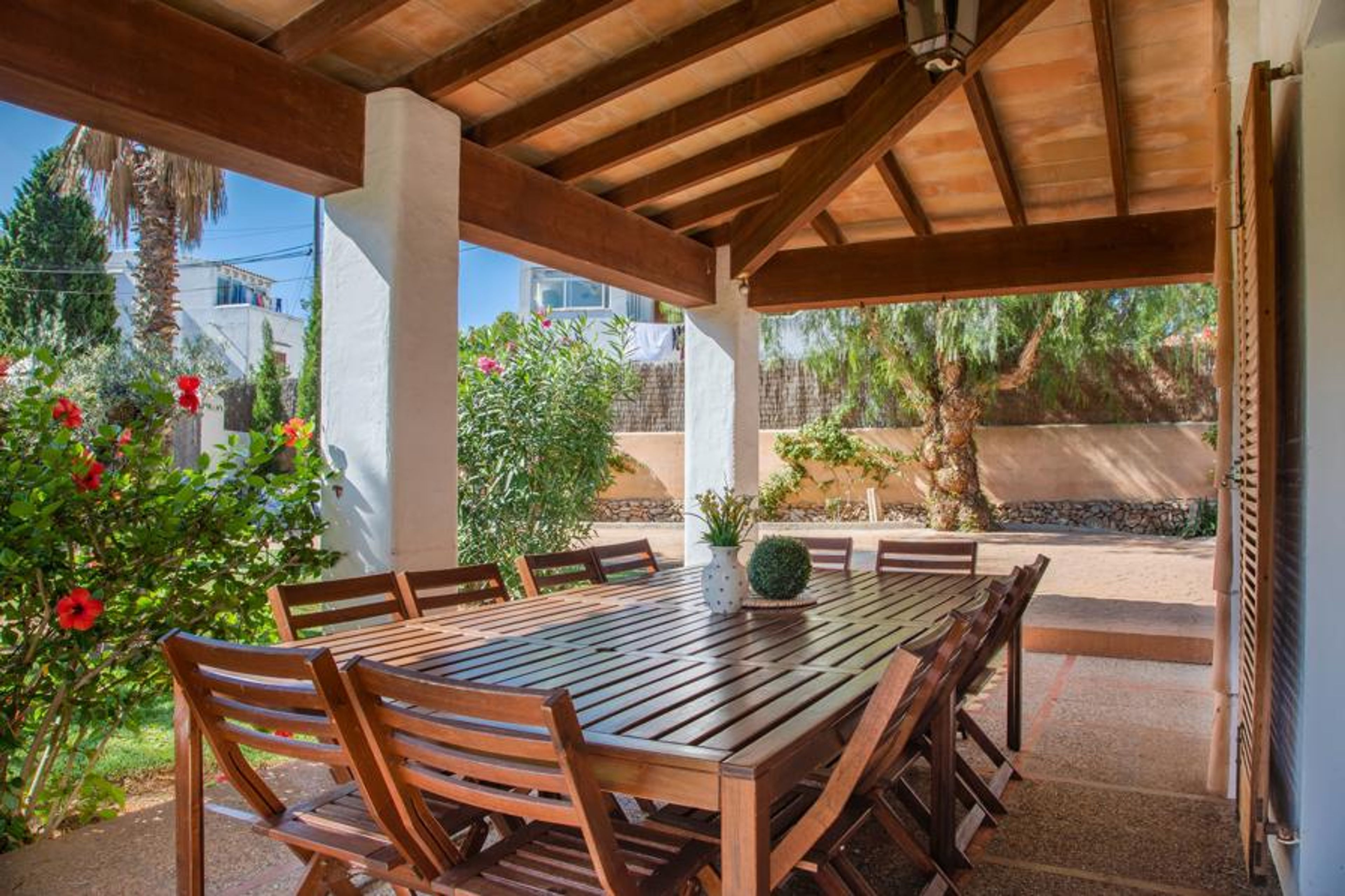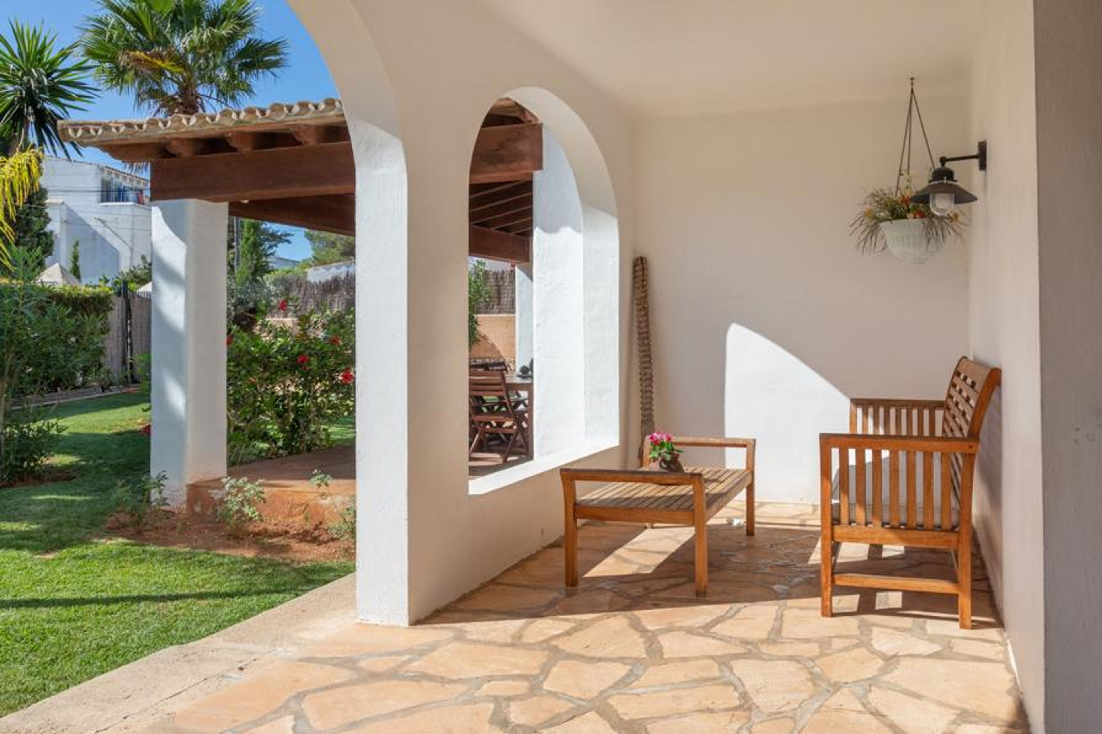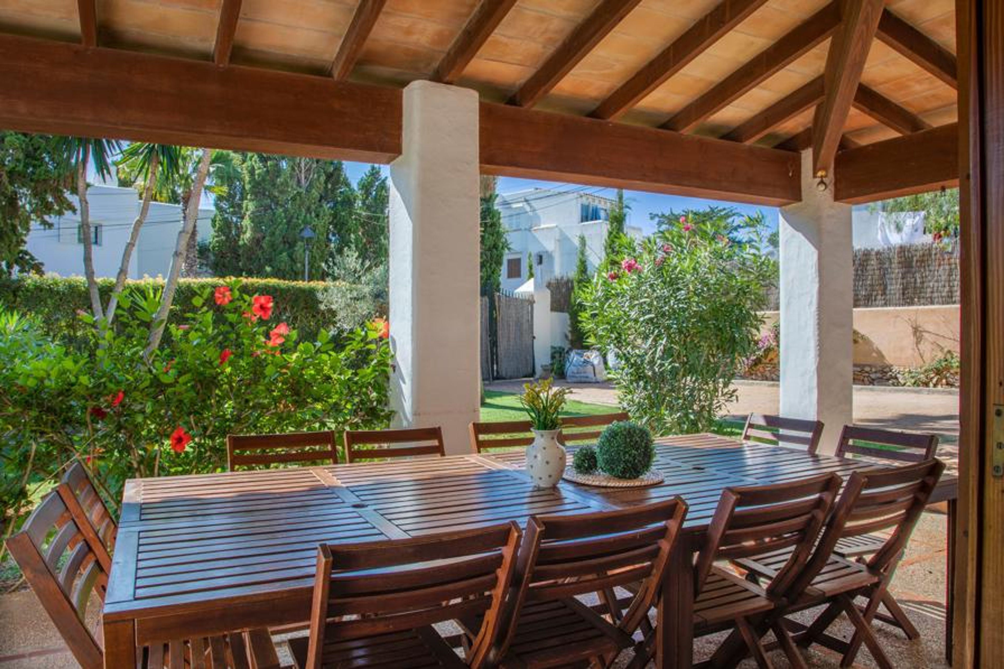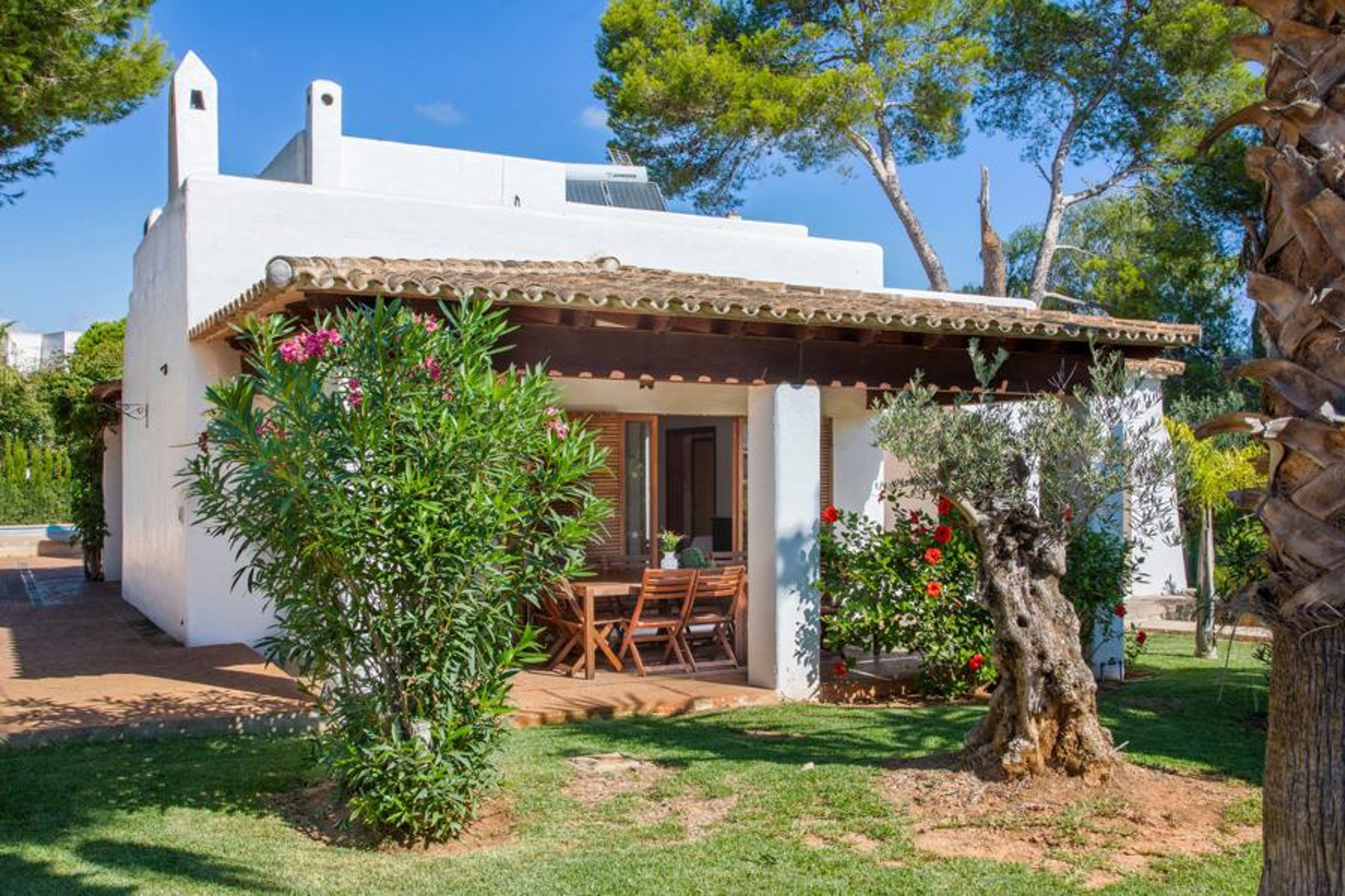 Villa Esmeralda Blanca in Cala D'Or is a luxurious Ibiza-style villa with six bedrooms, a private pool, mature gardens, and easy access to the beach, local amenities, and entertainment, offering the perfect Mediterranean retreat.