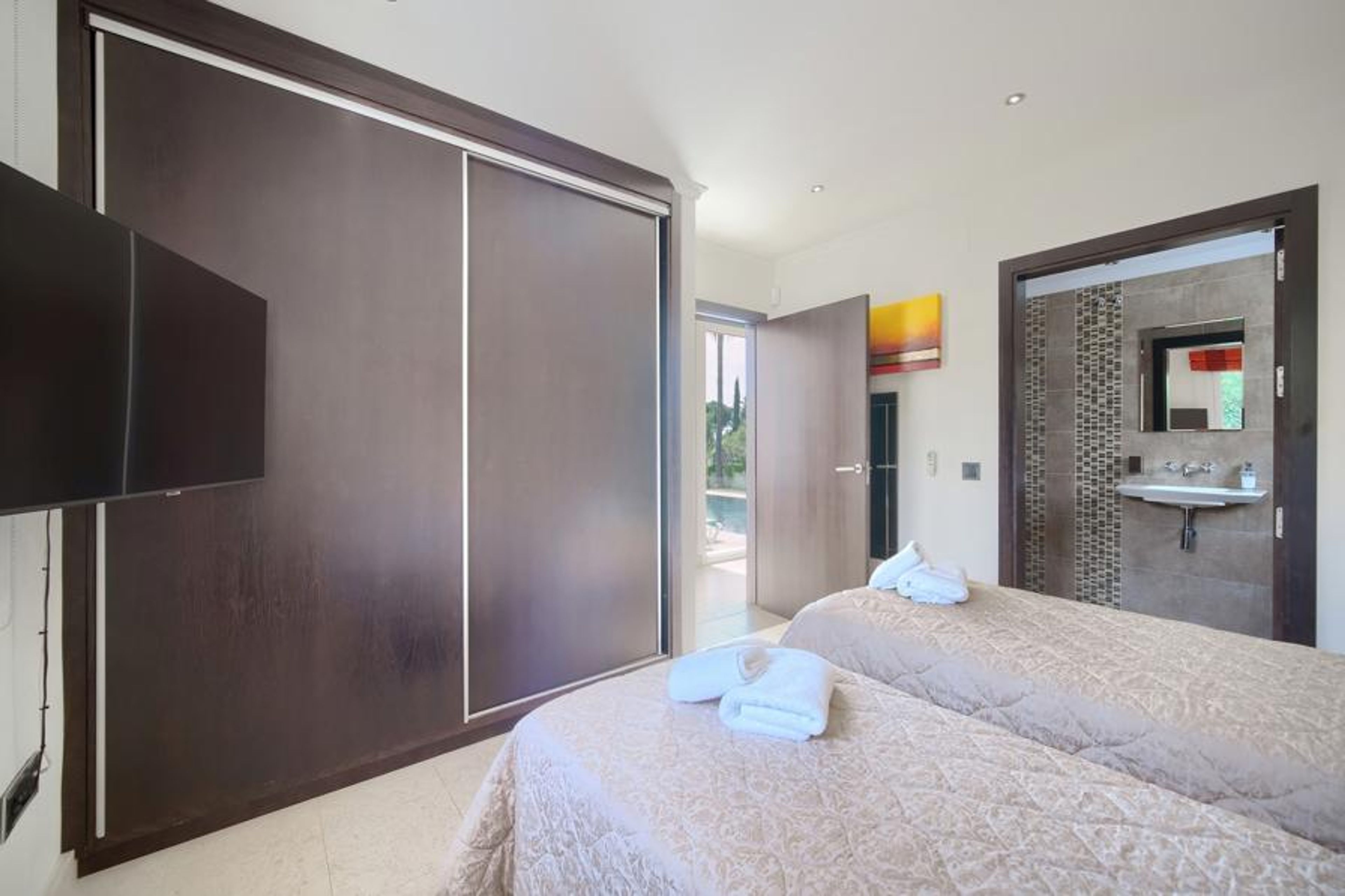 Moving to the first floor, you will find two further bedrooms. The master bedroom features a large double bed and an en-suite bathroom with a hot tub. Additionally, the master bedroom offers direct access to a private terrace, which is the perfect spot for enjoying your morning coffee in the sunshine. The second bedroom on this level is spacious and offers twin beds.