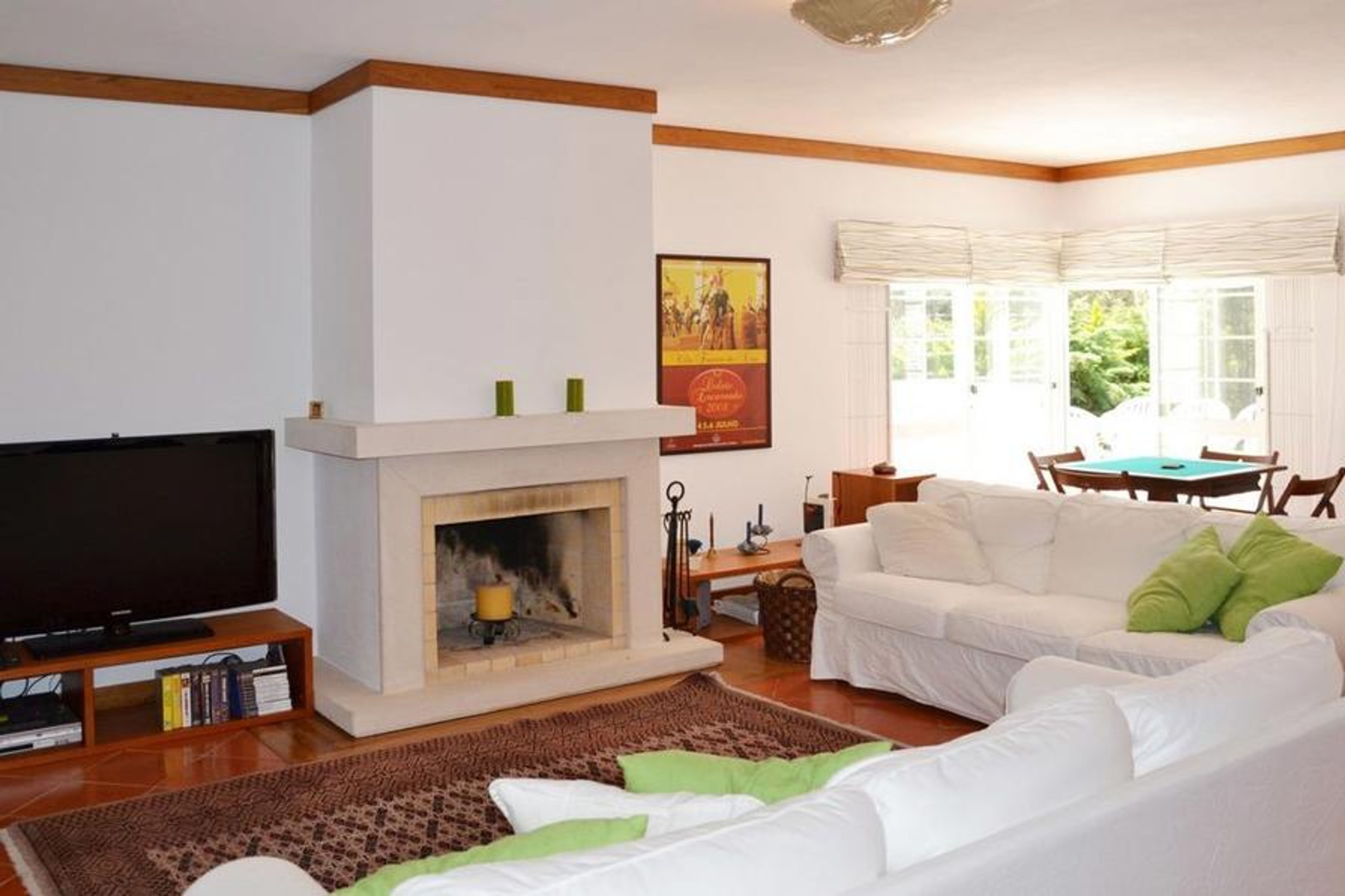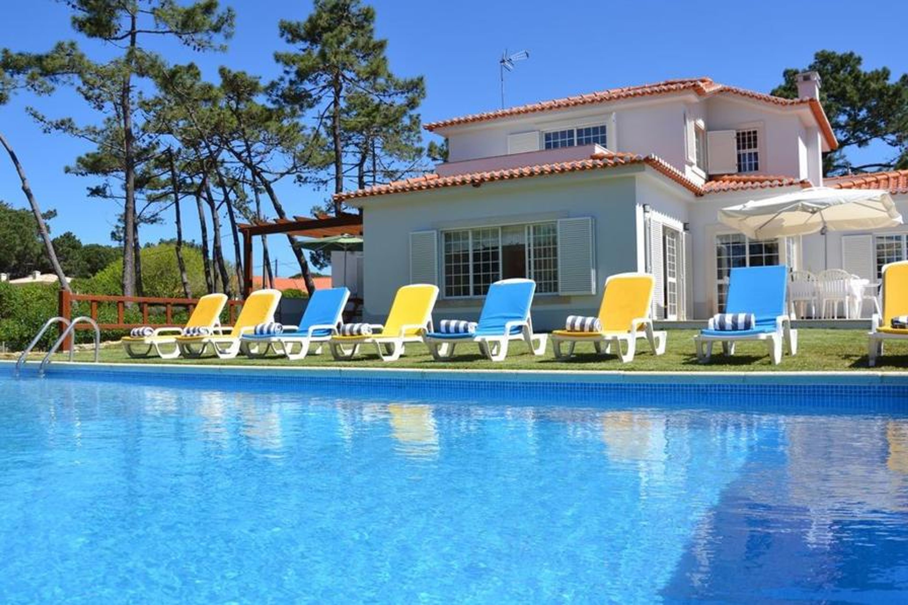 The villa is situated 15 km from Sintra, and 20 km from the cosmopolitan Cascais, with its marina, entertainment, shopping, beaches, restaurants, coffee shops, delightful terraces by the sea, not to mention the buzz of a very active nightlife. Estoril, that has the biggest casino in Europe, is only 22 km away. Lisbon, the capital with its cosmopolitan atmosphere, monuments, restaurants and Fado, is only 40 min. away. Guincho, with its surrounding natural park is highly recommended for beach & sport holidays. But along the coast the choice of other beaches is endless. Guincho is famous for water sport activities, white sandy family beaches, all within a 20 min drive. The bus stop is just 500 m away from the villa (Sintra and Cascais) and the railway station is 15 km away.