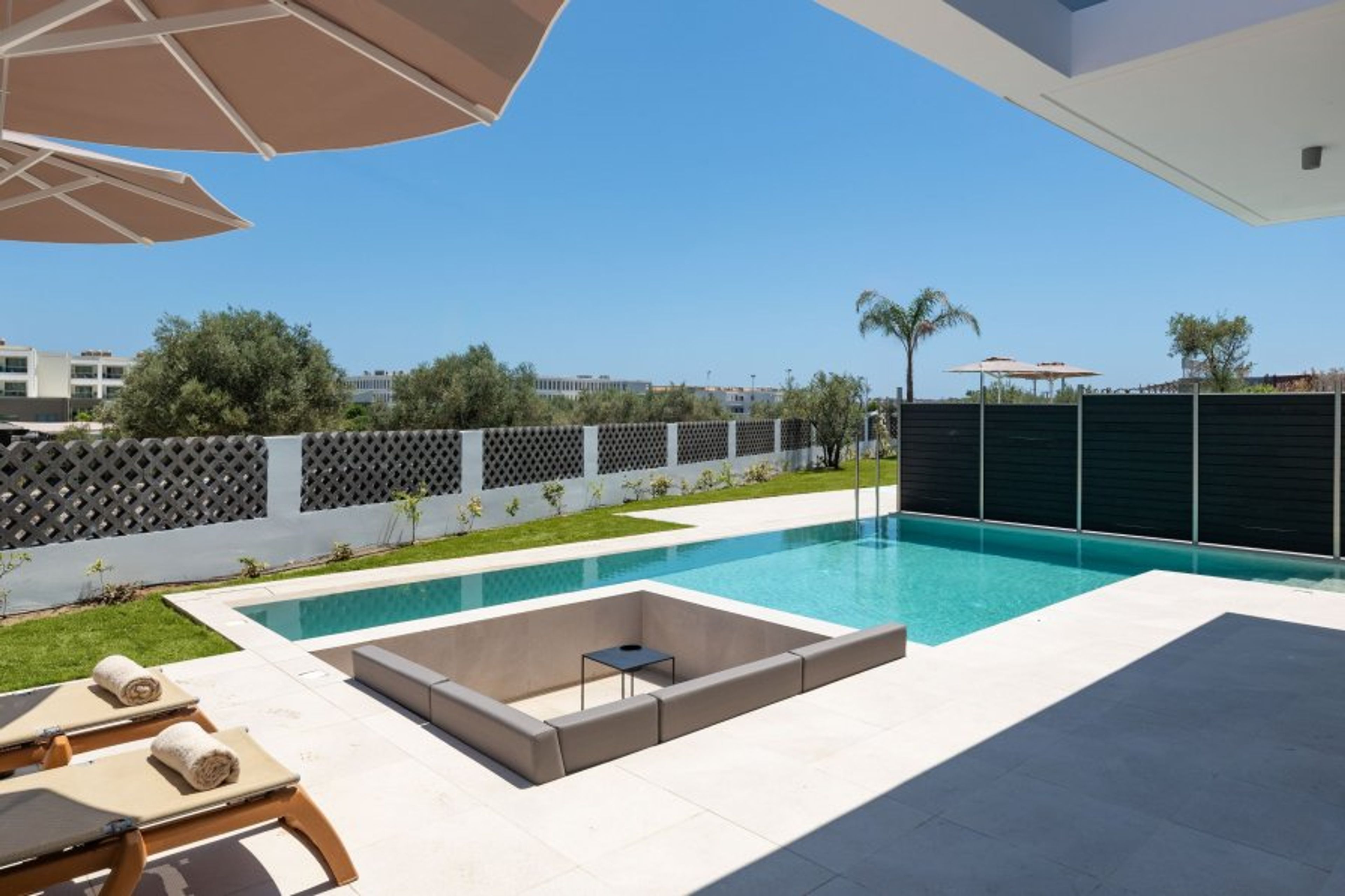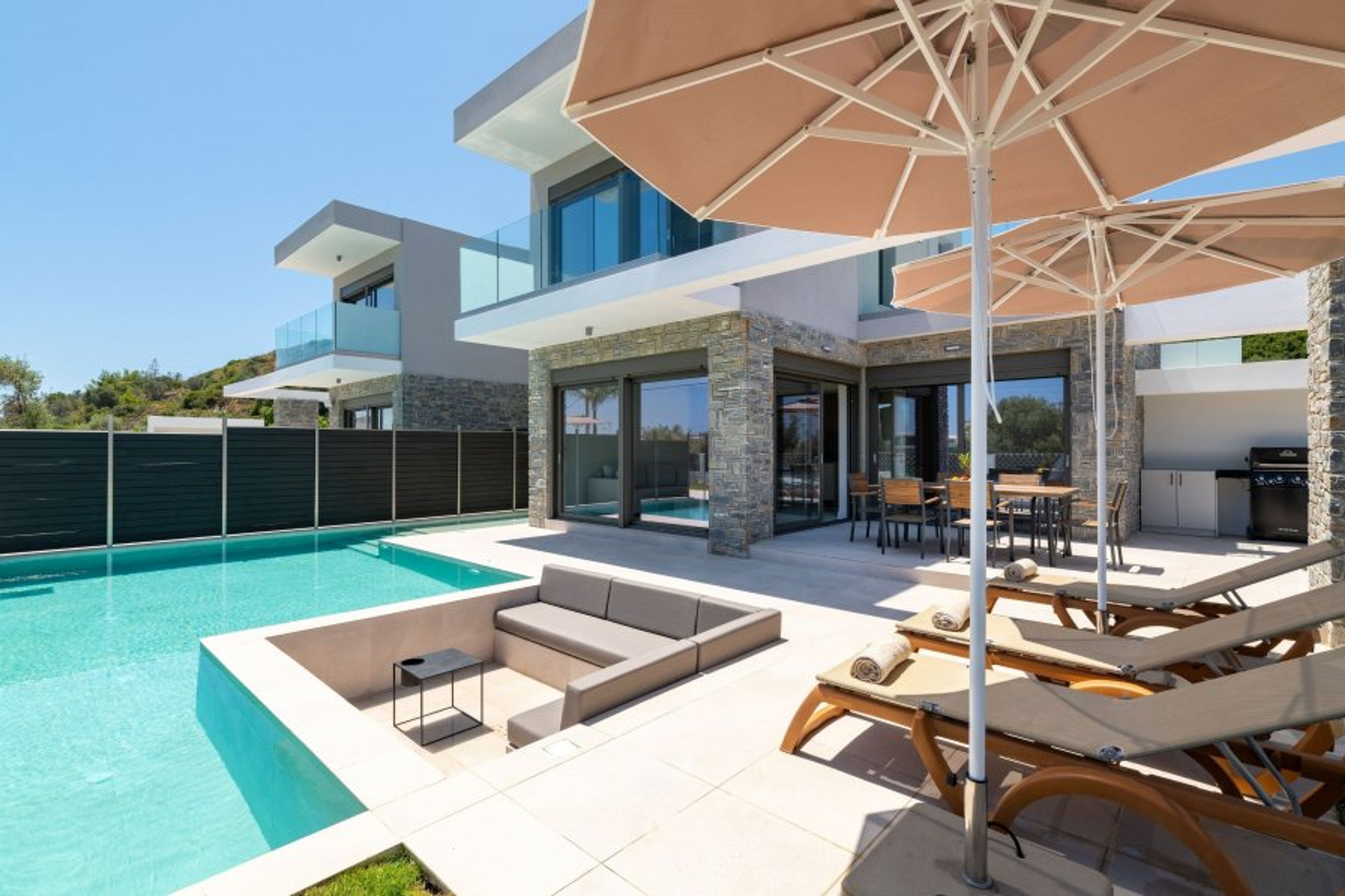 Outside, each villa boasts its own private swimming pool. Next to the pool, there are built-in sofas set at a lower level than the yard—almost at the same depth as the pool, but outside the water—creating a unique and cozy lounge area. The outdoor space also includes a lush garden with an outdoor kitchen, gas BBQ, comfortable dining and sitting areas, sunbeds, parasols, and garden furniture—everything you need to enjoy the sun and fresh air in complete privacy. Private parking is available with space for up to four cars, adding to your convenience.