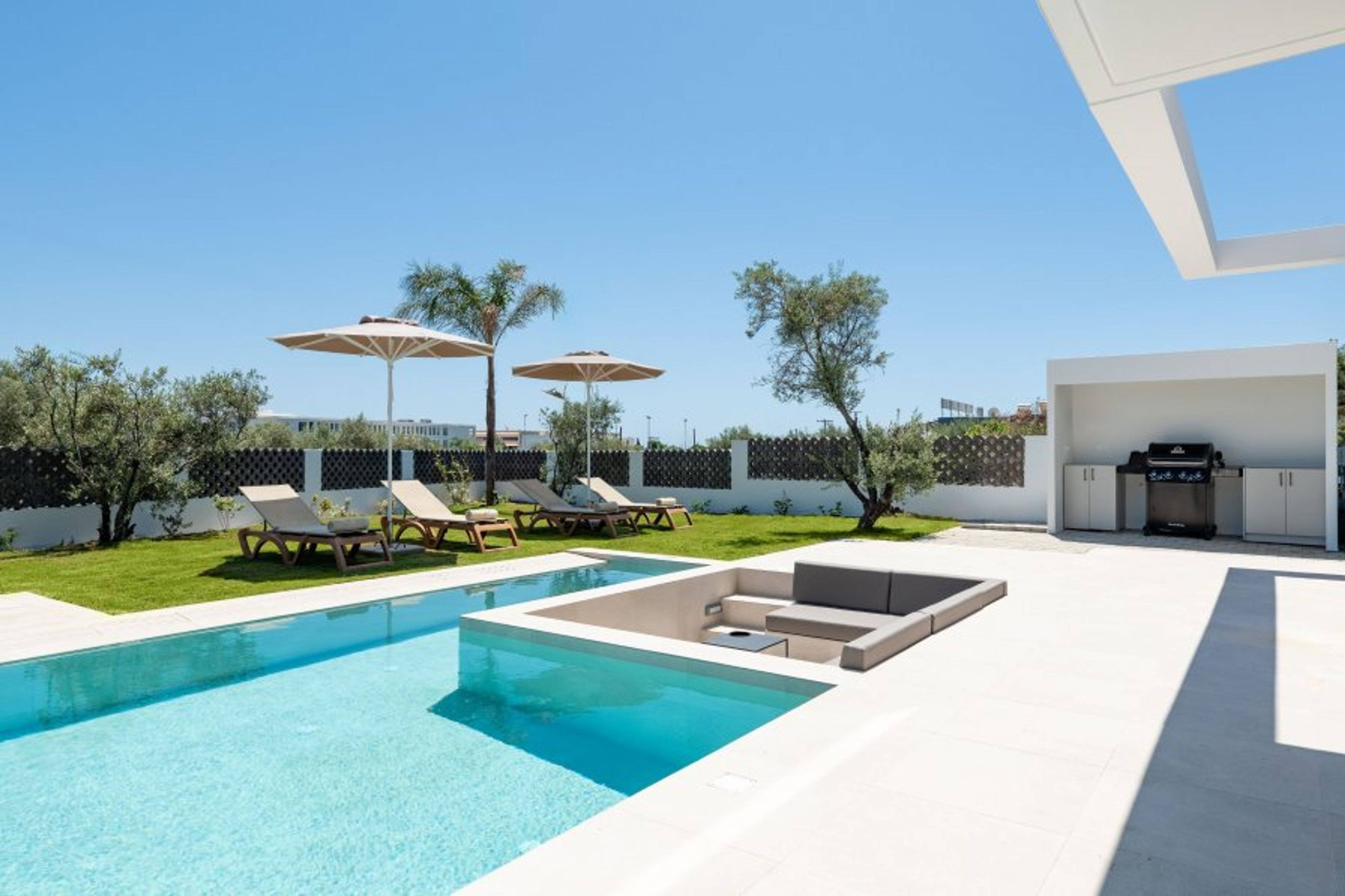 Outside, each villa boasts its own private swimming pool. Next to the pool, there are built-in sofas set at a lower level than the yard—almost at the same depth as the pool, but outside the water—creating a unique and cozy lounge area. The outdoor space also includes a lush garden with an outdoor kitchen, gas BBQ, comfortable dining and sitting areas, sunbeds, parasols, and garden furniture—everything you need to enjoy the sun and fresh air in complete privacy. Private parking is available with space for up to four cars, adding to your convenience.