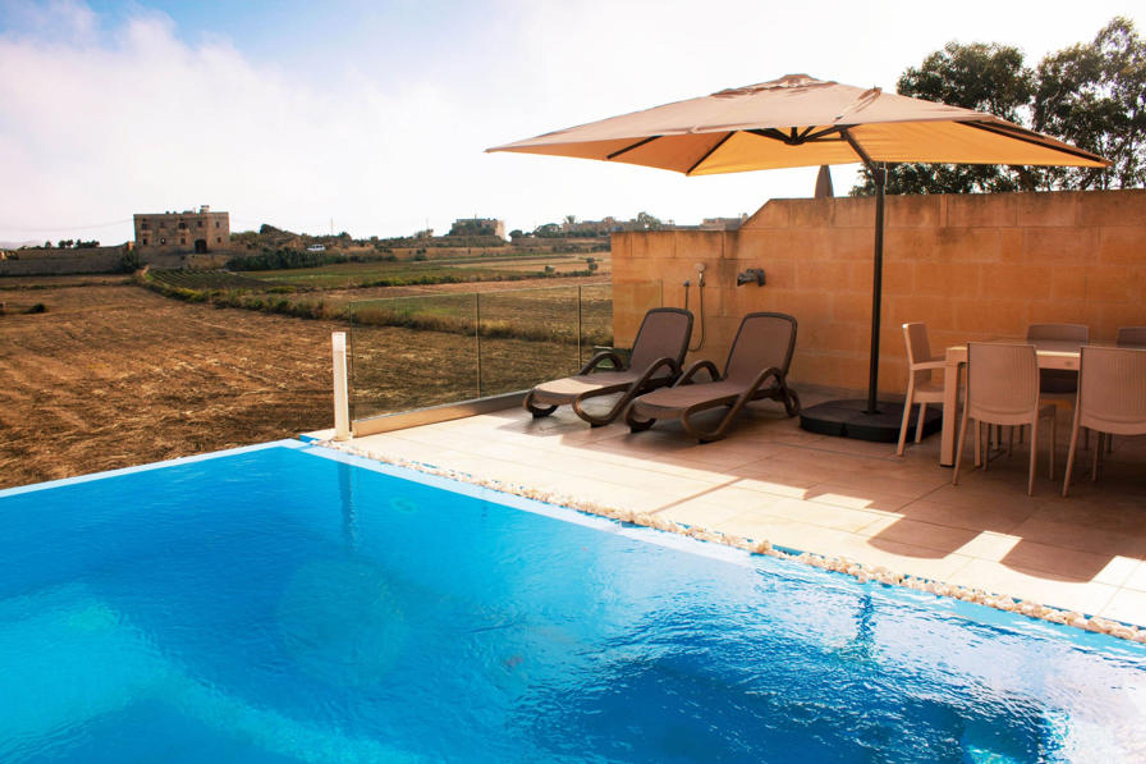The property is quietly situated on the outskirts of Gharb village and provides the ideal escape for those seeking peace and tranquillity. The house is perfectly set up for outdoor living with; a sun deck, an alfresco dining area, a gas BBQ and the most inviting infinity pool. Here guests can relax and enjoy incredible views across the fields to Gharb’s beautiful Basilica Tal-Madonna.