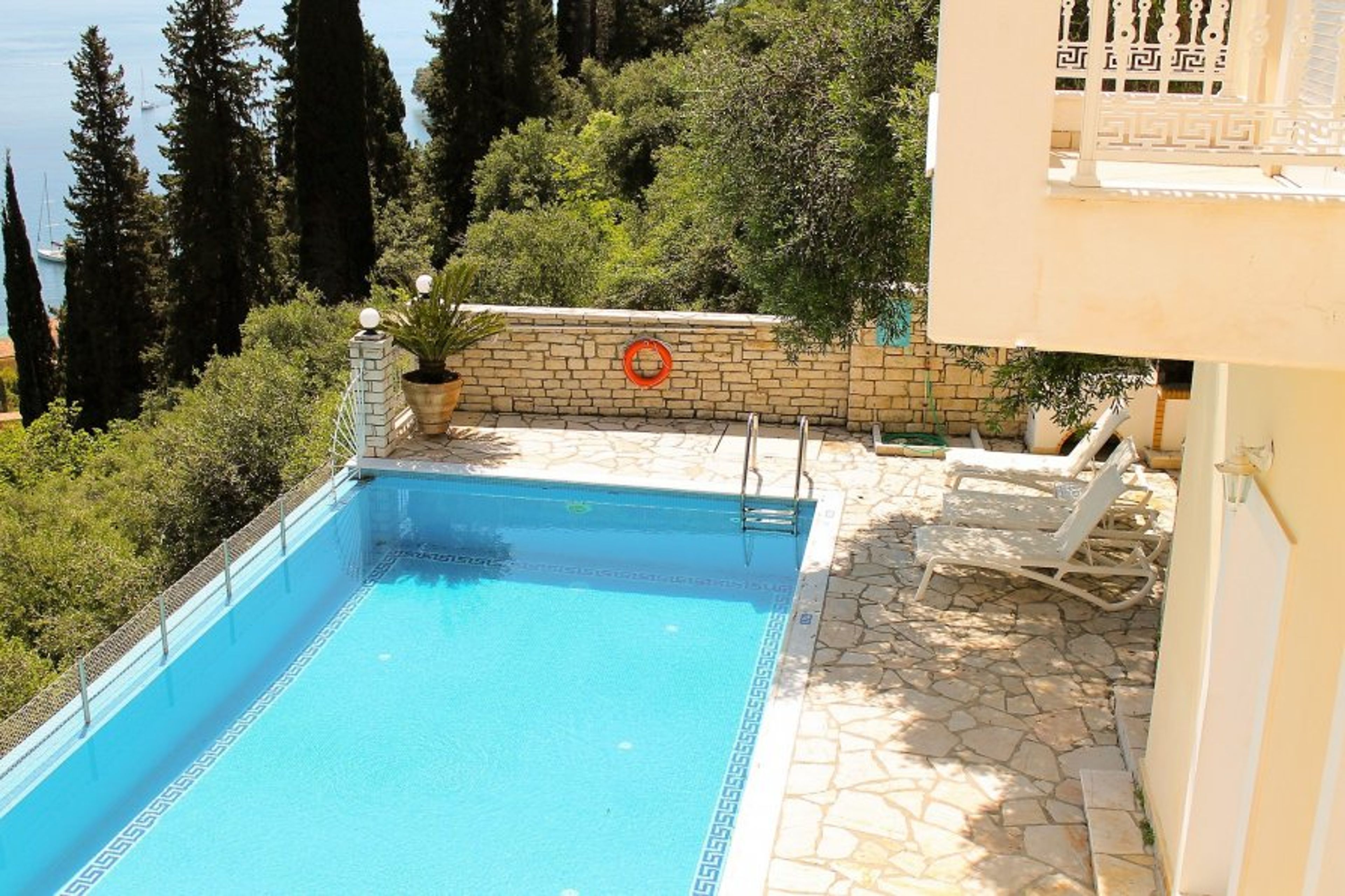 As you walk into the villa Kyriaki, you come across one of the two large living rooms, which has a terrace and a beautiful view of the Ionian sea. A small kitchenette and a w/c are also located on the same floor. The internal staircase leads to the first floor where the bedrooms are. The first bedroom has a double bed and a private bathroom. The other two bedrooms, both with twin beds, are on the same floor and have en-suite bathrooms. Each one of the top floor bedrooms has a private balcony with views of the pool and the sea.