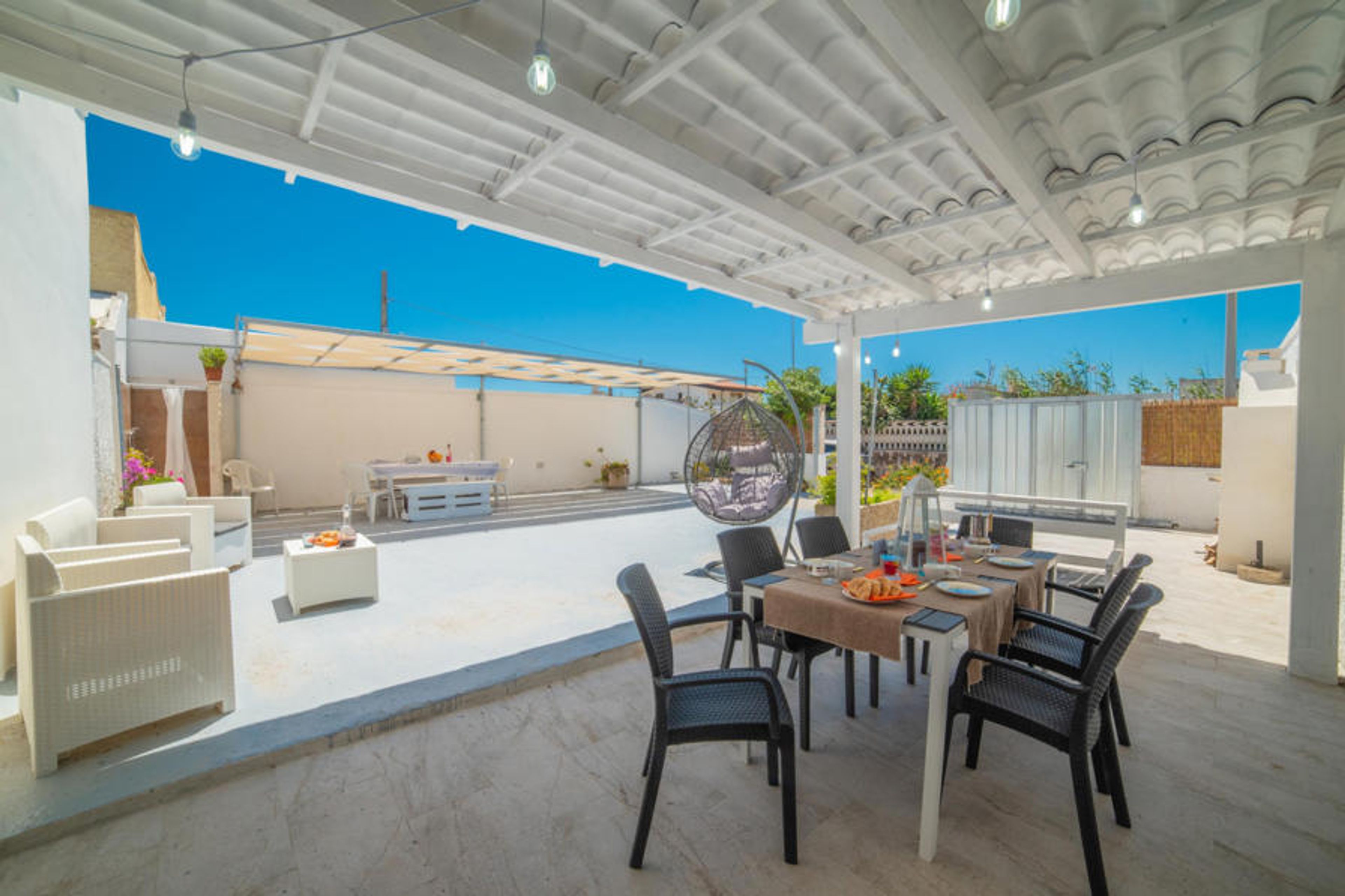 Enclosed by a surrounding wall, the property ensures complete privacy—an ideal feature for guests travelling with pets. The courtyard offers a comfortable outdoor lounge area with a sofa and armchairs for relaxing moments. Two shaded dining spaces, each with tables and chairs, along with a stone barbecue, provide the perfect setting for alfresco meals.