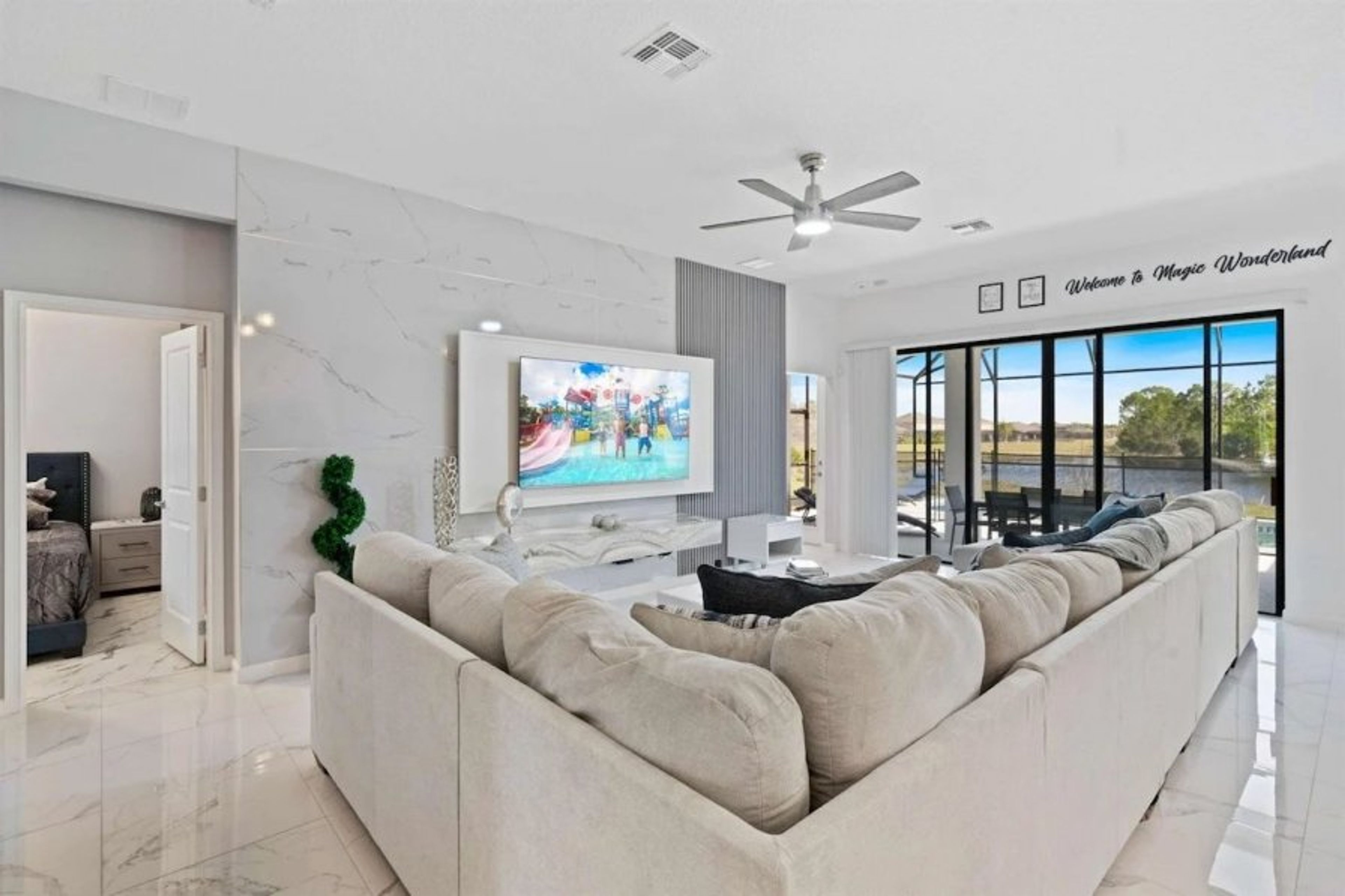 Home away from home. This 9 bedroom resort home includes a private pool, fully equipped kitchen, full-size washer & dryer. Grill out by the pool or relax a bit with a movie. This home has beautiful modern furniture and themed spaces to the fullest. With enough space to sleep 23 people, this home has something fun for everyone! Two primary suites and seven secondary suites. Only 20 minutes away from most major Orlando attractions, this home is located in the perfect area to reach the fun-filled destinations of the rest of your vacation.