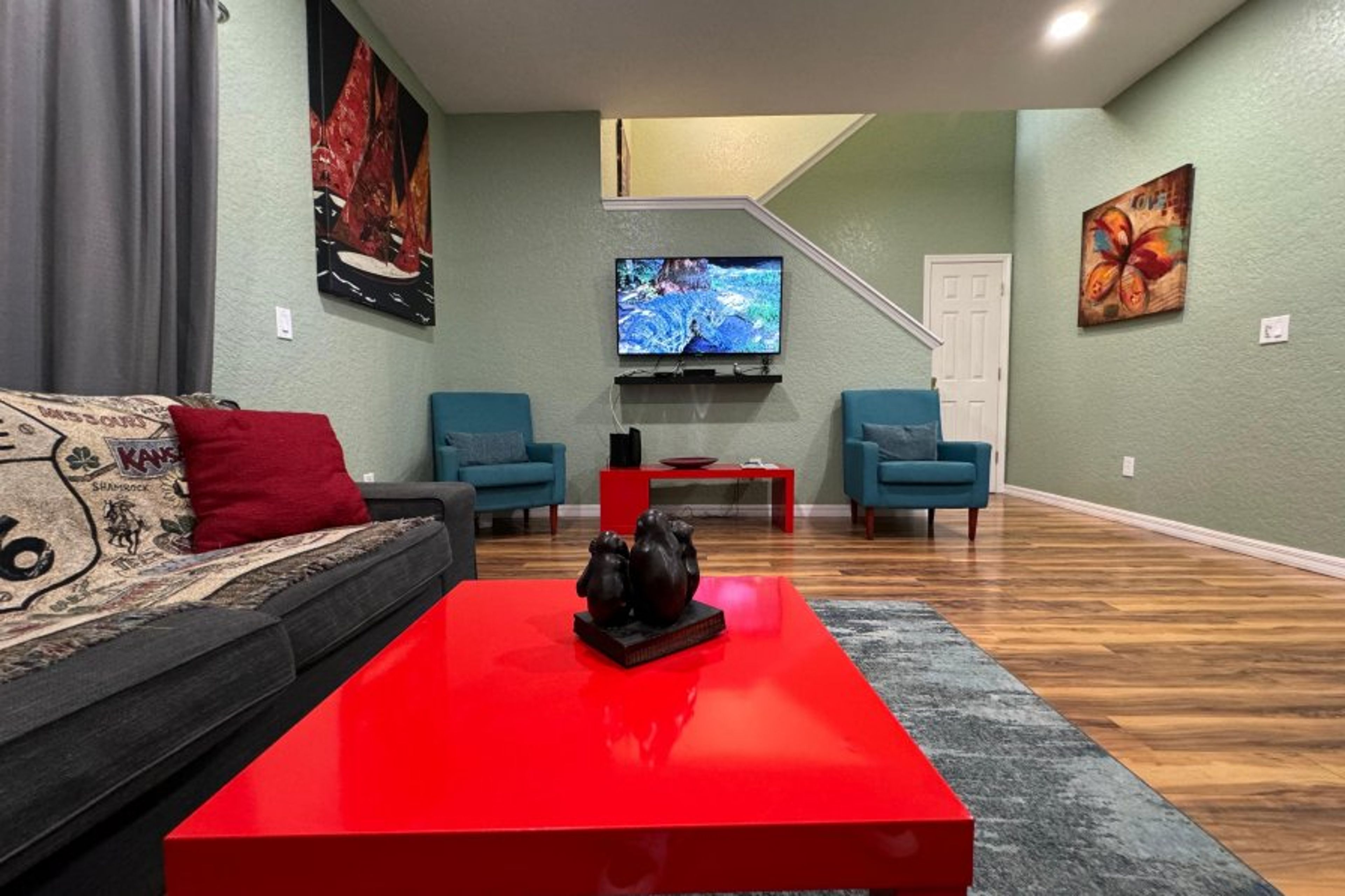 Bright & Airy Living Space – Unwind in a stylishly decorated living room with plush seating and a large Smart TV for movie nights.
