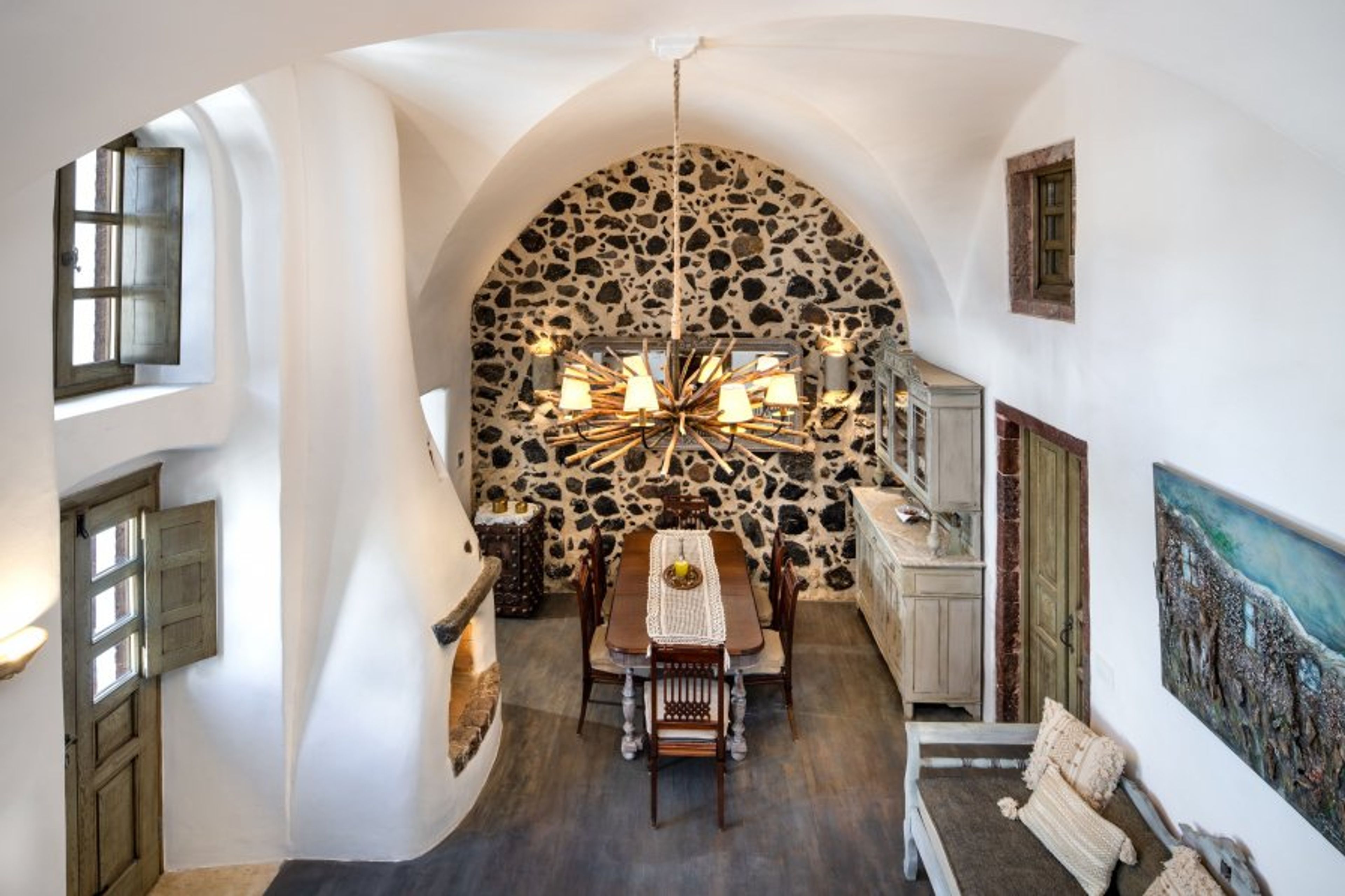 Historical Villa Santa Croce is a luxurious and charming retreat located in the heart of Pyrgos, Santorini, offering the perfect blend of historic charm and modern comfort. The villa features spacious living areas designed for relaxation and socializing, including an open-plan lounge with comfortable seating, two dining areas for memorable meals, and two fully equipped kitchens, as well as a traditional wood oven where your private chef can prepare local delicacies and give you cooking lessons. Traditional Cycladic architecture, stone walls, and hand-crafted details create an authentic Santorini ambiance throughout the villa.