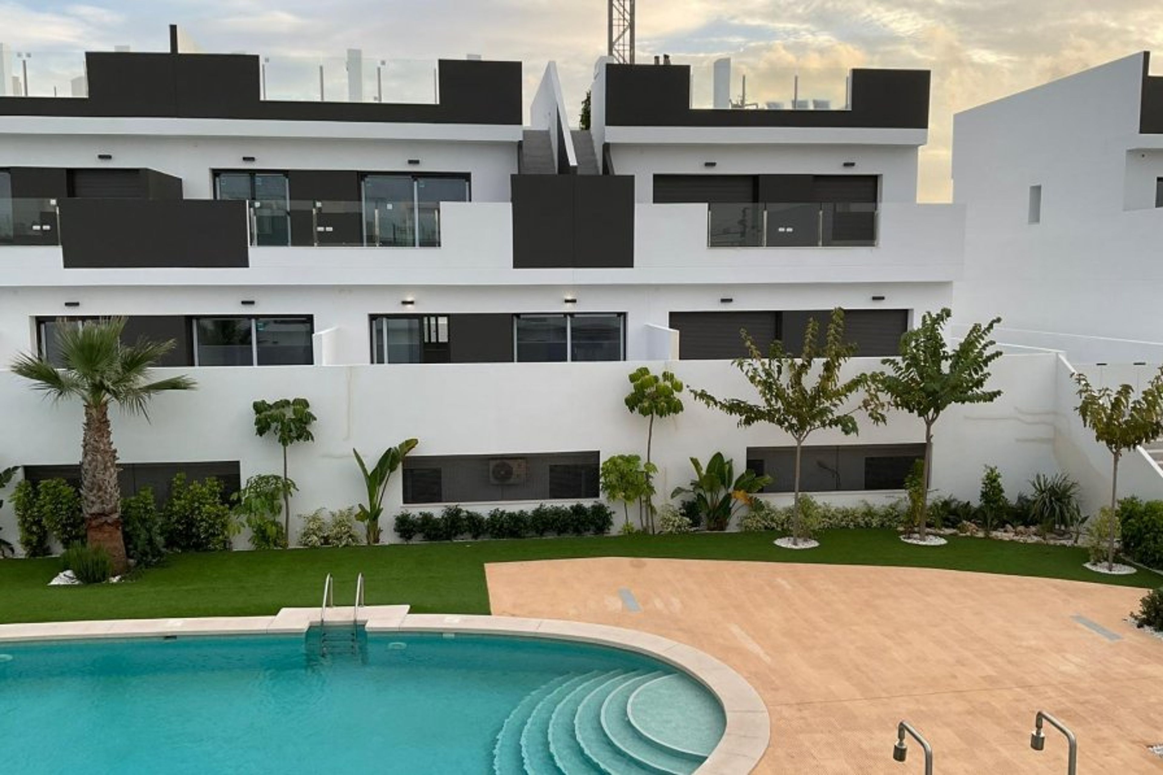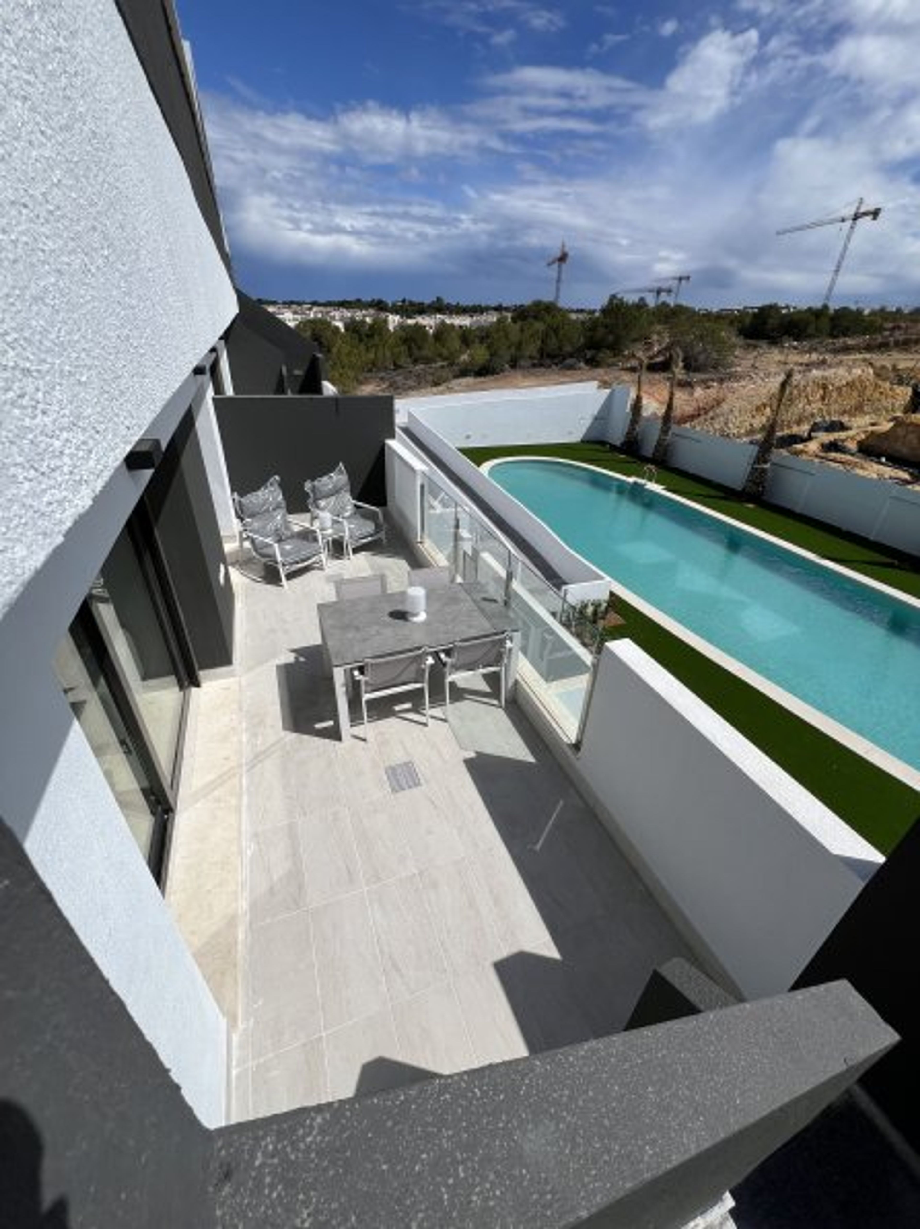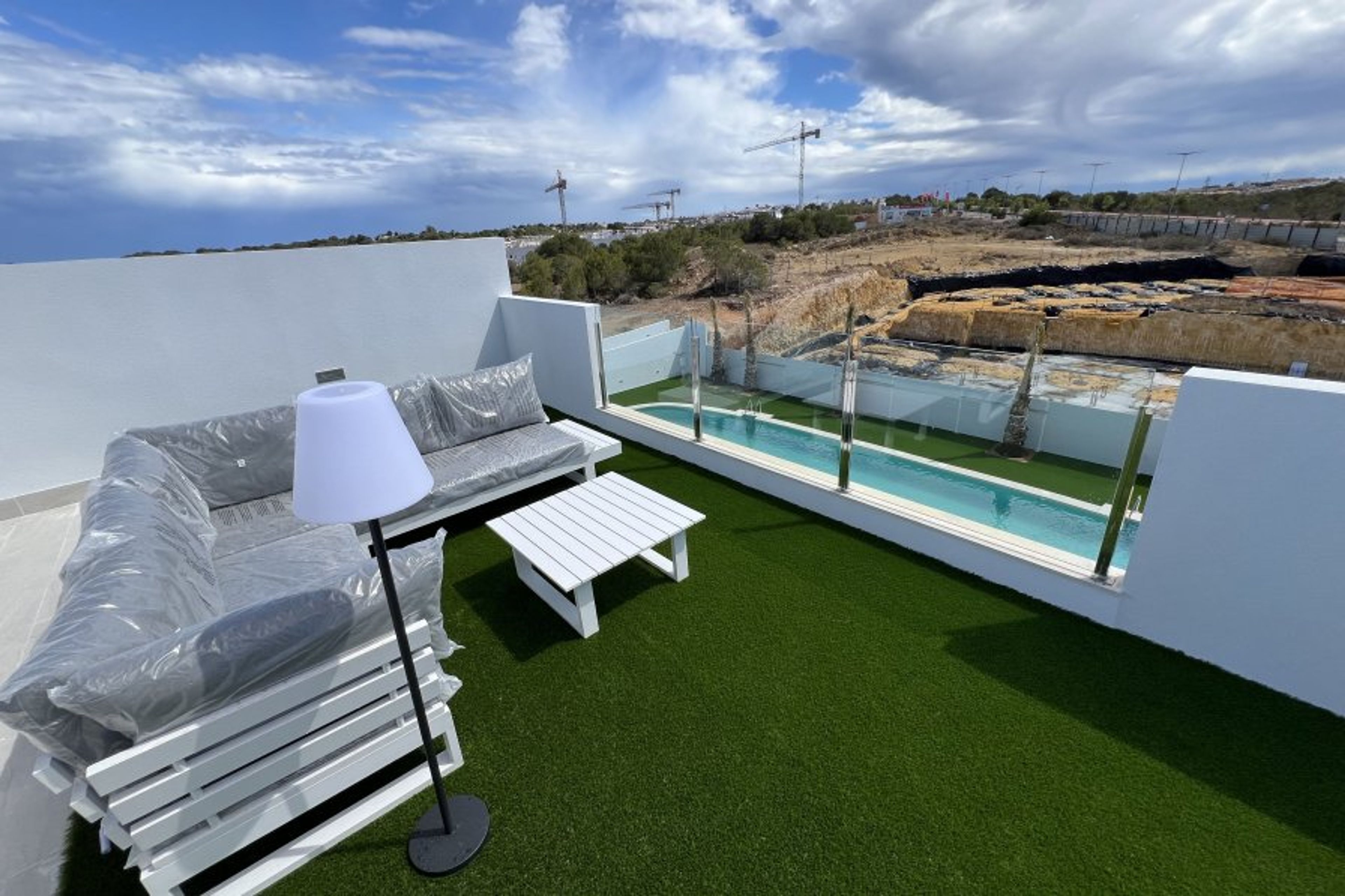 This unique property has a unique style, overlooking the swimming pool, the salt lake and the city of Torrevieja. In the area Los Balcones. About 3km from beaches and the center of Torrevieja.