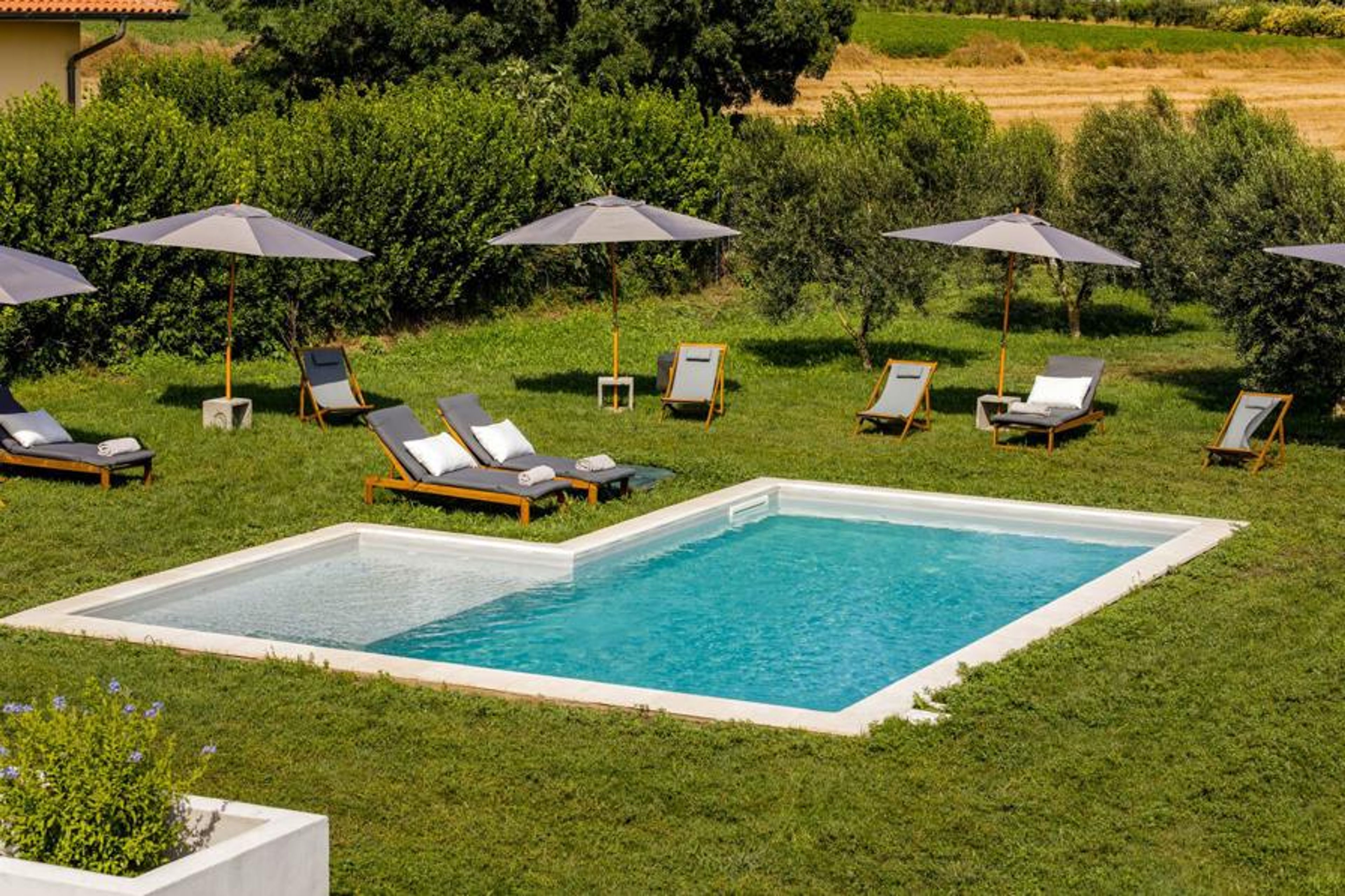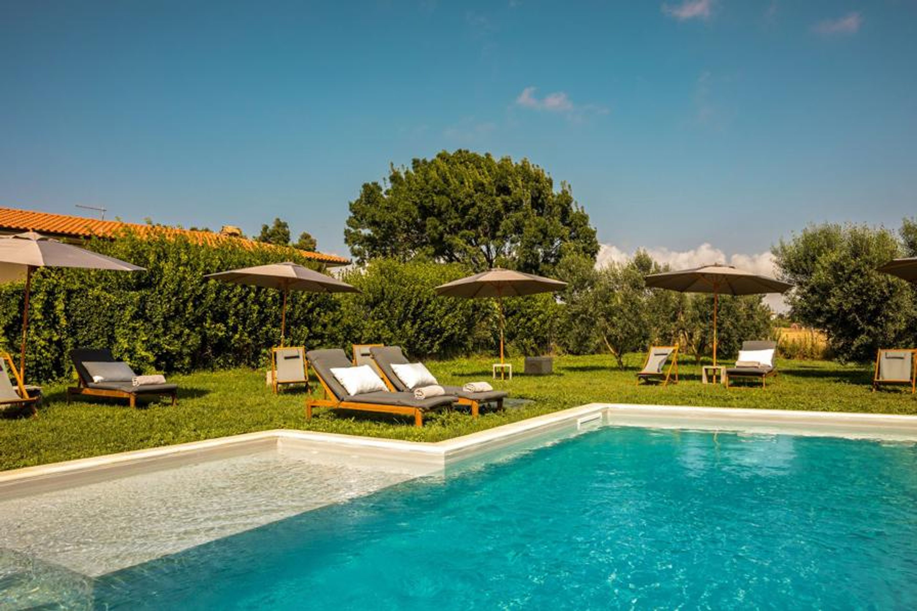 Inside, light-filled rooms combine natural tones, traditional textures, and contemporary furnishings, creating a warm yet elegant feel. Step outside and the farmhouse truly comes to life: a private swimming pool with a separate paddling pool invites lazy summer days, while expansive gardens dotted with olive trees and patios provide the perfect setting for outdoor meals and gatherings. The dependence, cleverly reimagined as a cosy lounge with optional extra sleeping space, adds flexibility and charm.