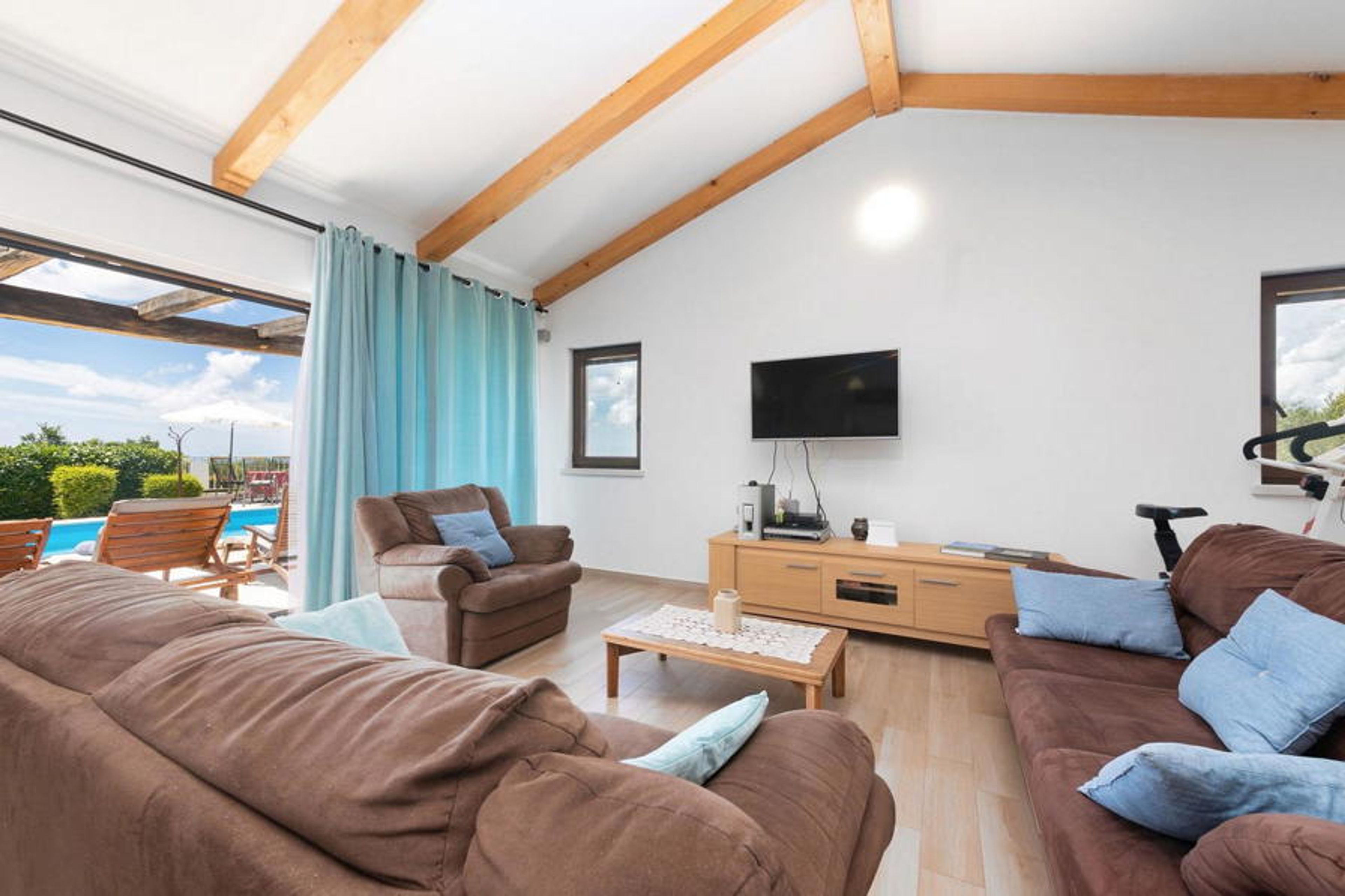 The villa was built in the year 2015 and is situated on an approx. 2000 sqm enclosed property with lawn and olive trees with a nice panoramic view on the sea. The panoramic view is highlighted through the large windows in all rooms of the house. The village Barat is located 3 km from Visnjan, a picturesque town where we can find various shops, bakeries, restaurants/pizzerias, ATM and more. The villa Nira offers its guests the following outdoor facilities: private parking places for three vehicles, 36 sqm large swimming pool with sun chairs, a covered terrace with sitting set and barbecue.