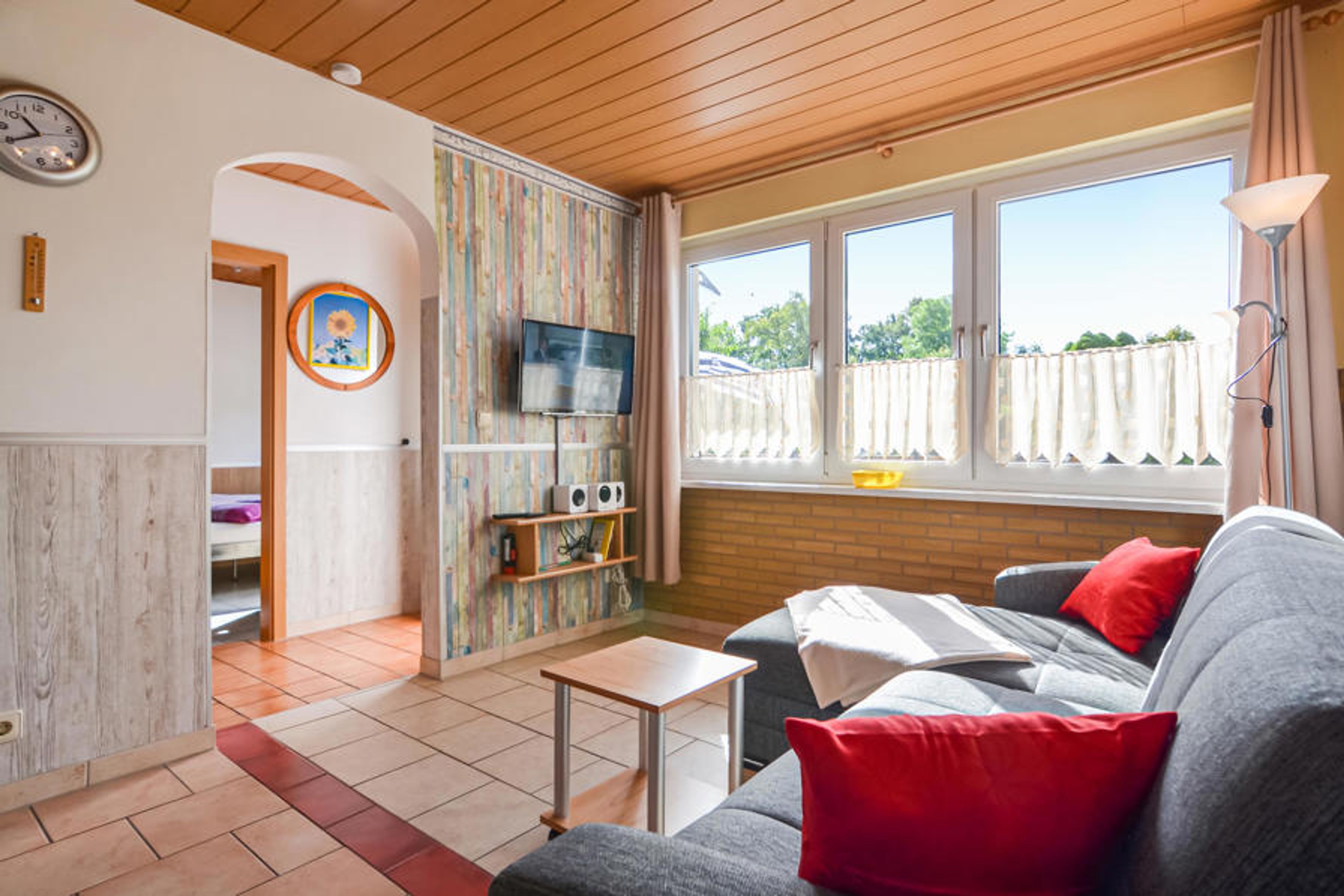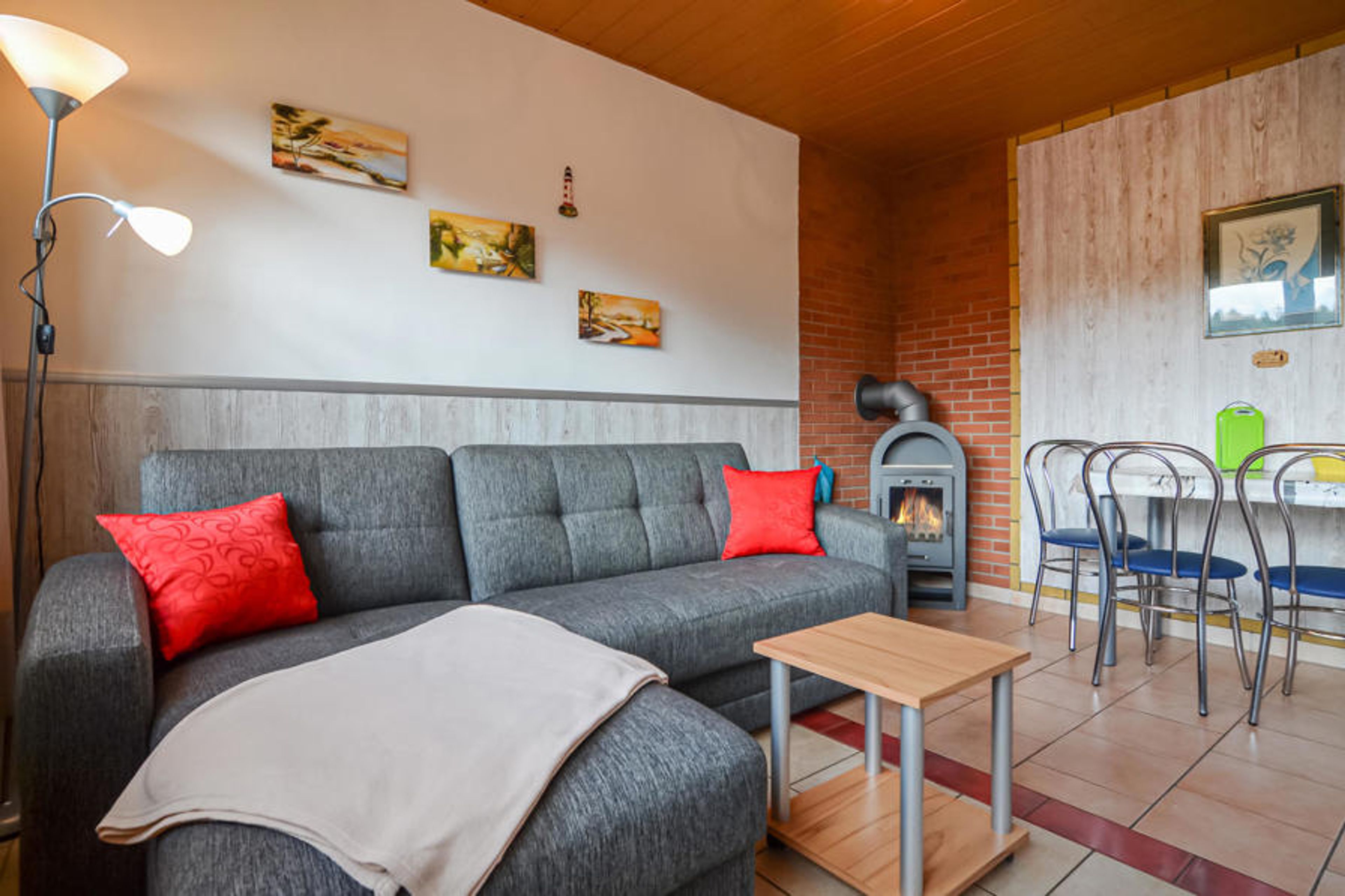 Start the day on your terrace with an extensive breakfast or relax with a cosy barbecue evening with your family. High-quality garden furniture and a barbecue are of course at your disposal. The bedroom is furnished with a double bed and there is a comfortable sofa bed in the cosy living room. On cold or rainy days, the stove radiates a cosy warmth and creates a feeling of comfort. The small but modern bathroom has a shower.