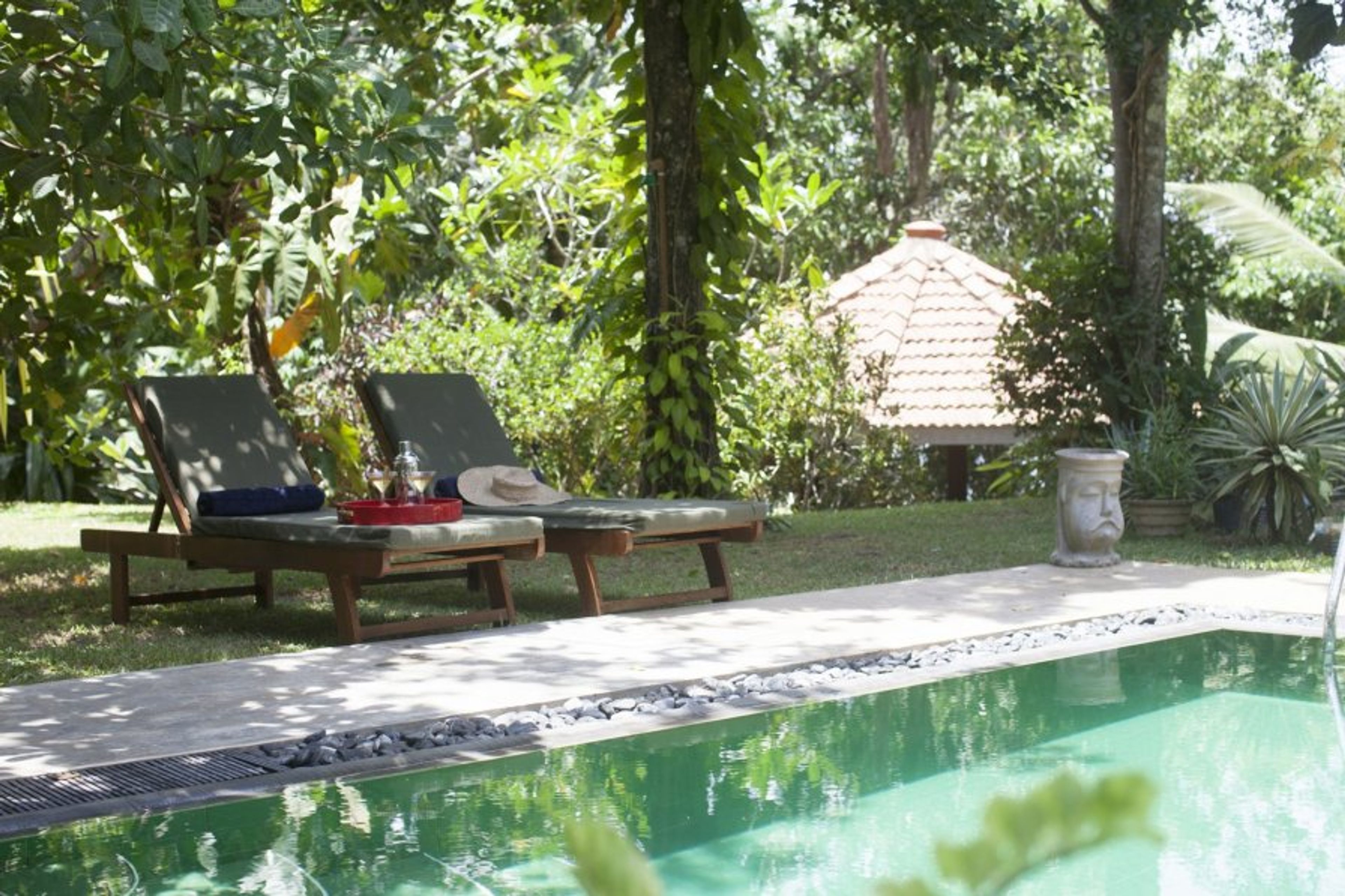The cabana within the grounds is also a peaceful oasis with pond, water feature and two hammocks; an ideal place for relaxing, listening to the waterfall and wildlife in the gardens. Monitor lizards, iguanas, porcupine, mongoose, chipmonks and leaf monkeys visit the garden by day; while fruit bats fill the skies at dusk.