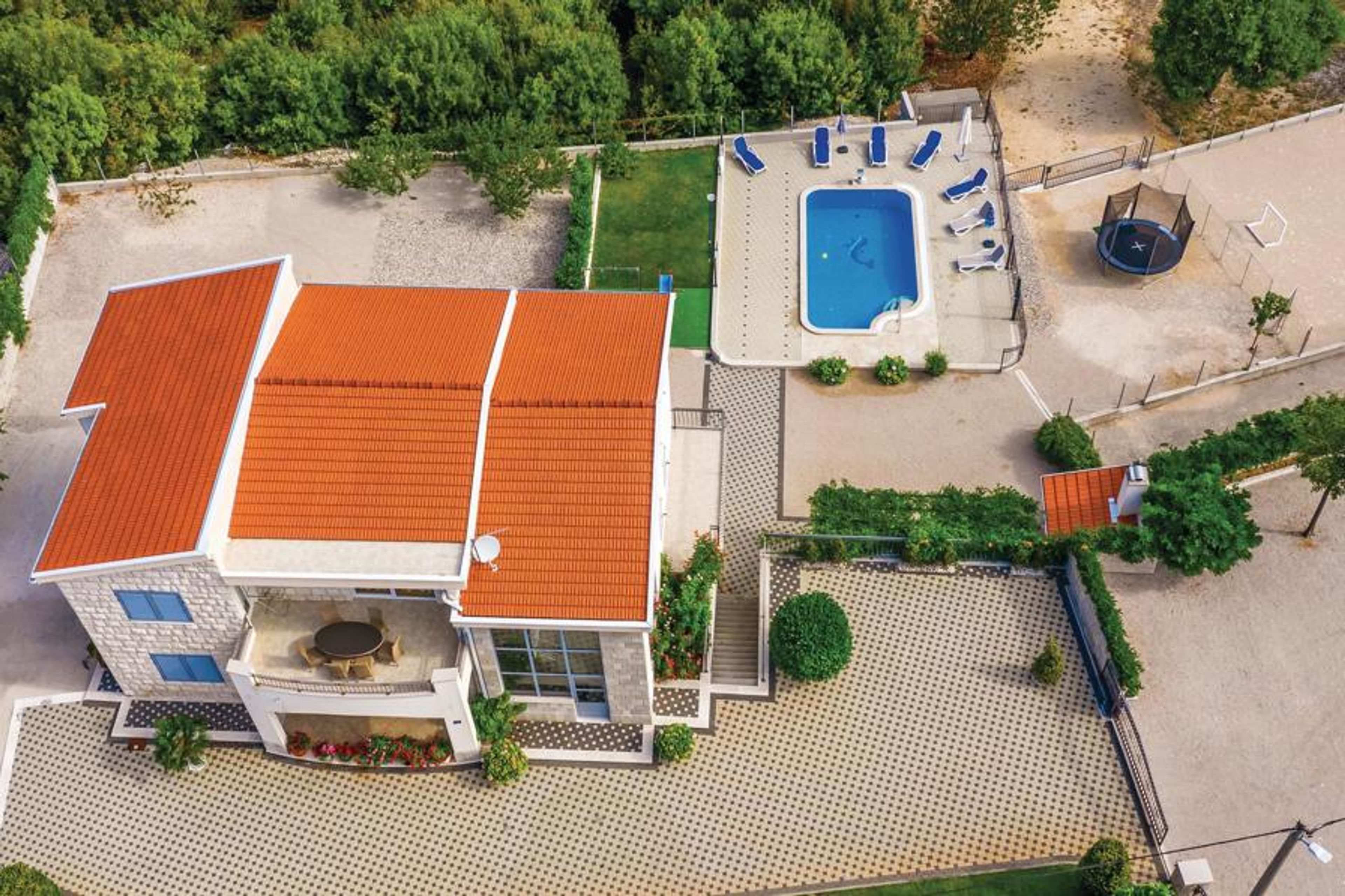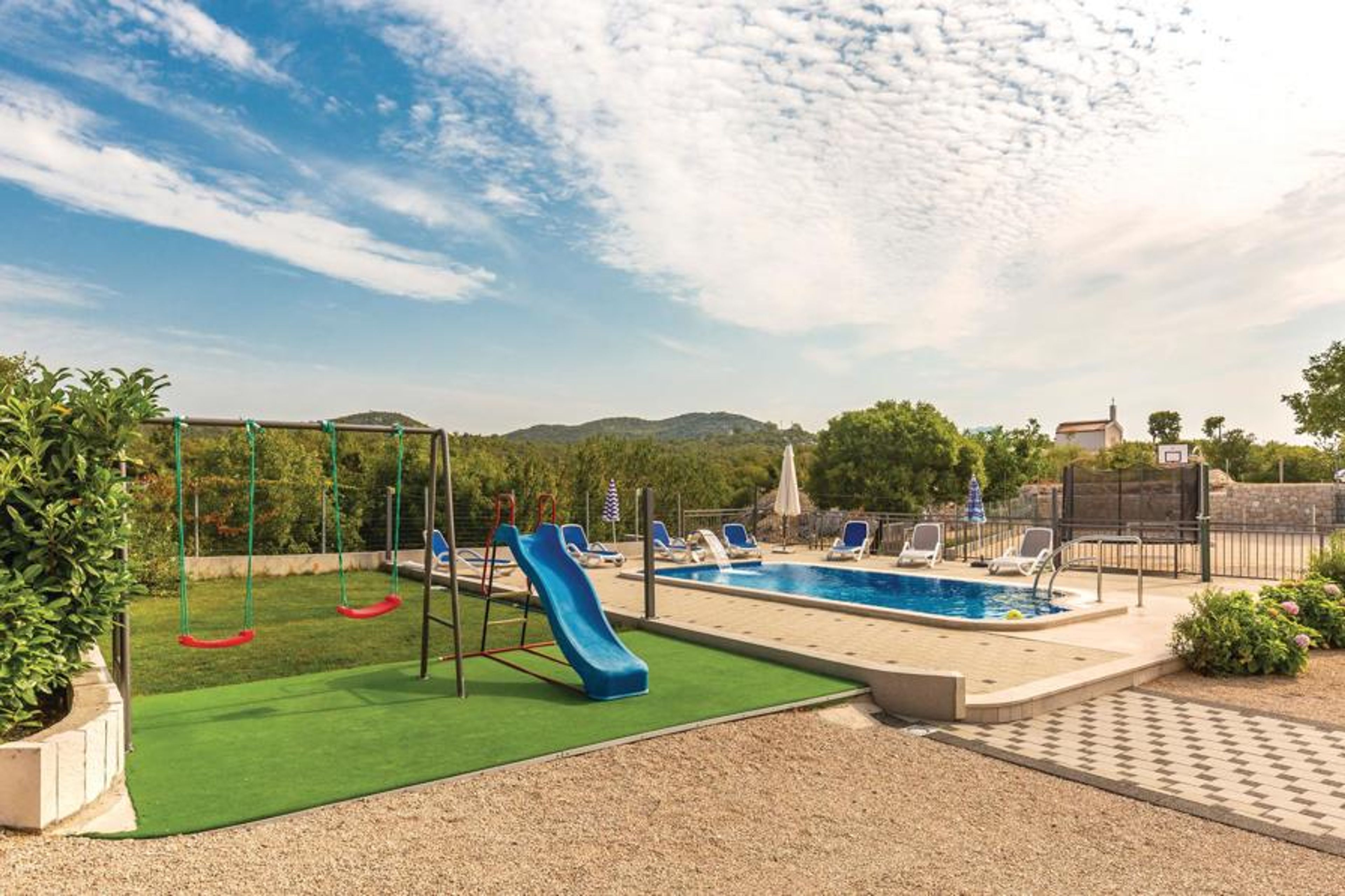 Comfortable and tastefully furnished vacation house is located in the hinterland of Dalmatia, behind the Makarska Riviera. It consists of the basement, first floor and upper floor (interior stairs). In front of the house there is a swimming pool, next to which are a children's play area and a terrace with barbecue. An activity room is located in the basement. These amenities are designed for your relaxation. If you are a nature lover who has a desire for peace and tranquility, then this vacation home is the right place for a vacation. From the property there is an unforgettable view of the surrounding mountains.