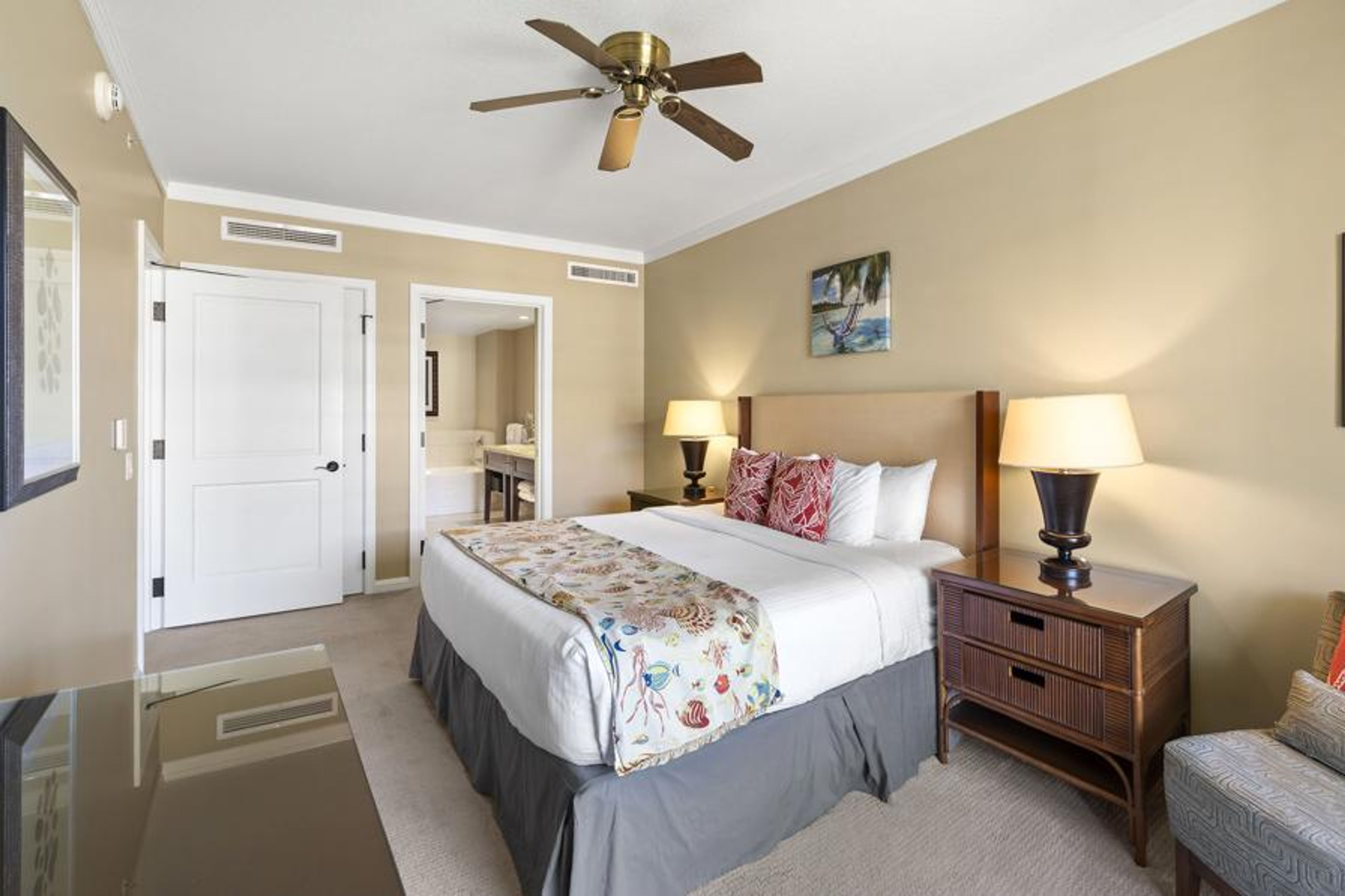Inside, you'll enjoy Honua Kai's sought-after 1,315 sq ft split-bedroom layout, designed for privacy and comfort. The fully equipped kitchen features sleek Bosch appliances, granite countertops, and all the tools a home chef could want—including favorites from the homeowners, who are passionate about cooking. A generous 230 sq ft glass lanai extends your living space, inviting you to savor indoor-outdoor living island-style.