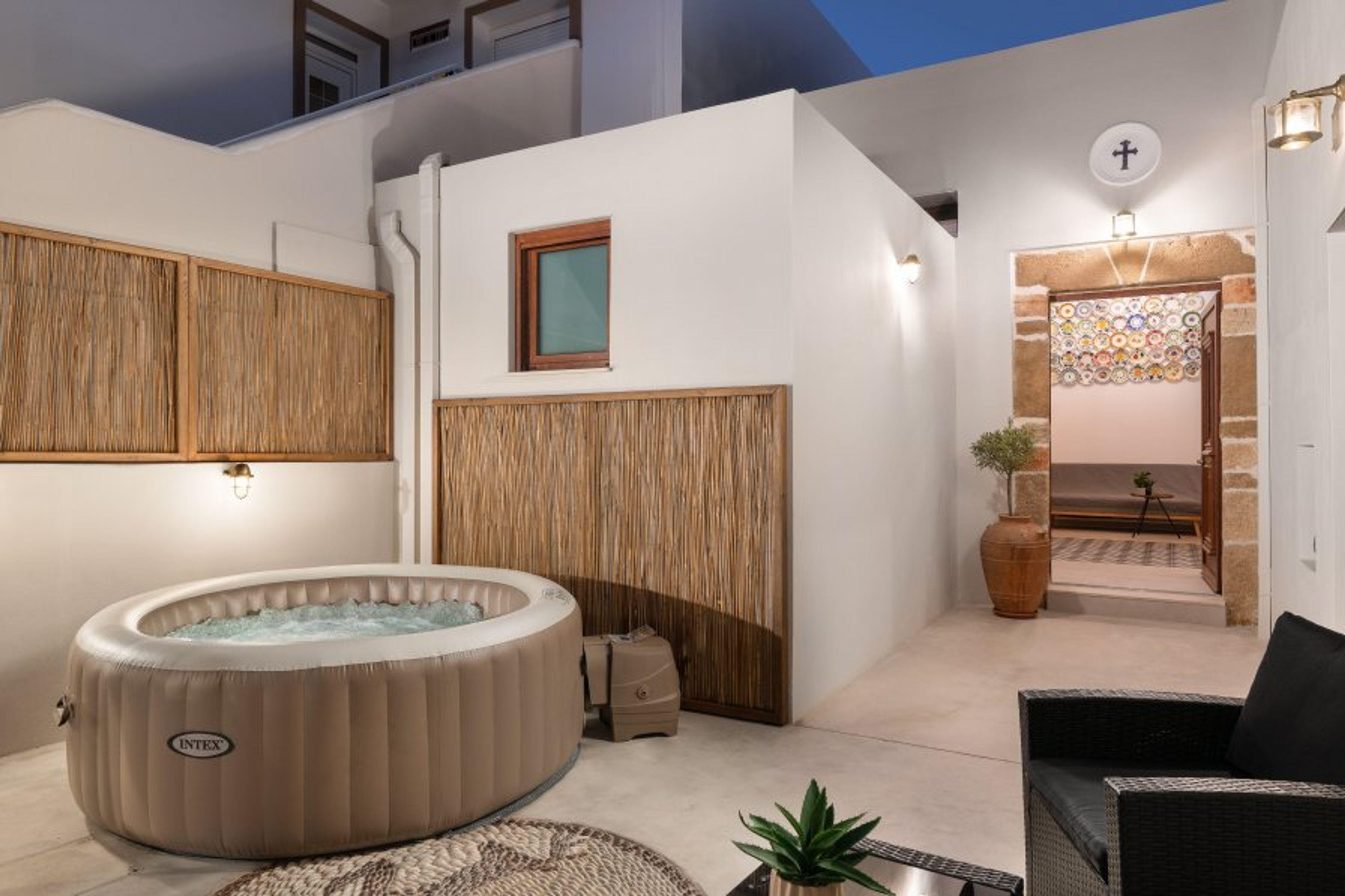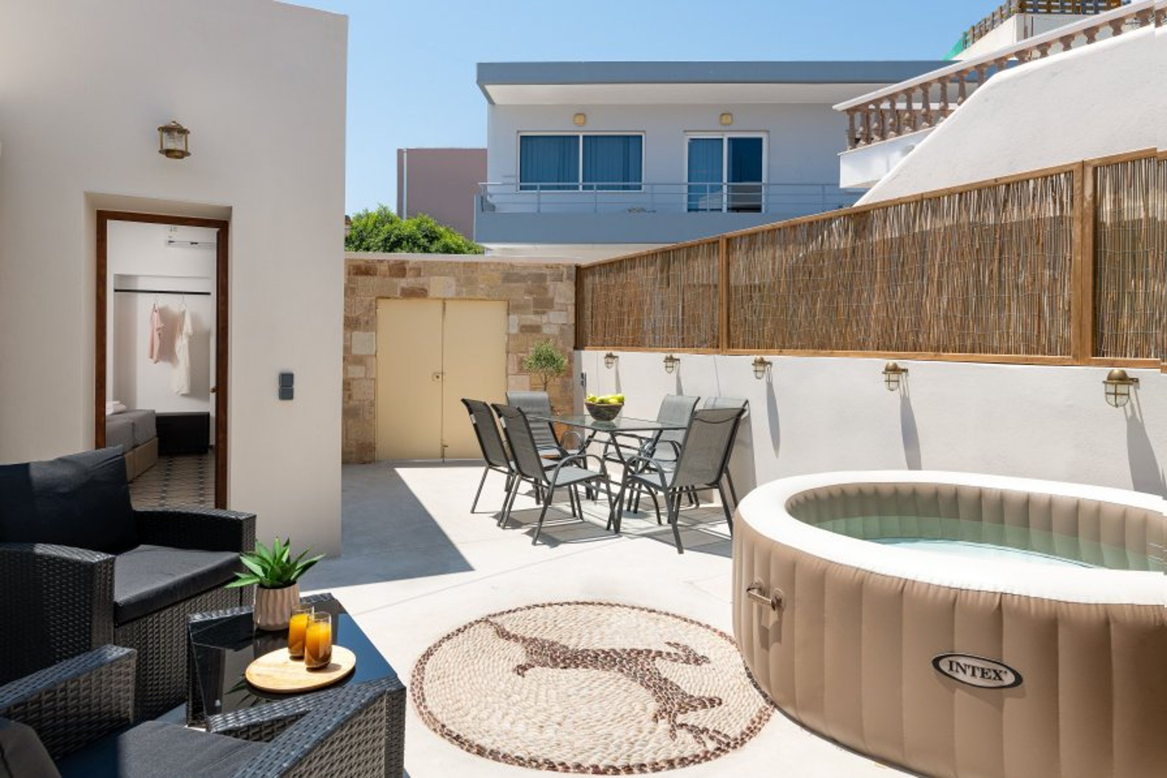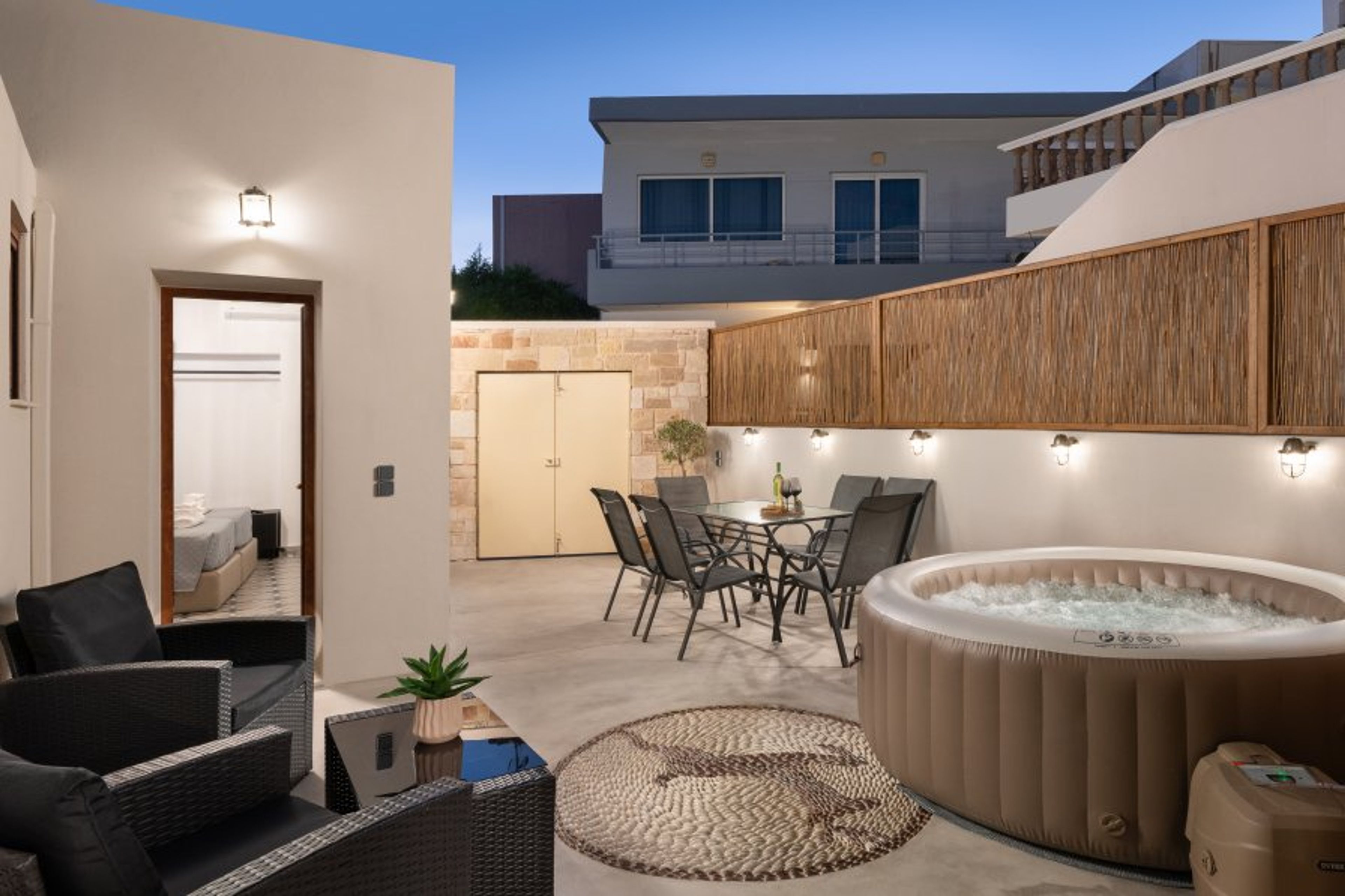 Outside, the private jacuzzi provides the ultimate space to relax and recharge, surrounded by the tranquil charm of the village. The outdoor area also includes a dining table, perfect for enjoying breakfast, lunch, or dinner in a peaceful and beautiful setting.