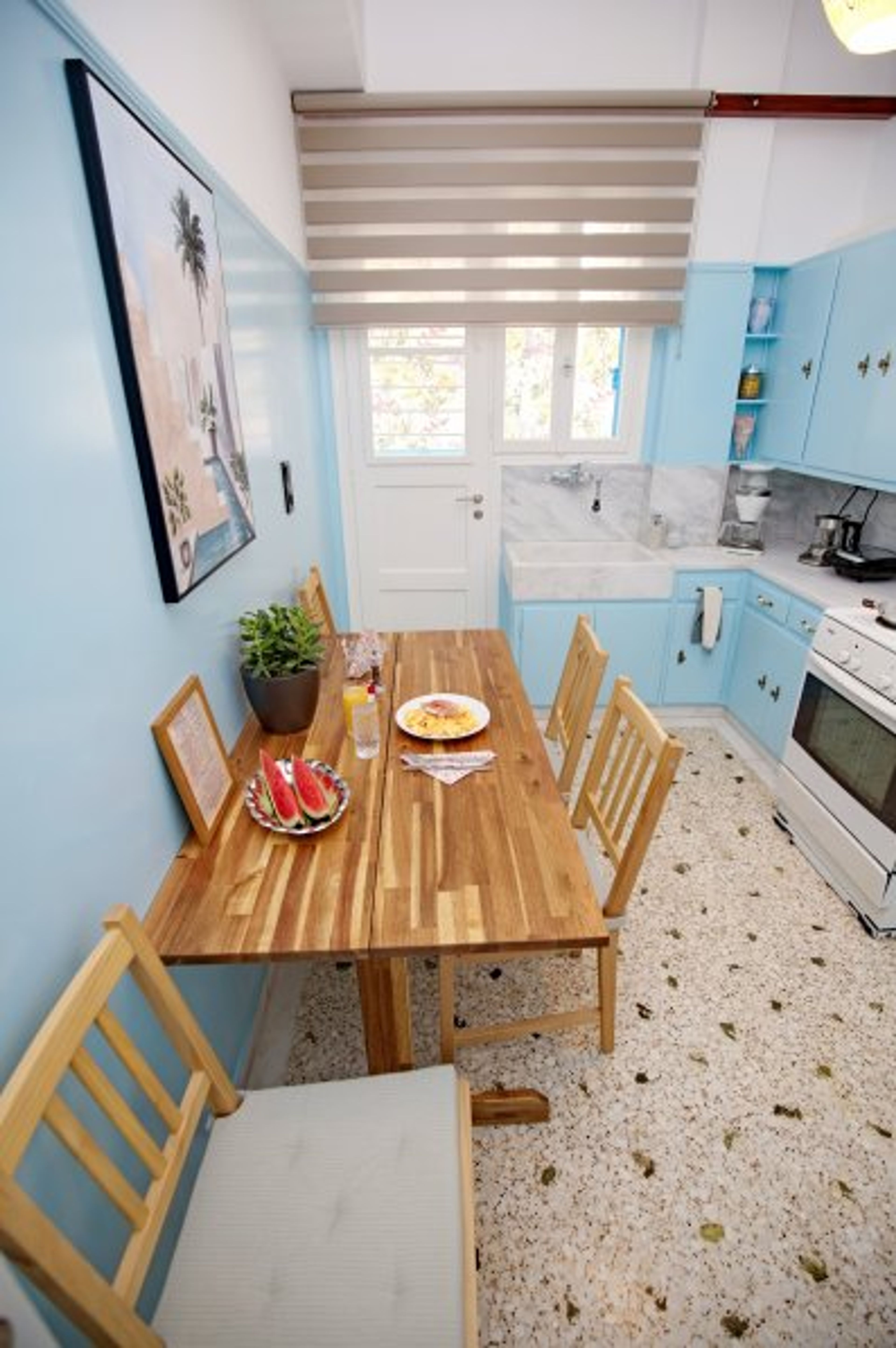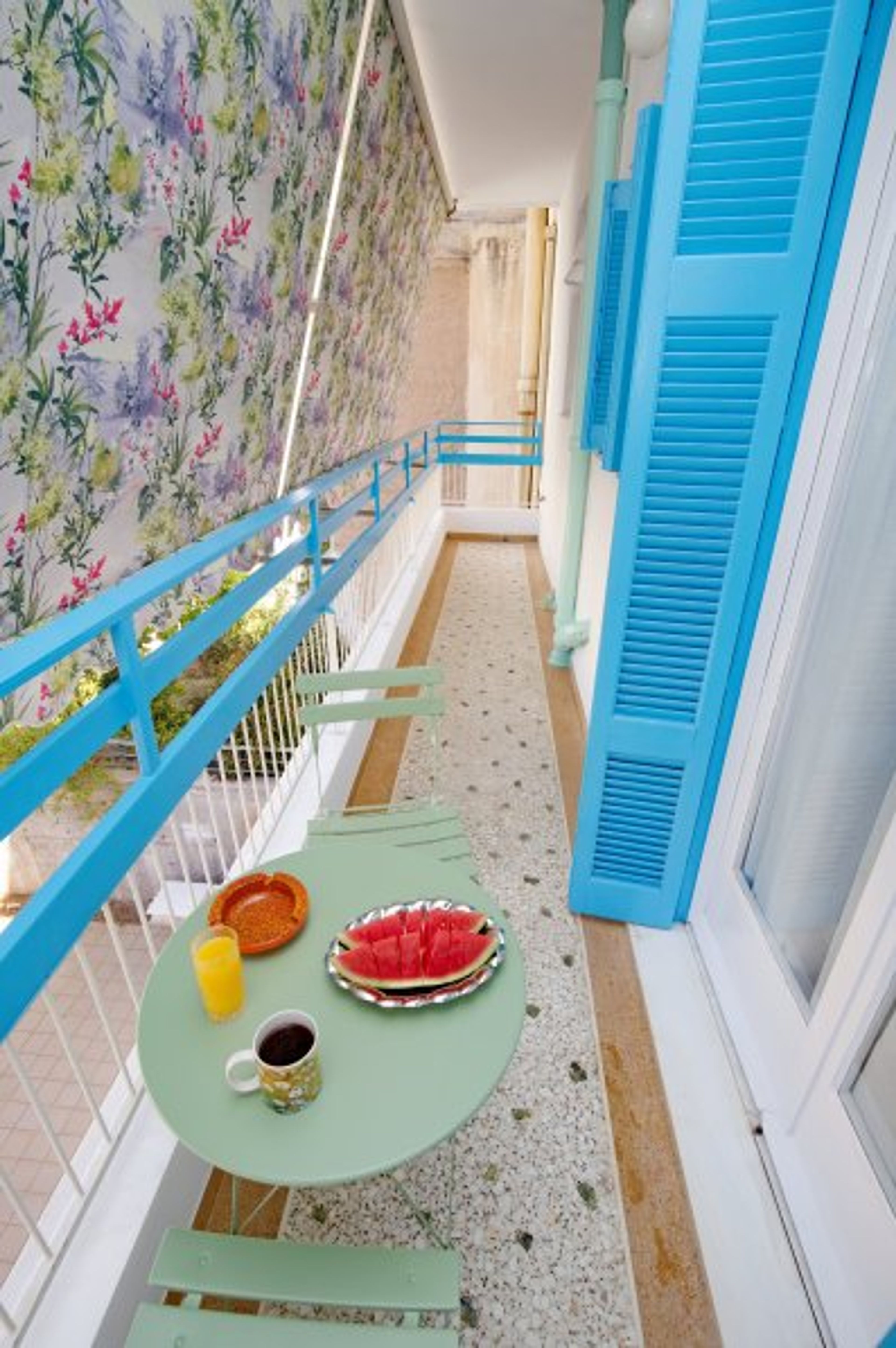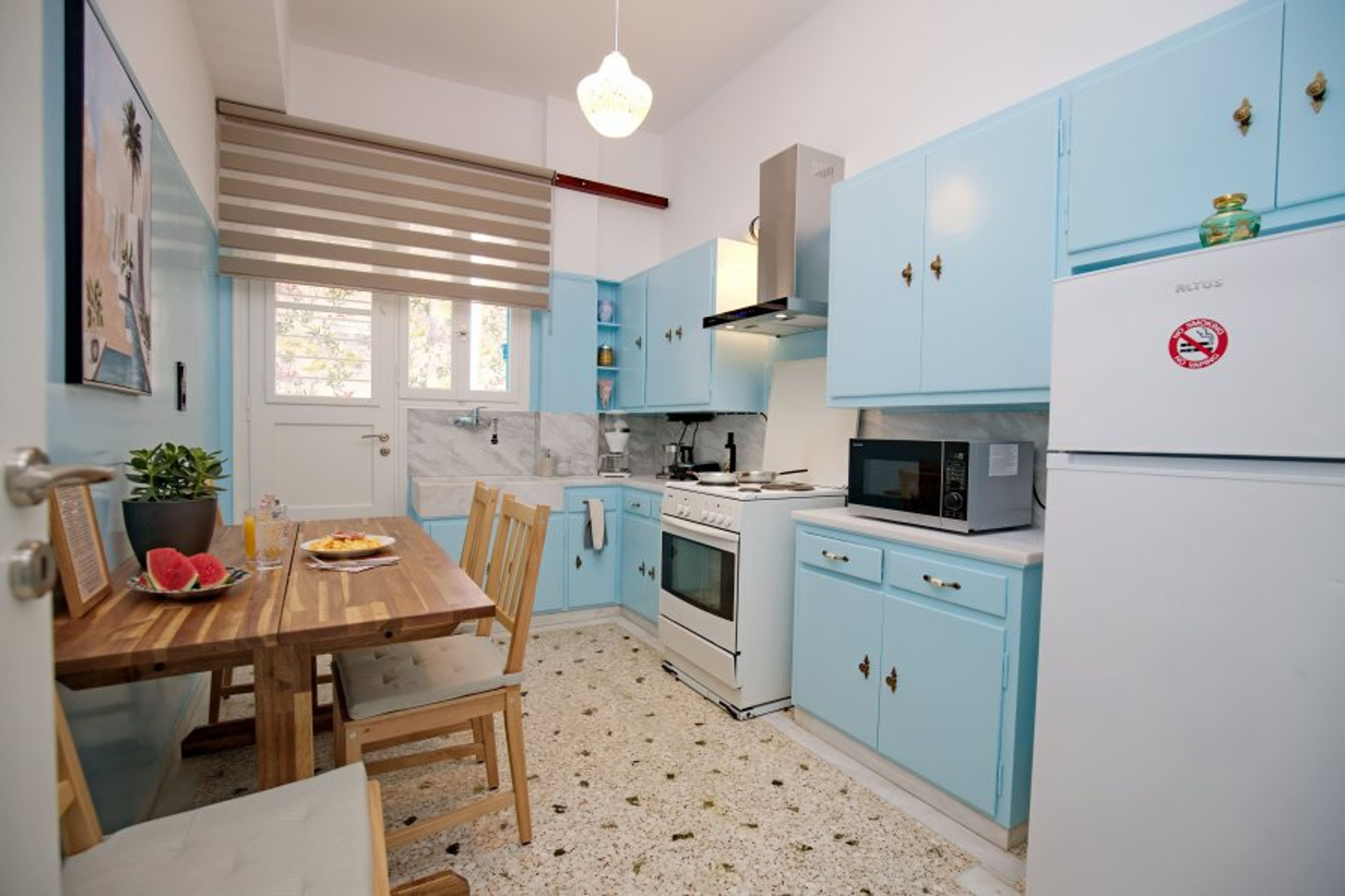 The Space & Guest Access Retro Athens is a distinguished 96 m² residence occupying the entire first floor of a private detached house. Guests enjoy full, exclusive access to the entire floor, including a grand living room with a piano, two quiet bedrooms with premium mattresses, a fully equipped kitchen, and two expansive balconies stretching the length of the building. With a private entrance and no shared spaces, you are guaranteed complete independence and privacy.
