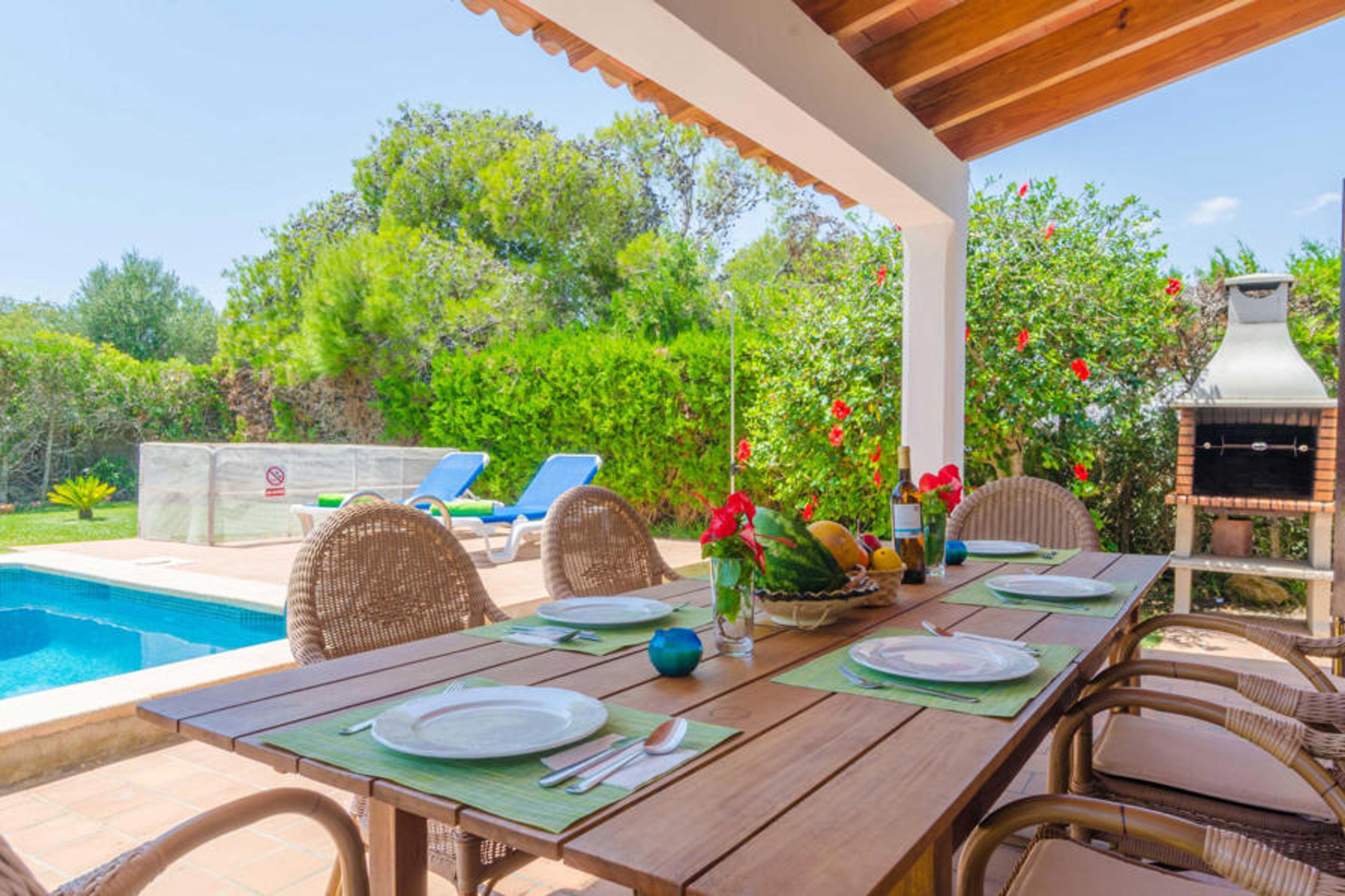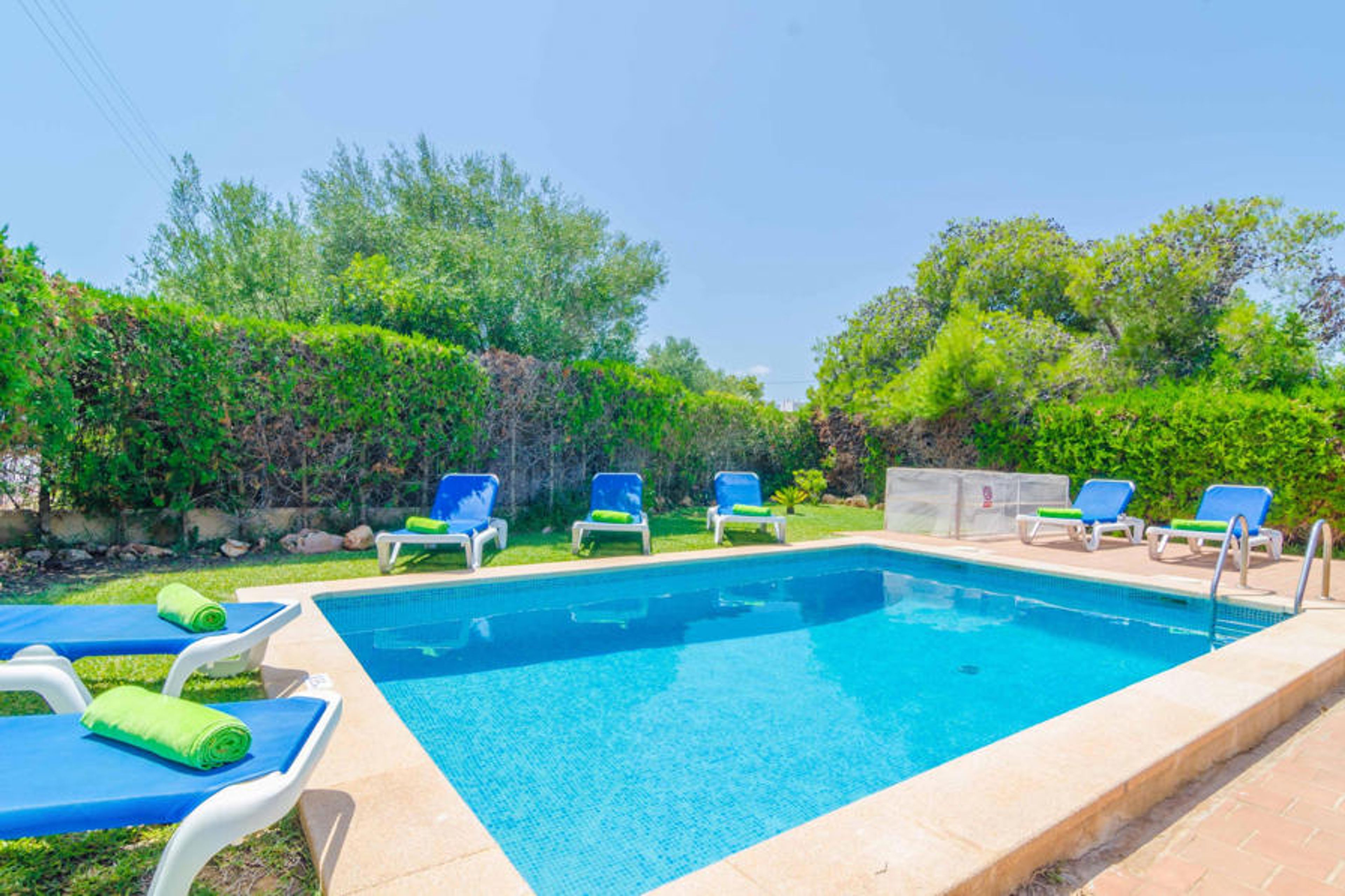 Chalet with private pool in Cala Egos (Cala d’Or) ideal for beach holidays, welcomes 8 guests You won’t want to be in another place but the beautiful exterior area of this house. Of course, the central element is the chlorine pool sizing 7 x 4 metres and with a depth between 0.8 and 1.9 metres, around which you will enjoy the sun and weather the wonderful gardened area full of sunbeds. By the house, you will find the porch, ideal to have lunch or dinner outside while the little ones take a dip or play. You can also prepare delicious barbecues. . There is another terrace on the first floor, a little corner to relax at night and watch the starry sky. The property is fenced and there are attached neighbours.