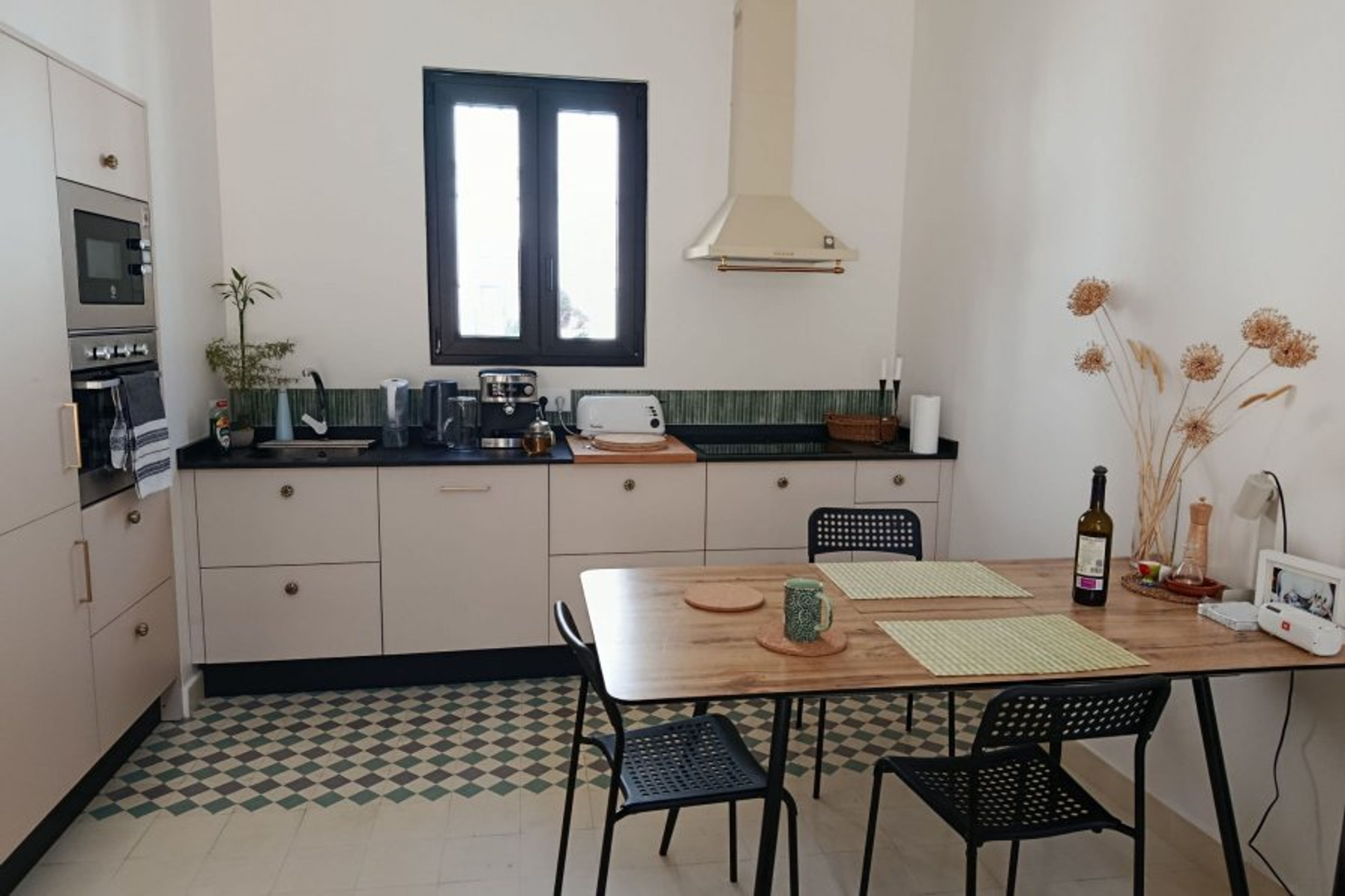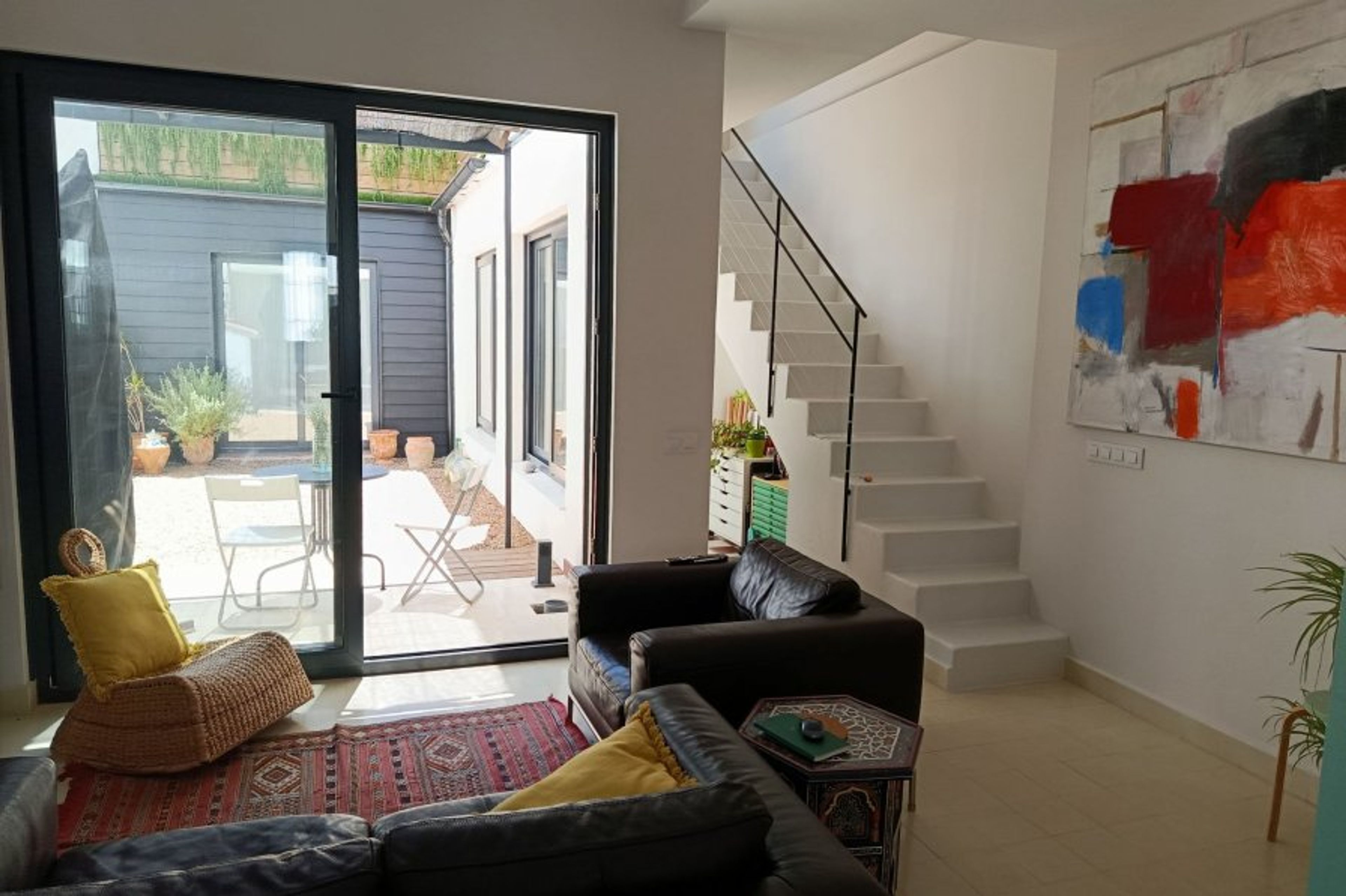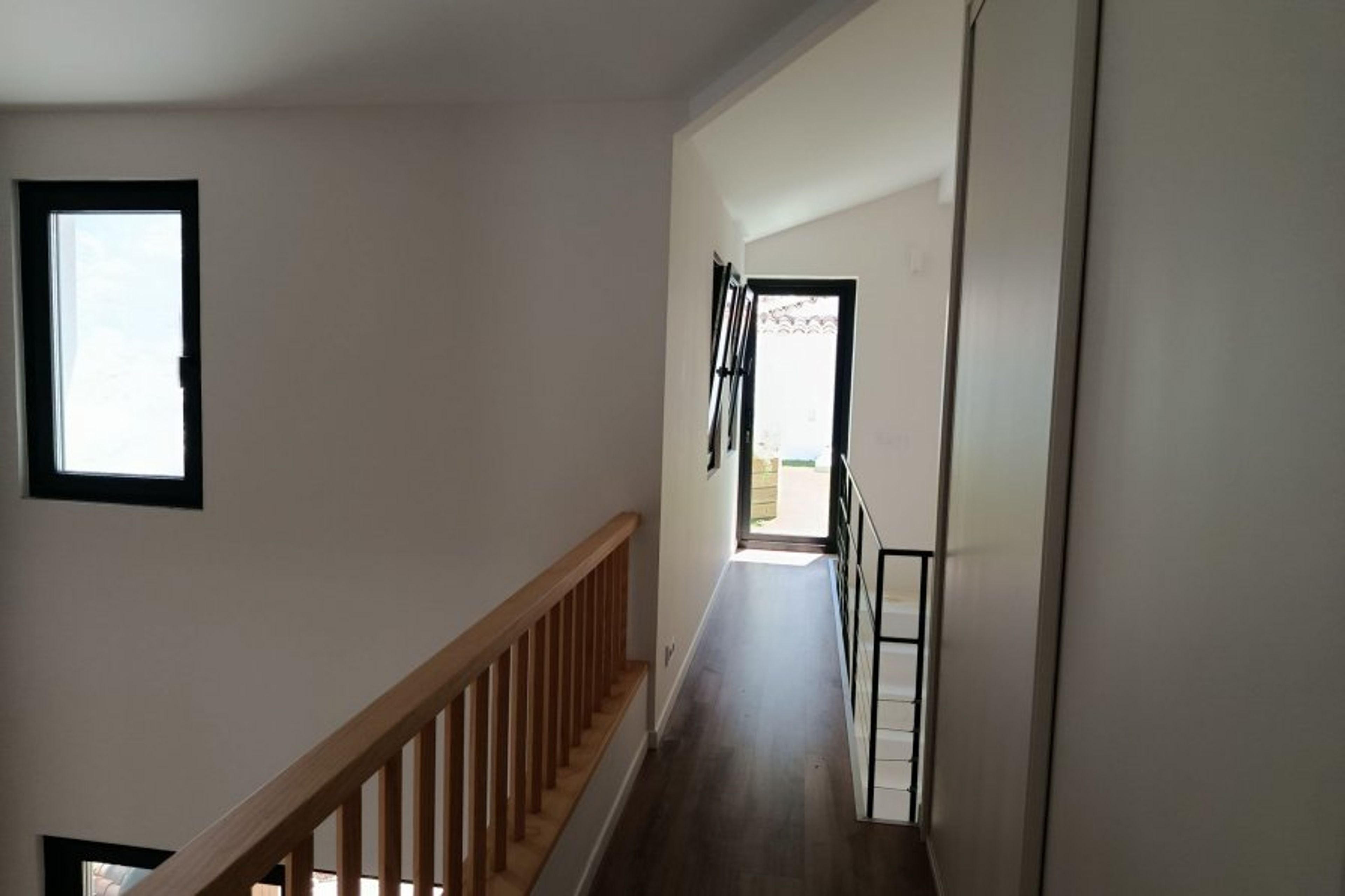 The house is built on two floors. Downstairs, we have a fully equipped kitchen, open to a double-height living room, which is warm and incredibly bright thanks to its large win-dows with access to the patio. On the other side, there is a spacious bedroom with a 150 cm double bed, a bathroom with natural light and a dressing room. The hallway between them has large windows and we have converted it into a work area with a desk.