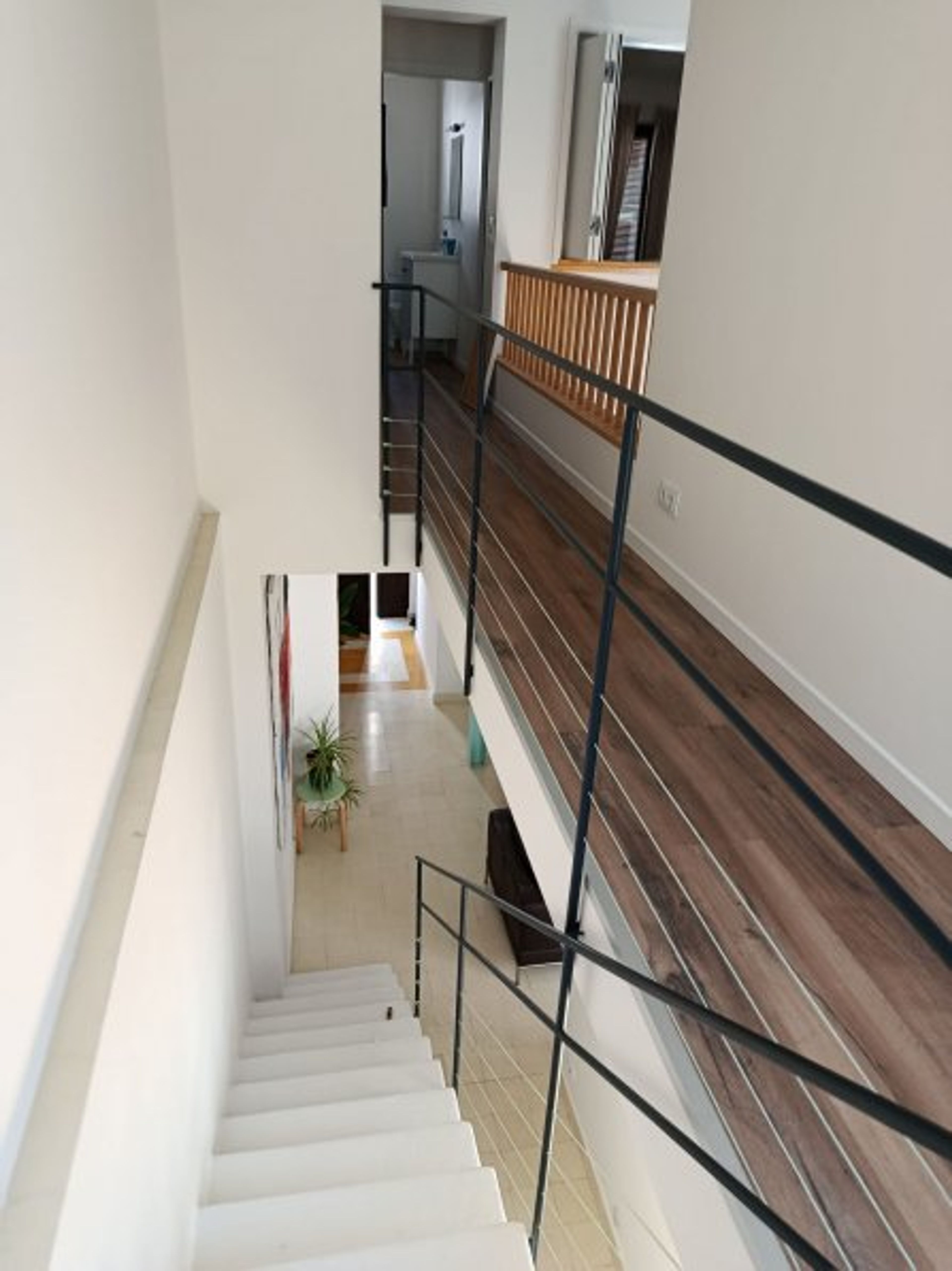 Upstairs, there is another bedroom with two single beds and a bathroom. You will also find a built-in wardrobe in the hallway where the washing machine is located, near the exit to the roof terrace where you have sun loungers.