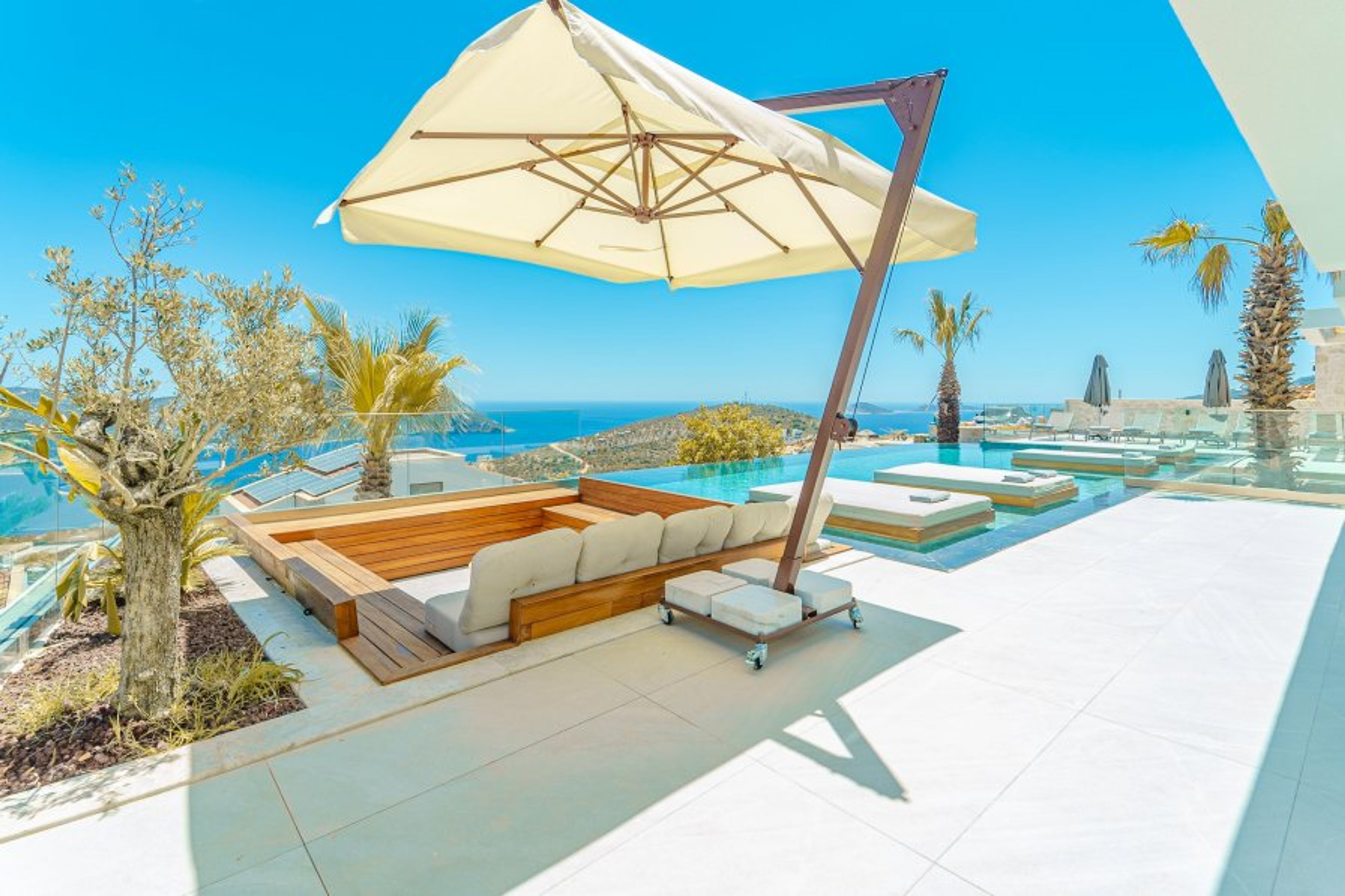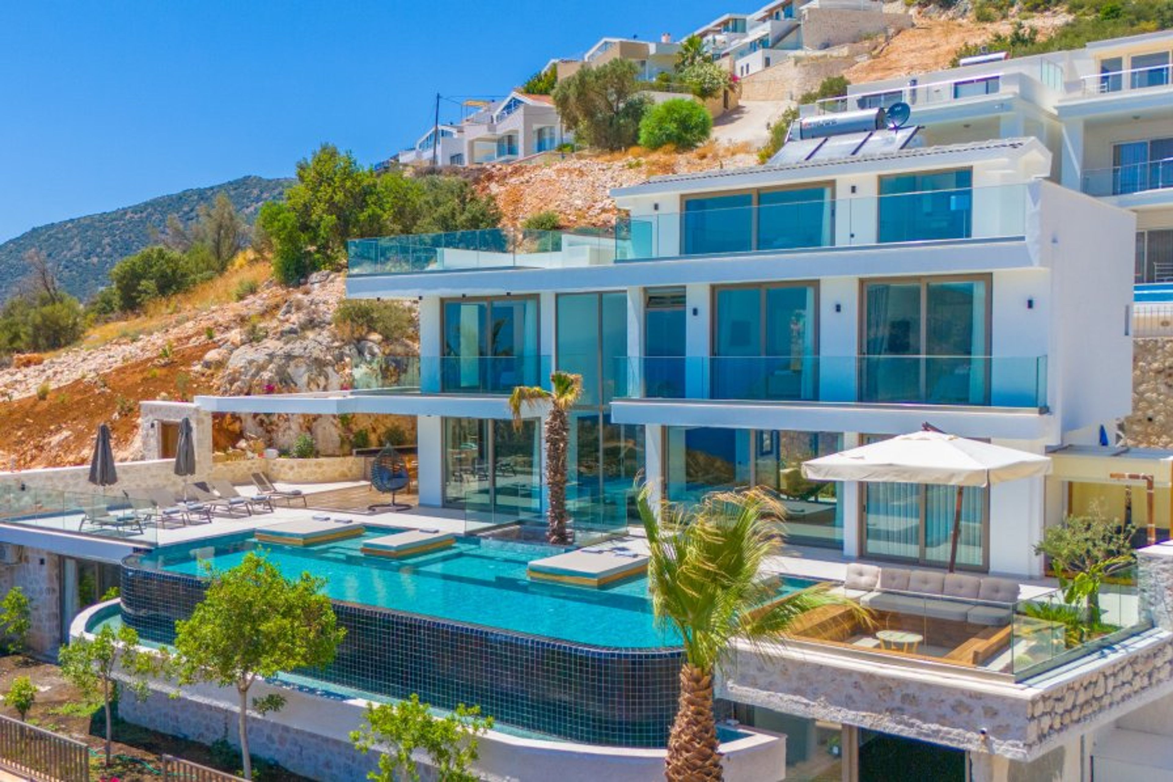 Our Villa is located in the center of Kalkan and is a new, spacious villa with six bedrooms and two private swimming pools (both optionally heated for an additional fee).