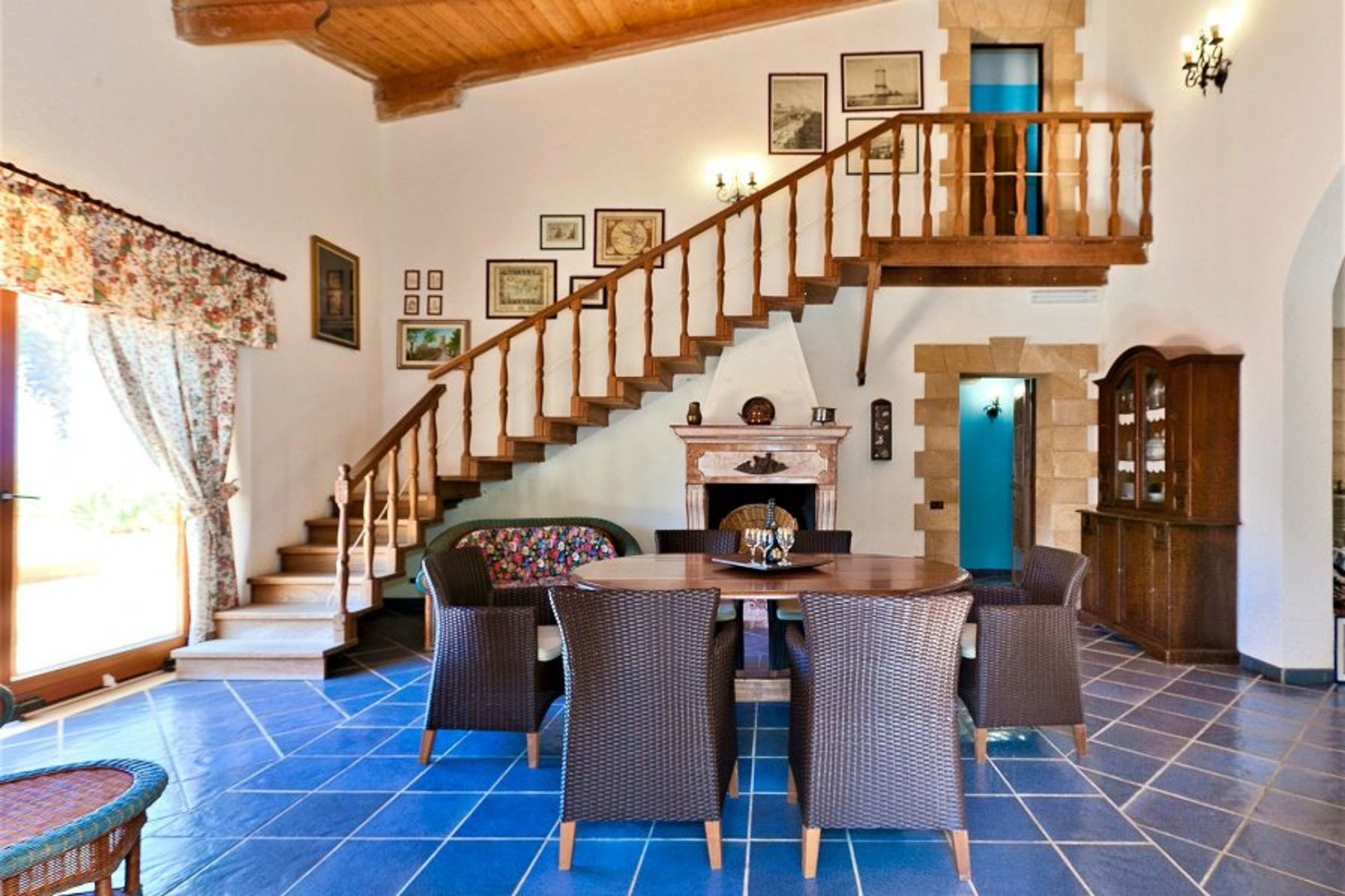Villa Le Palme has several verandas that give the guests the opportunity to live the outside spaces comfortably and in total privacy. The house may be accessed from an open plan living room characterized by large windows that lead directly to the verandas and swimming pool. The living room is characterised by an elegant fireplace and a wooden staircase that leads to the upper floor. The kitchen, located in a corner of the living, is functional and equipped with all the necessary. Near this room there is a little pantry. From the kitchen it is possible to reach a further veranda equipped with an external kitchen, barbeque and wood stove.
