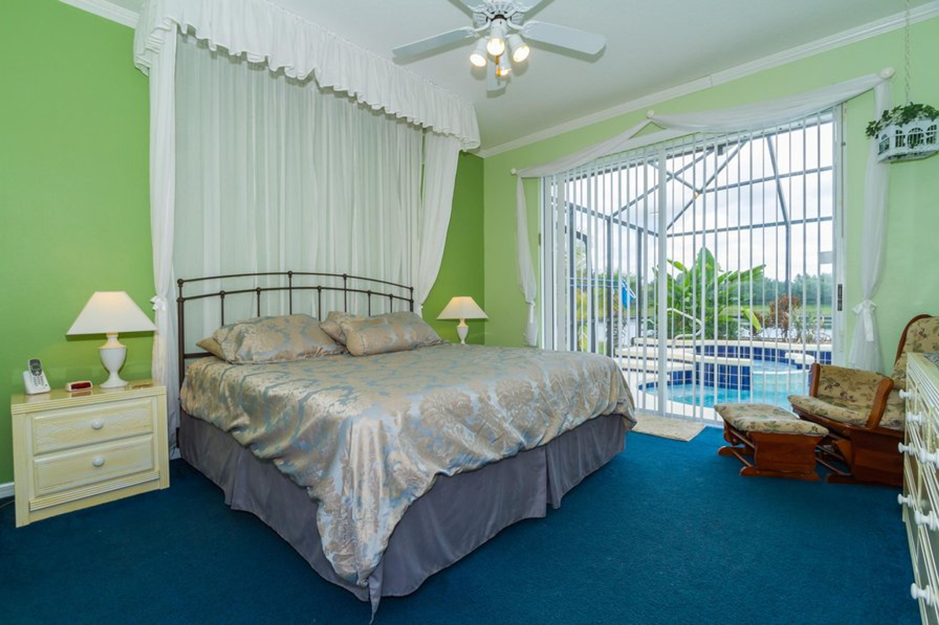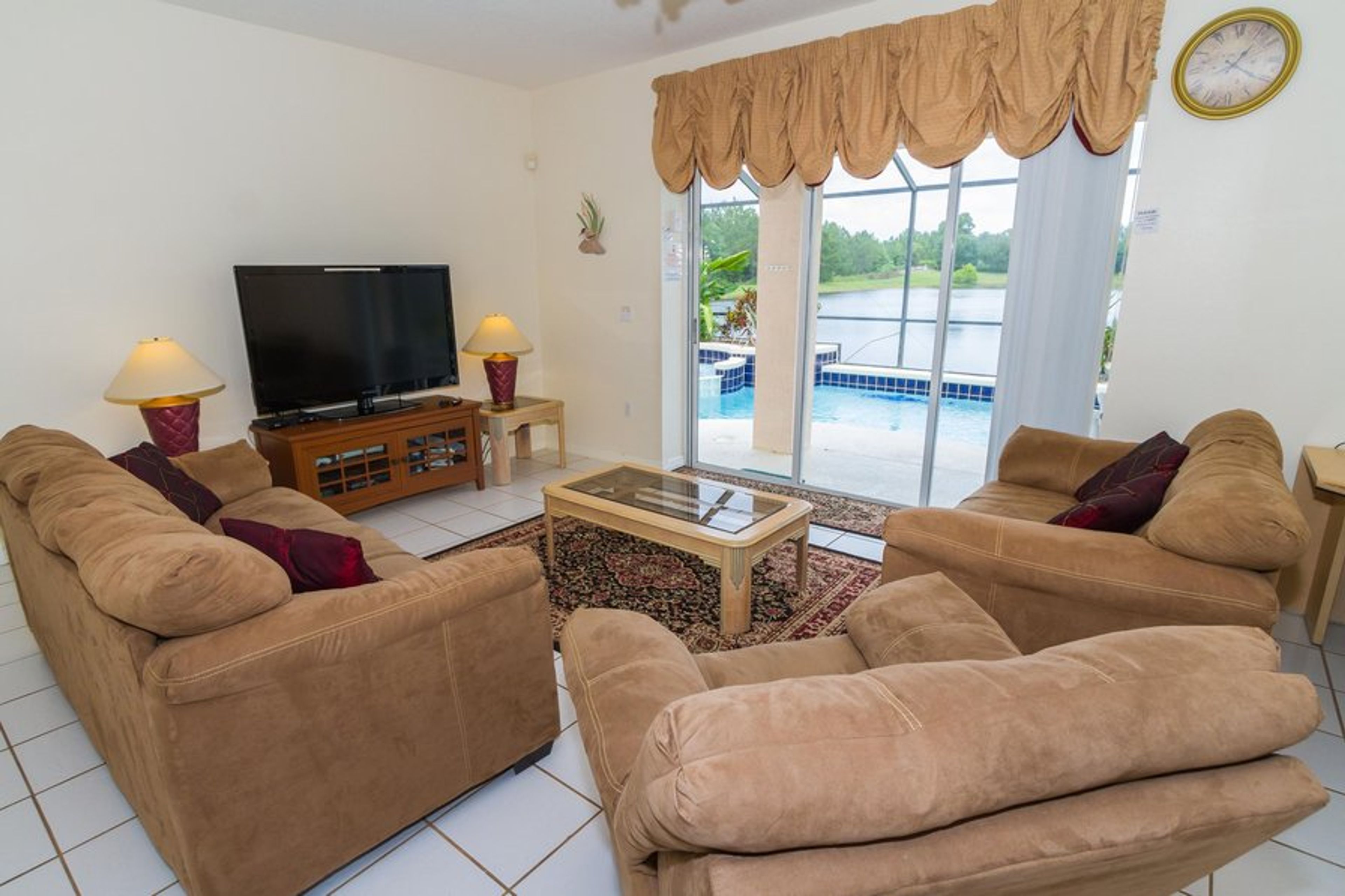 Large, bright open-plan Florida style lounge/diner overlooking pool and lake. A 65 inch LCD TV (with cable), Blu-ray Player, VCR with a selection of videos. Music system with a selection of CDs and tapes and access to Wi-Fi.