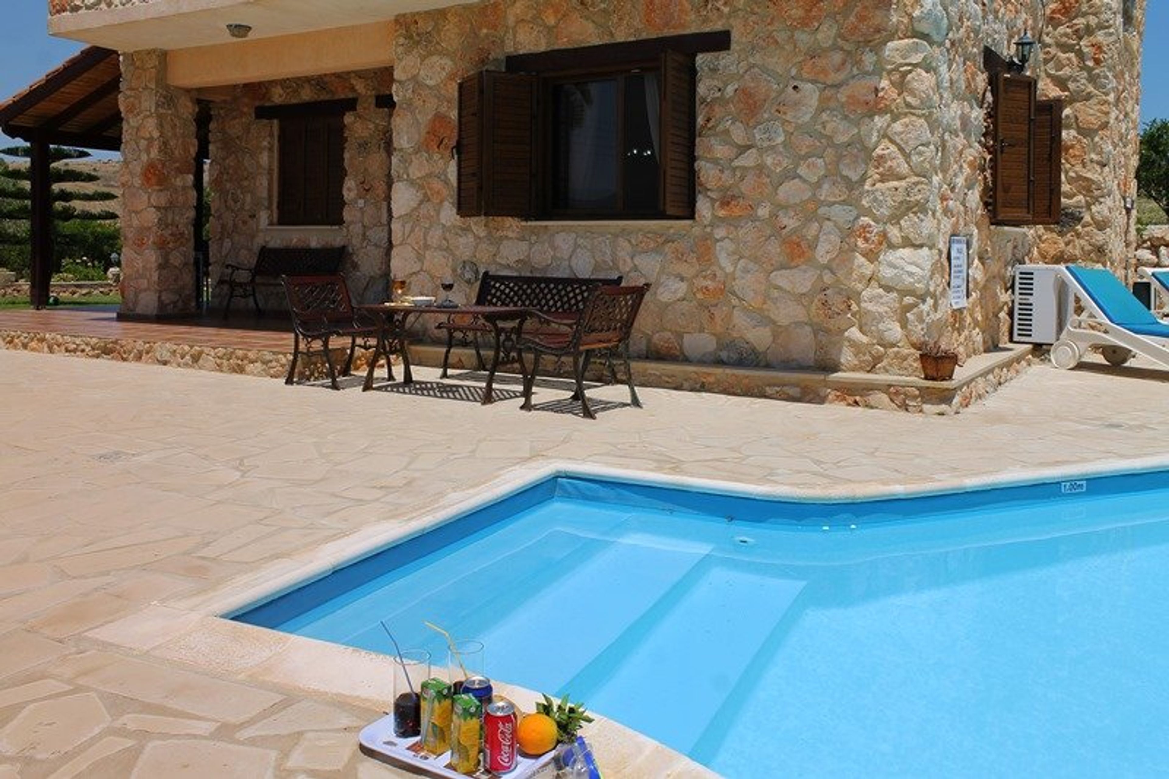 'The Retreat Villa' is situated in the pretty village area of Peristerona near Polis in Paphos District. Accessed by private driveway (between the fruit orchards) into the extensive and secluded private grounds, this impressive stone built detached villa has everything you need to enjoy a relaxing holiday in the Cyprus sunshine. It has 4 bedrooms (en-suite to master with Jacuzzi shower) and sleeps 8. It has a 12m x 6m private swimming pool with roman steps, full air-conditioning, Large Flat Screen TV with IPTV & DVD (TV's in all bedrooms also), washing machine, dishwasher, large stone built BBQ with adjacent table to seat 8, a circular shaded bar area, Jacuzzi Bath in main bathroom and much more.