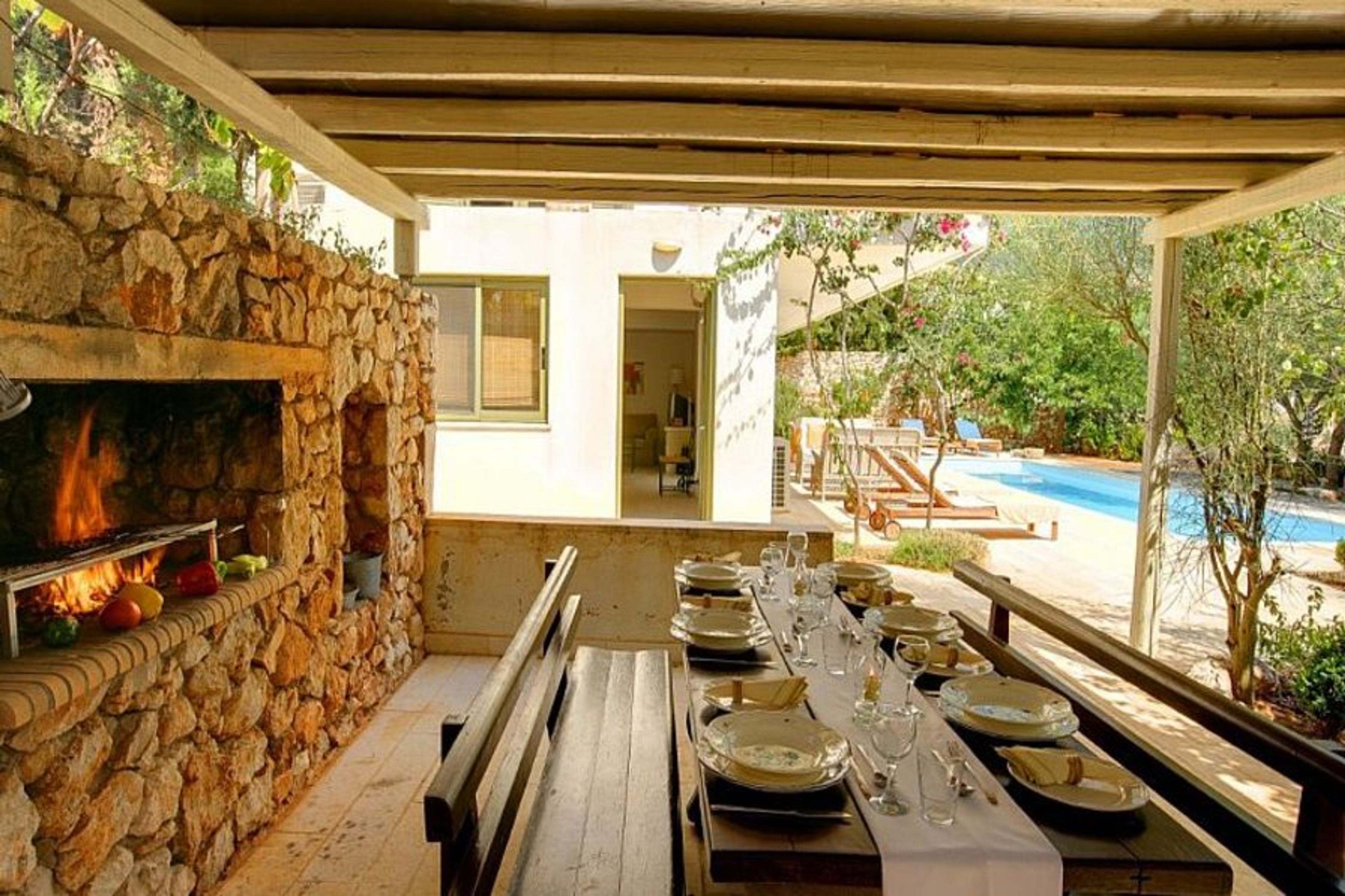 A marble staircase takes you to the lower ground floor where there is a living room, kitchen and dining area with doors to the garden and the poolside. The front of the kitchen leads to an outdoor shaded dining area, with a wooden table and benches. A third bathroom is located on this floor. The third bedroom next to the living room has a sliding door opening to the garden and the pool area.