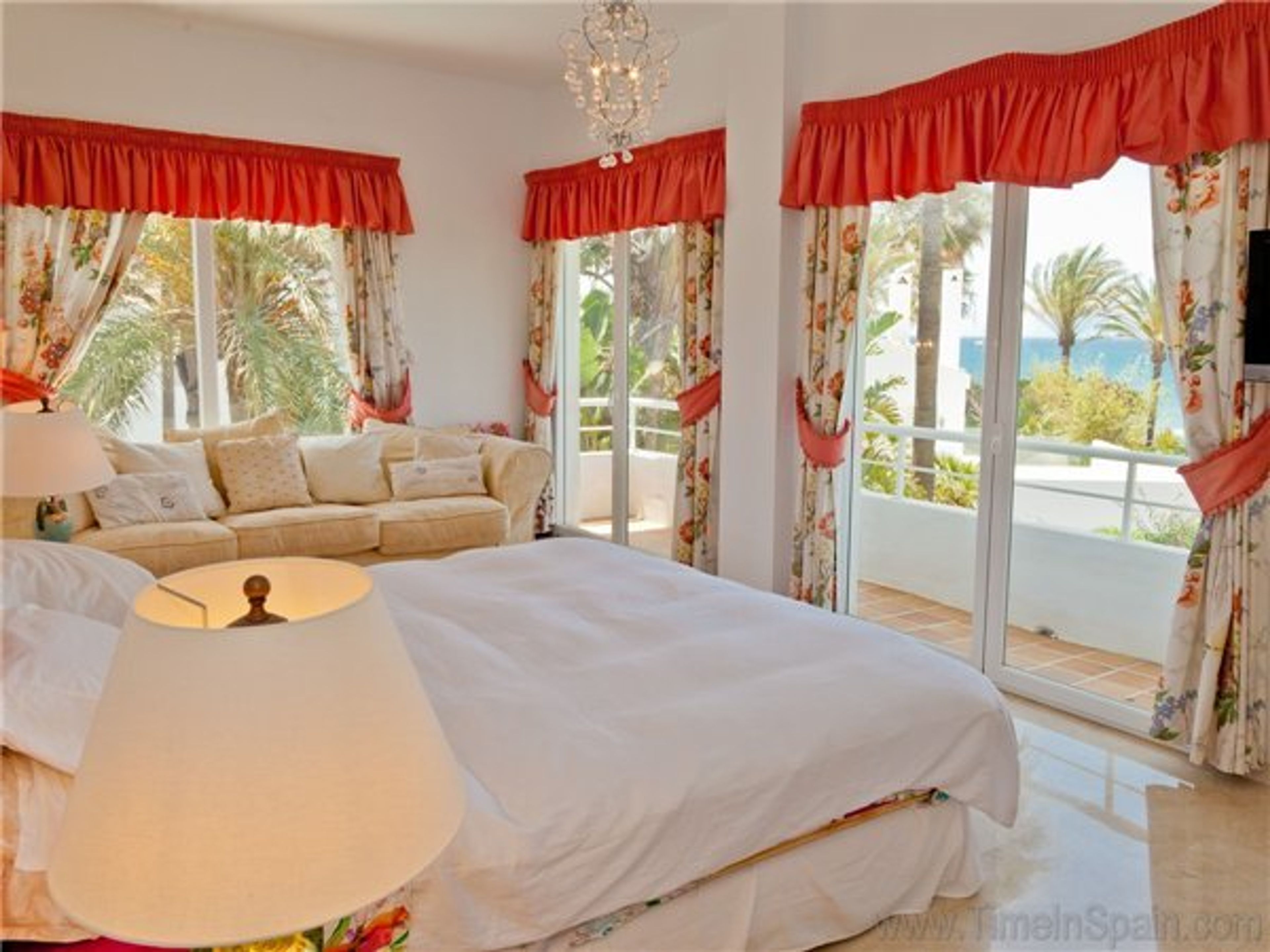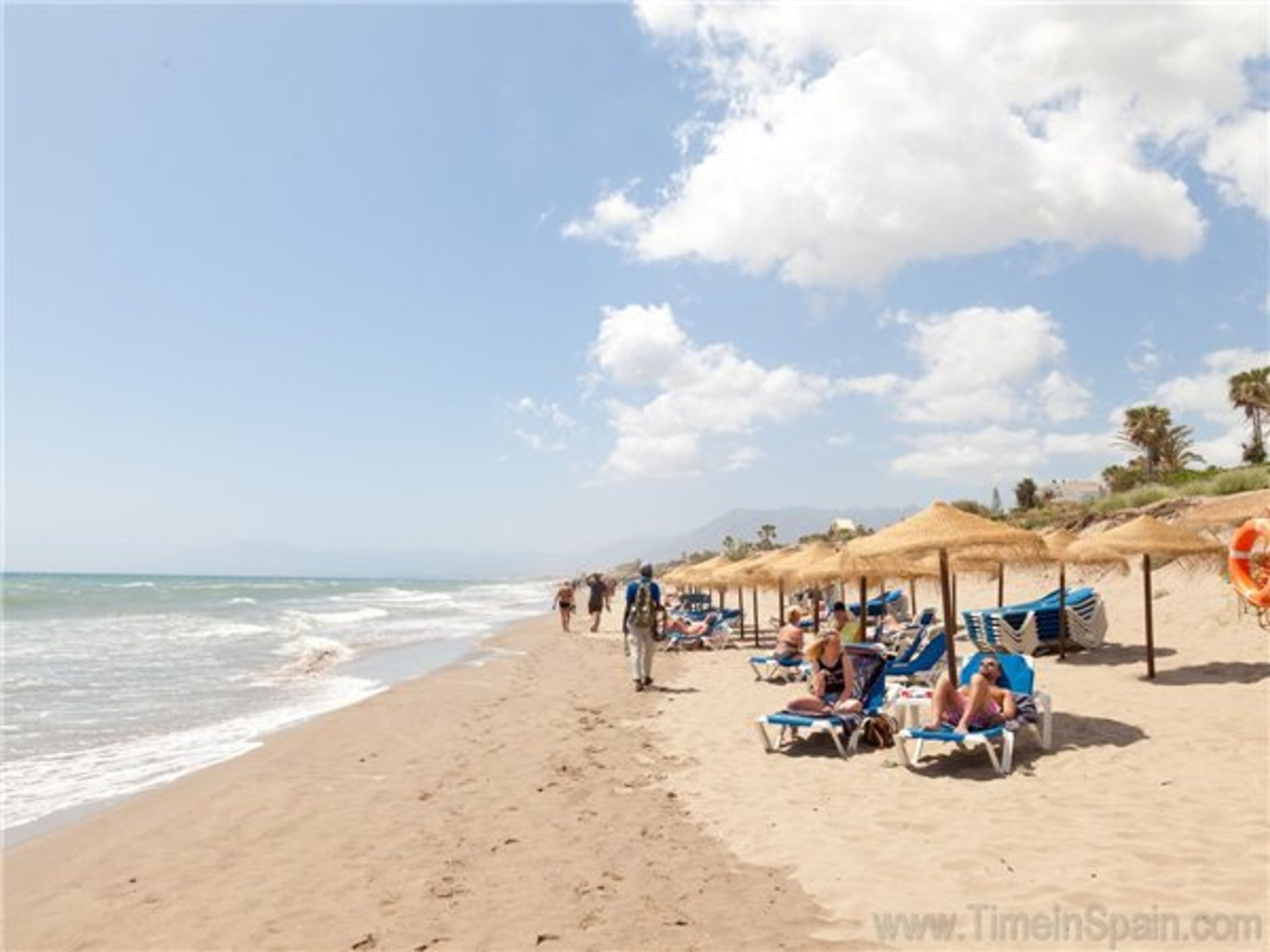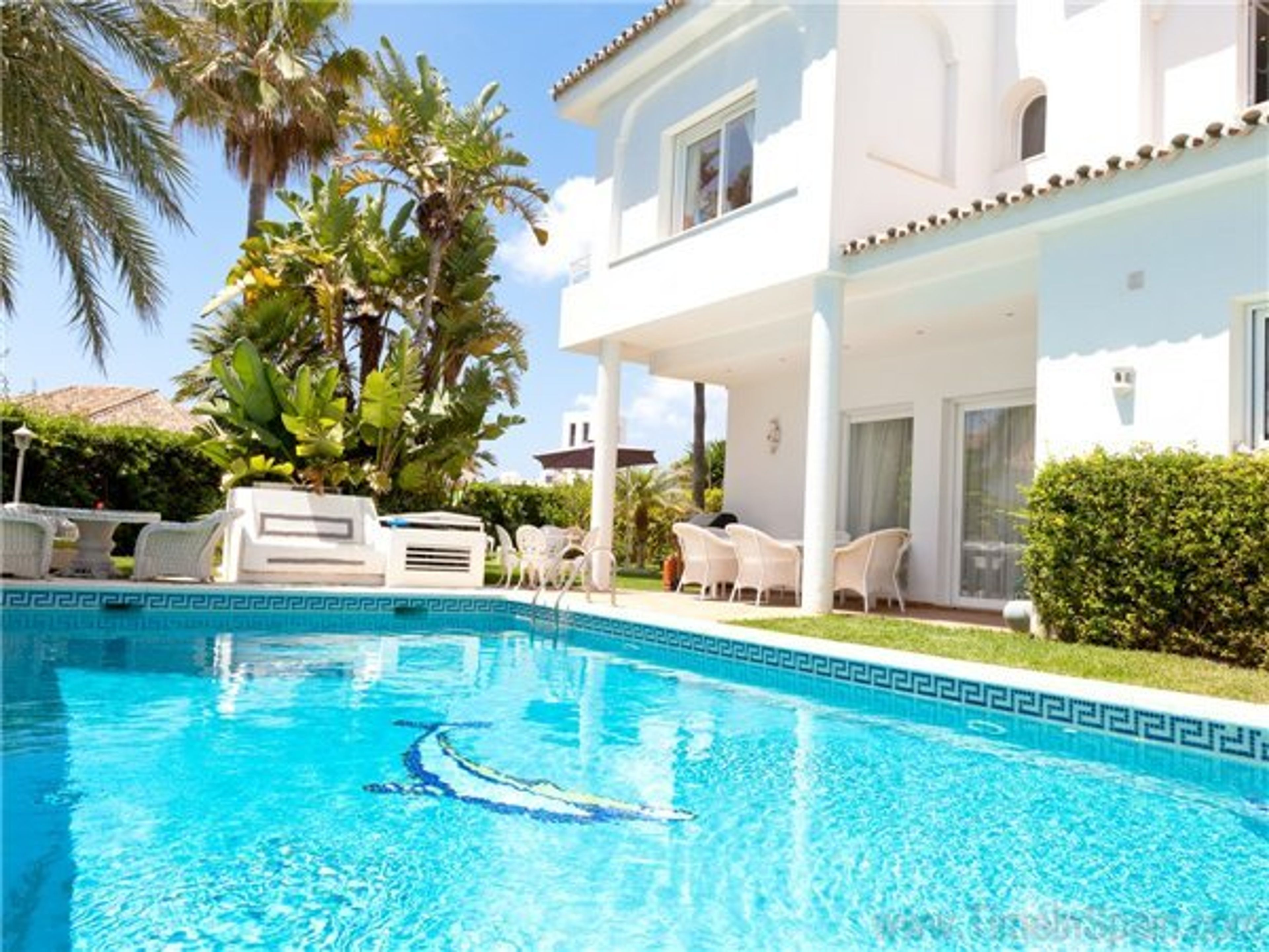 This luxury holiday villa with sea views really does have everything you need for the perfect family holiday. The villa has a private fenced pool and is also located within a high quality urbanisation right next to the beach. The urbanisation provides lovely walkways with a great adult and children's pool next to a bar and restaurant. Further to this, you are right next to the best beaches in Marbella/Elviria where there are water sports and rock-free sea entry. The famous Nikki beach club is also located here together with the Marriott Marbella Beach Club. There are restaurants, bars etc all on your doorstep. The airport is 30 minutes away. This villa truly is the perfect place for a large family group to take a great holiday on the Costa del Sol. What more could you want ? This colonial style beach house is perfect for families and large groups of up to ten people. It is spacious and comfortable. The kitchen is fully equipped. The lounge is comfortable and has the full Sky TV package enabled for all the movies and sports channels along with several other international channels. There is also a high speed fibre optic Internet access point with WIFI and a safe is available in the property. The indoor dining area provides dining for eight people. There is a further lounge off the hallway with a further Sky TV system again with the full package enabled. Upstairs on the first floor there are three bedrooms including the master bedroom which has its own outside terrace with spectacular sea views. Upstairs to the top level, there is a further twin room with a nice bathroom. Passing through this room you will get to a double bedroom area. Note that there is no actual door that cuts off the double bedroom area from the twin bedroom area. This would be a good place for children who like to be close to the parents. You have spectacular seaviews from here as well. Going outside from the lounge you pass out onto a terraced area next to the fenced pool. Here there is a dining area for up to 10 people plus a relaxing comfortable seating area for up to eight people. There is also a gas barbeque. To the side of the house is the main garden which is mainly grass and some Mediterranean plants. Outside the front of the villa is parking for a car.