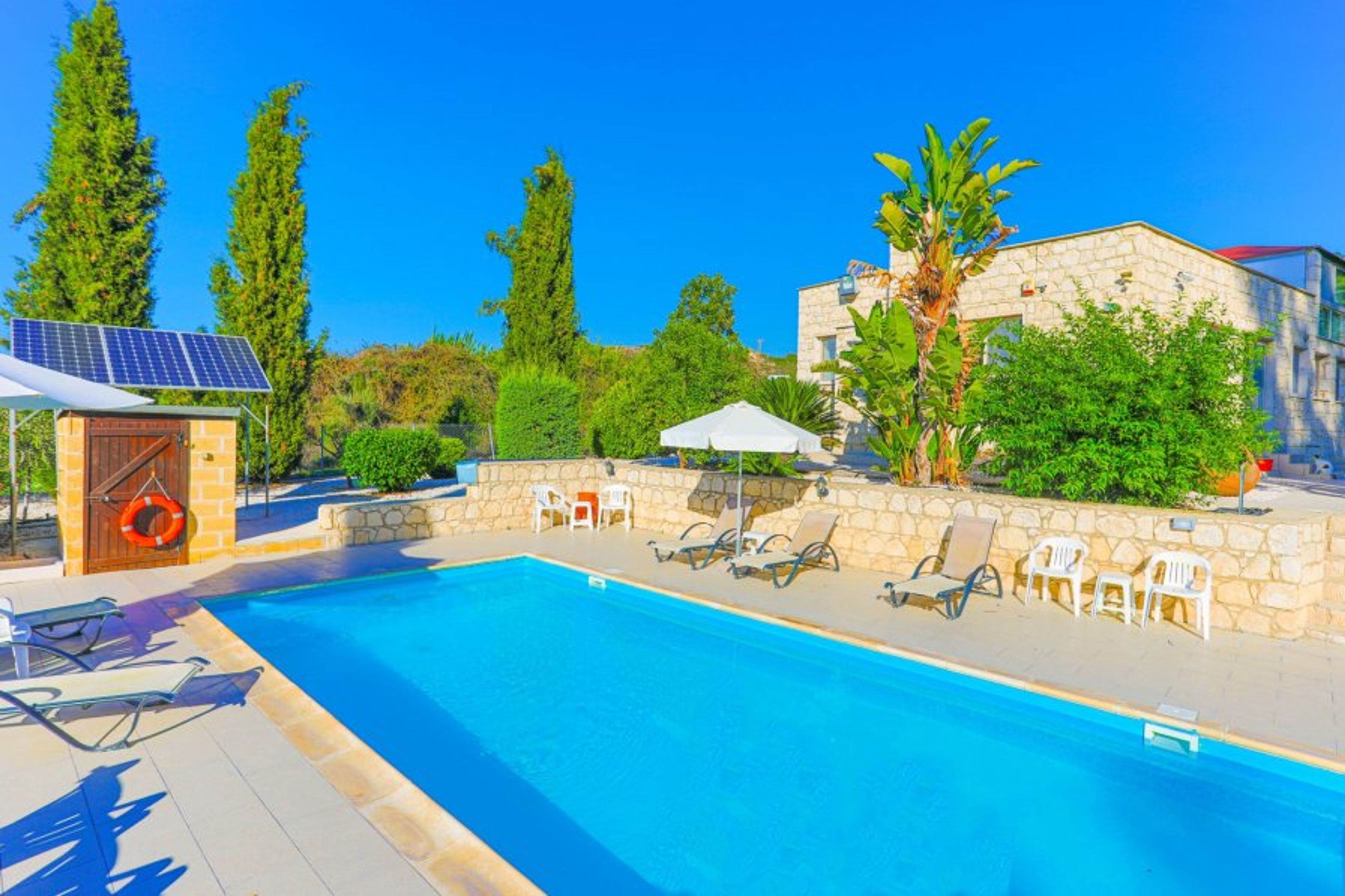 The villa, which is easily accessed from the B7 between Paphos and Polis, is situated just 5km from the town of Polis and all its amenities and only 7km from Latchi which offers the best beaches & watersports in the Paphos district as well as a pretty marina where you can relax and enjoy the day’s catch whilst having a glass or 2 of your favourite tipple. Accessed by private driveway (between the fruit orchards) into the extensive and secluded private grounds, this impressive single storey stone built detached villa has everything you need to enjoy a relaxing holiday in the Cyprus sunshine.