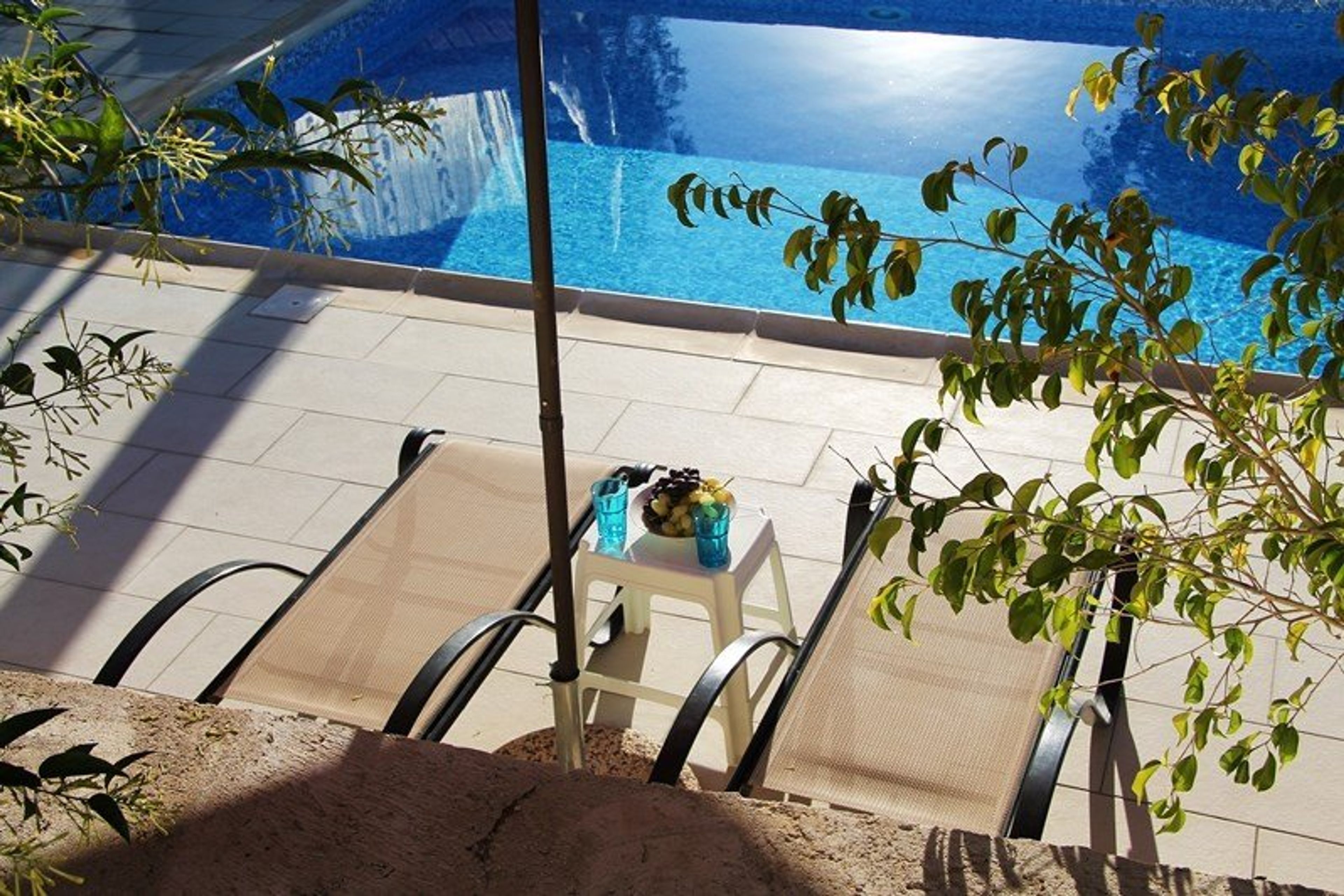 The spacious pool terrace is nicely equipped with 8 sun loungers, 2 parasols and drinks tables as well as a choice of casual seating. The large stone built BBQ with table and chairs, sits at the end making it the perfect place for alfresco dining and socialising with your party on holiday.
