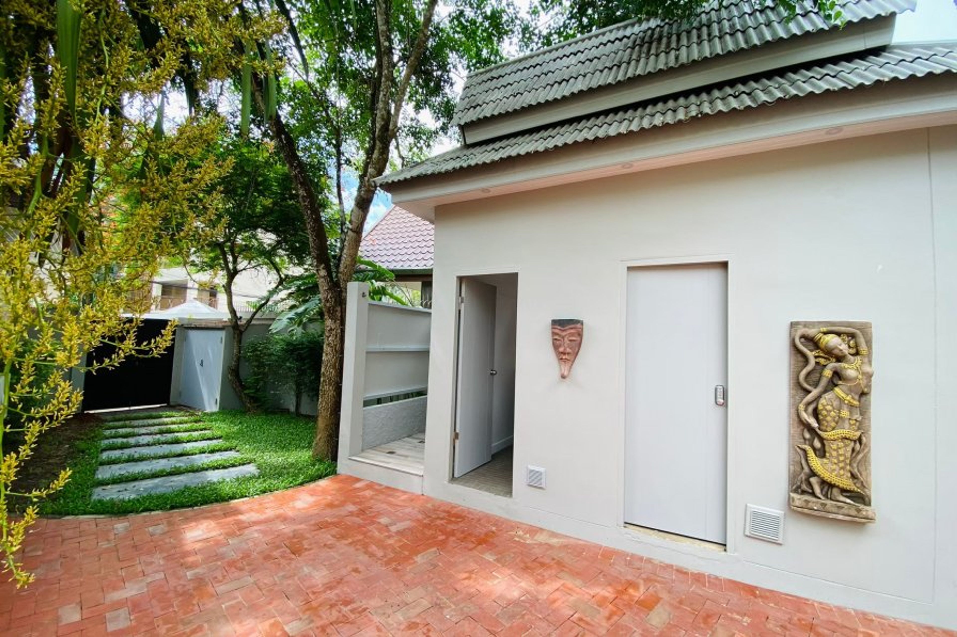 Flawlessly hidden behind high walls, Baan ManuChang is a relaxing and private getaway. The rental property is remarkably furnished in contemporary Oriental style with dark wood and vibrant accent colors and is surrounded by a beautiful exotic backyard garden.