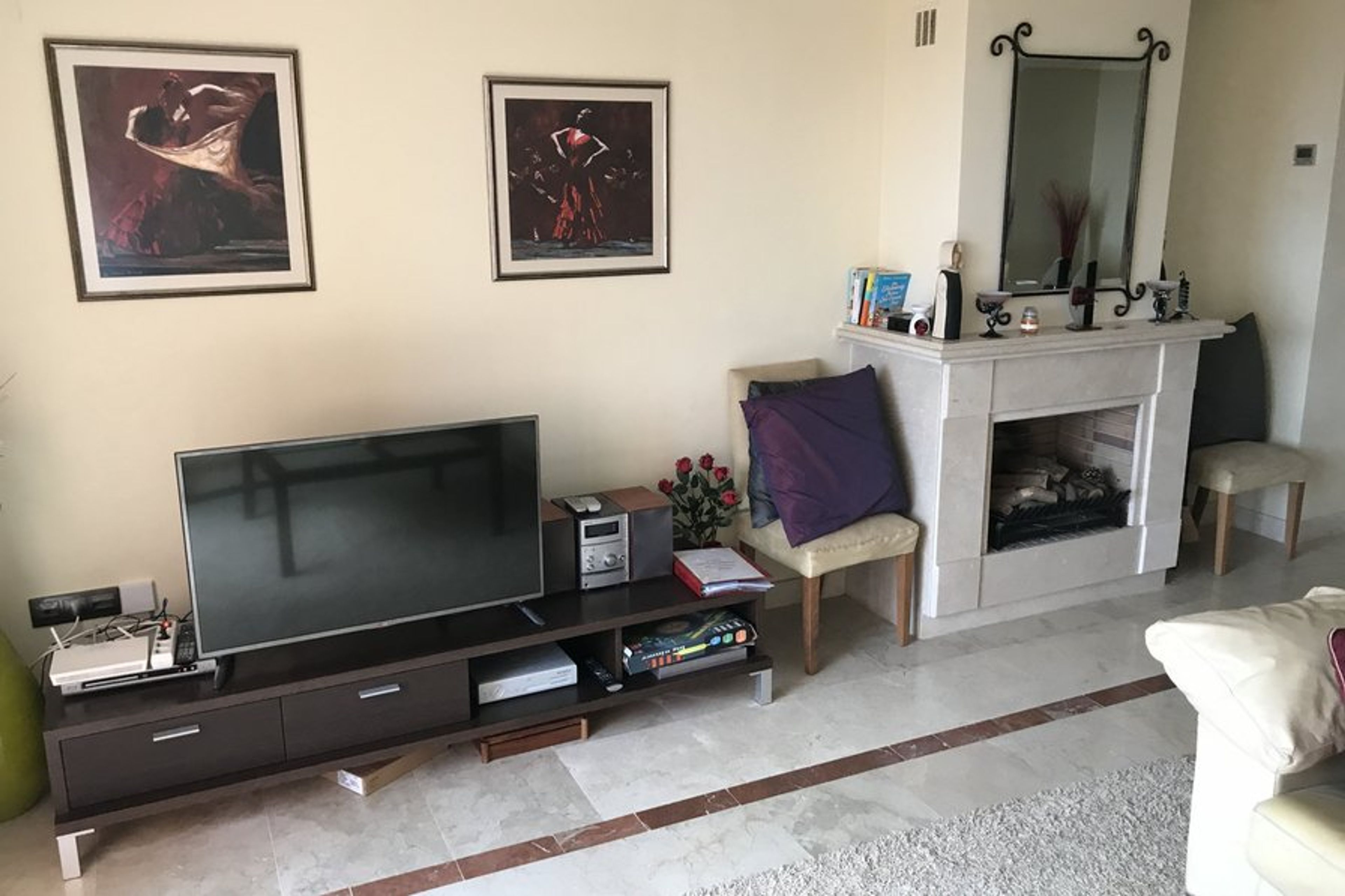 The apartment is fully air-conditioned, set on two floors with the master bedroom complete with marble fireplace and galleried ceiling, occupying the top floor. The living area is spacious and light and furnished in a high quality contemporary style. There is wifi, a Smart tv, stereo, DVD and UK satellite channels. There is a fully fitted and equipped kitchen with ceramic hob, oven, microwave, dishwasher, fridge/freezer, and a separate laundry room with washing machine/tumble dryer. The bedrooms have large fitted wardrobes finished in dark natural wood with classic Moorish filigree panelling. The bathrooms are beautifully finished with a hydro massage bath in the master bathroom and separate dressing room.